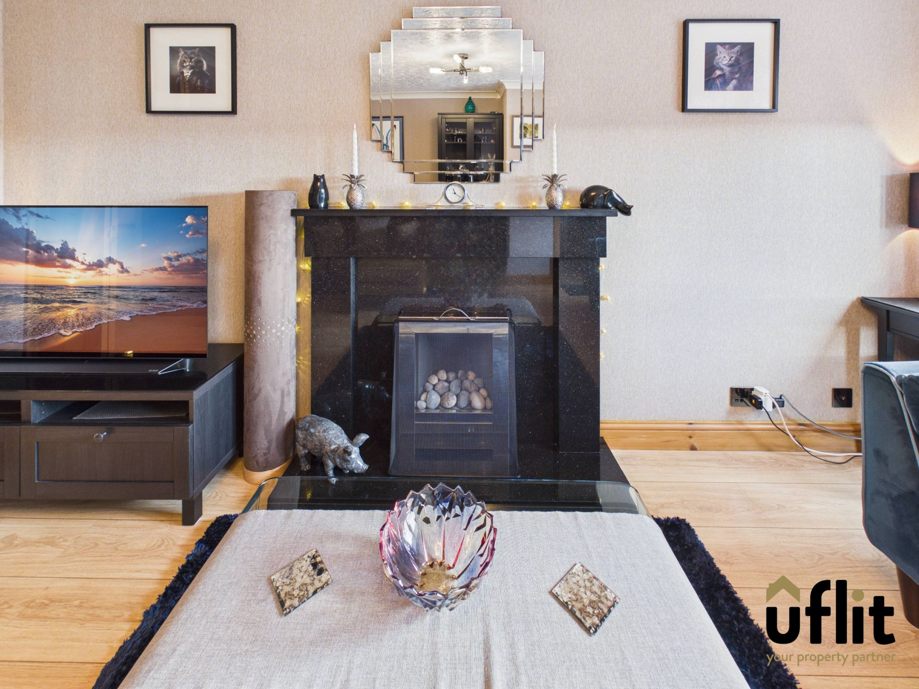 Accessed via double doors from the dining area, the lounge is a bright and comfortable living space finished with wooden flooring. French doors open onto a balcony, allowing additional natural light and offering a pleasant outlook. A granite fireplace with a gas fire creates an attractive focal point within the room, complemented by a tall stand-up radiator.