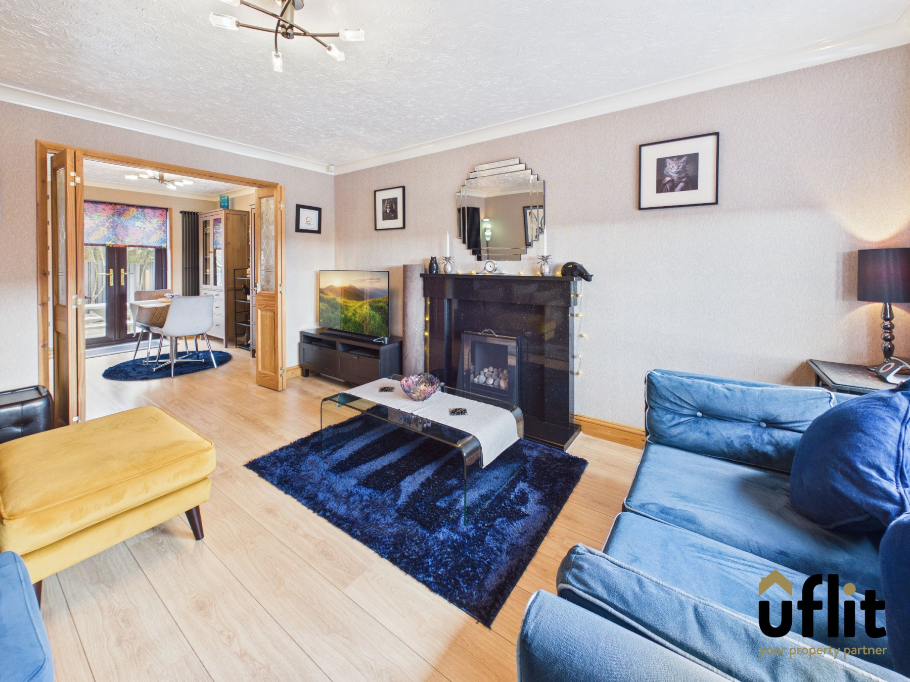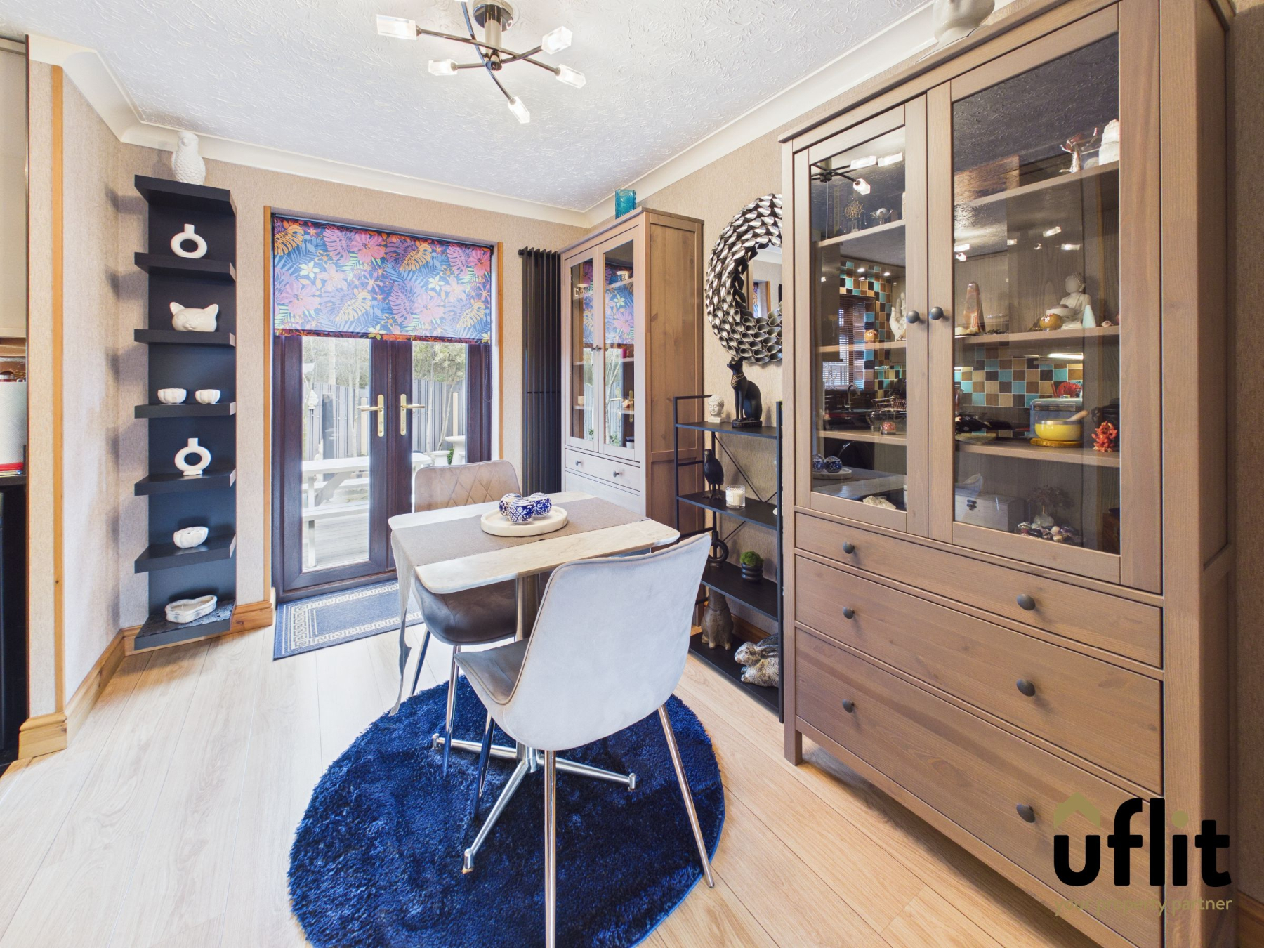 The dining area offers ample space for a table and chairs and is finished with wooden flooring. A tall stand-up radiator adds a modern feature to the space. French doors open out to the rear garden, creating a seamless connection between indoor and outdoor living. Double doors lead directly through to the lounge.