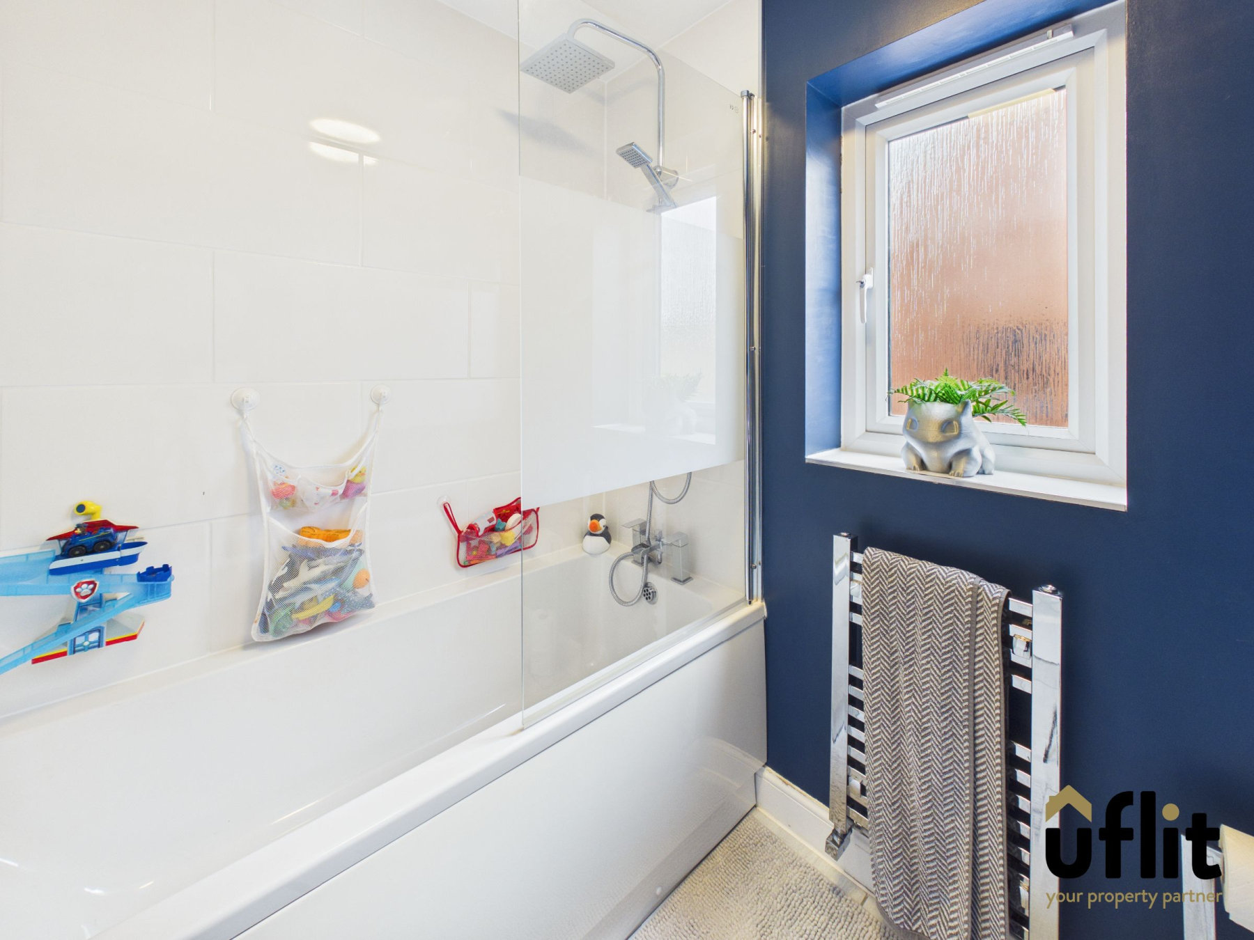 The family bathroom is fitted with tiled flooring and partially tiled walls, comprising a bath with overhead dual shower, a wash basin set within a vanity cupboard and a low-level WC. A side-facing window provides natural light and a towel radiator completes the space.