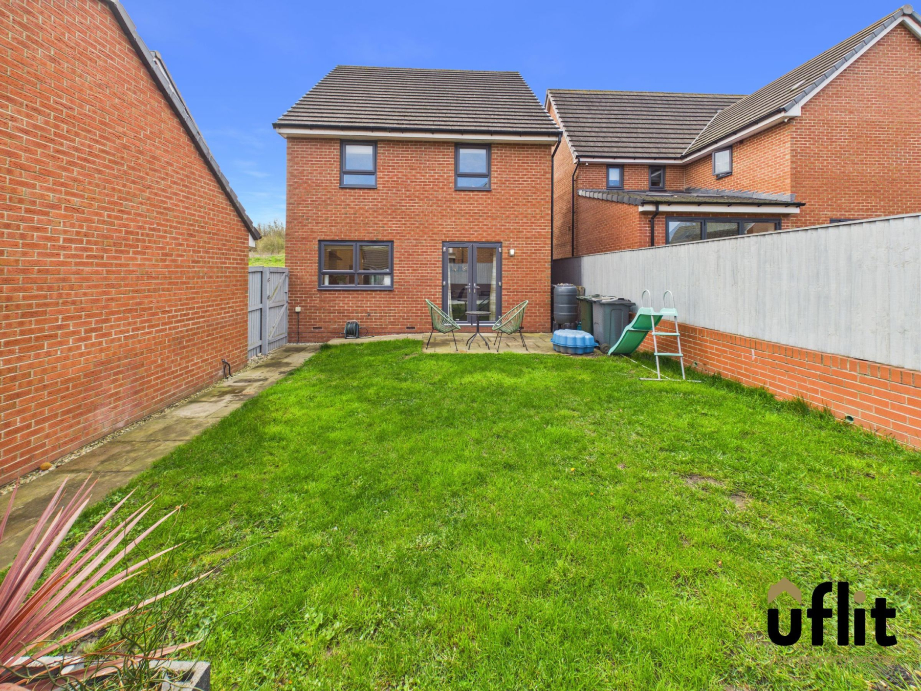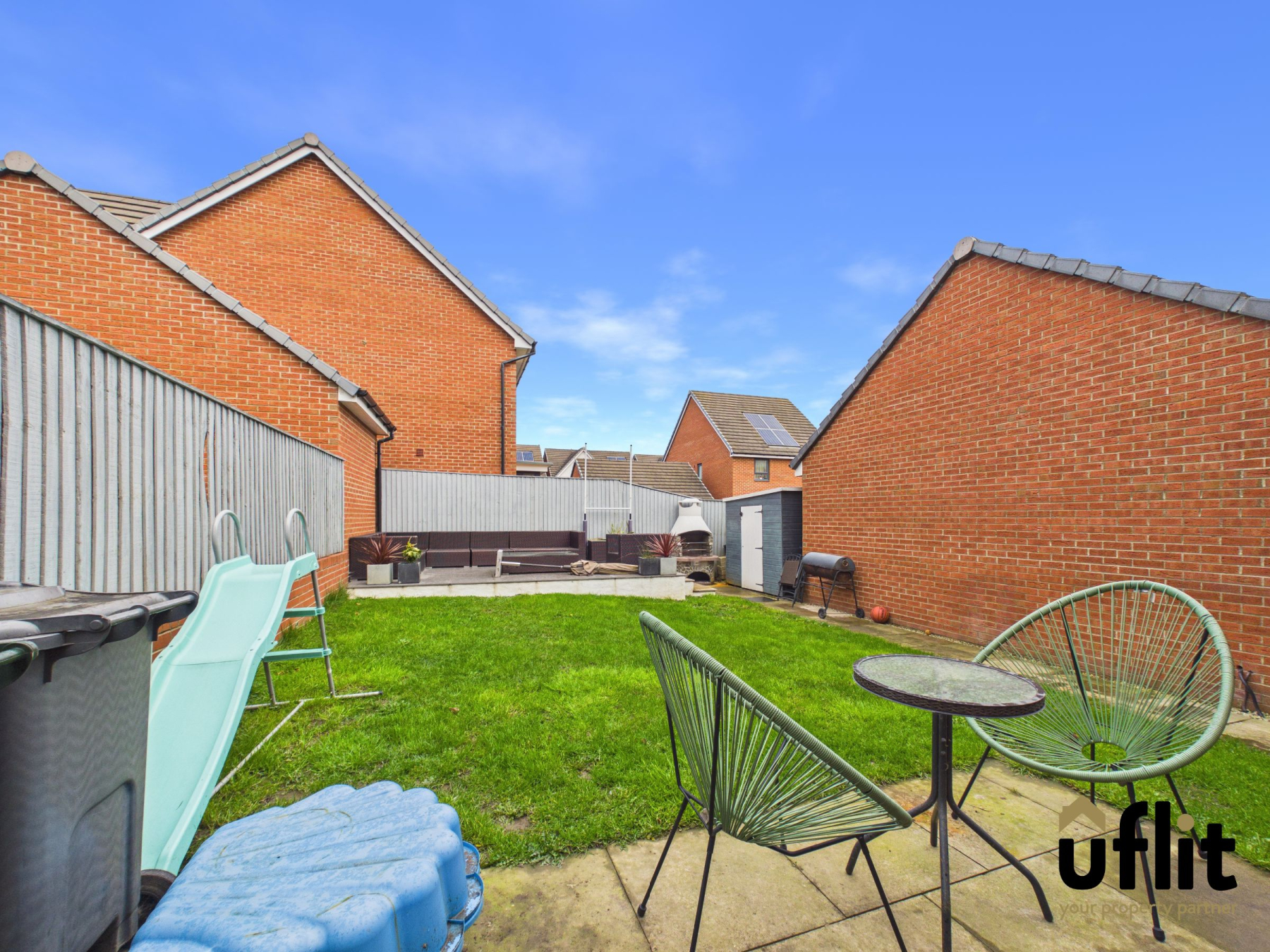 The rear garden is fully enclosed and can be accessed via French doors from the kitchen diner or through a side gate. It features a raised patio area ideal for outdoor seating and entertaining, a lawned garden space and a shed for additional storage, creating a perfect outdoor environment for families.