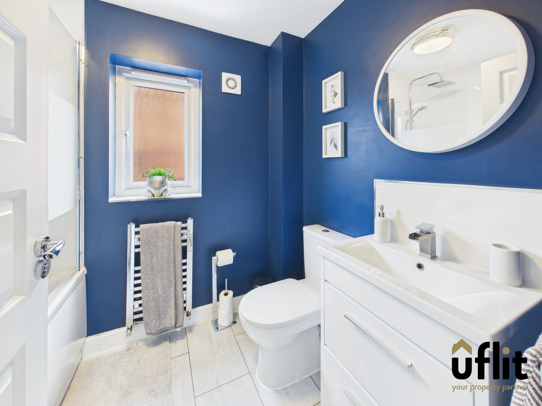 The family bathroom is fitted with a bath and overhead dual shower, wash basin set within a vanity unit and a low-level WC, offering a practical and stylish space for the household.