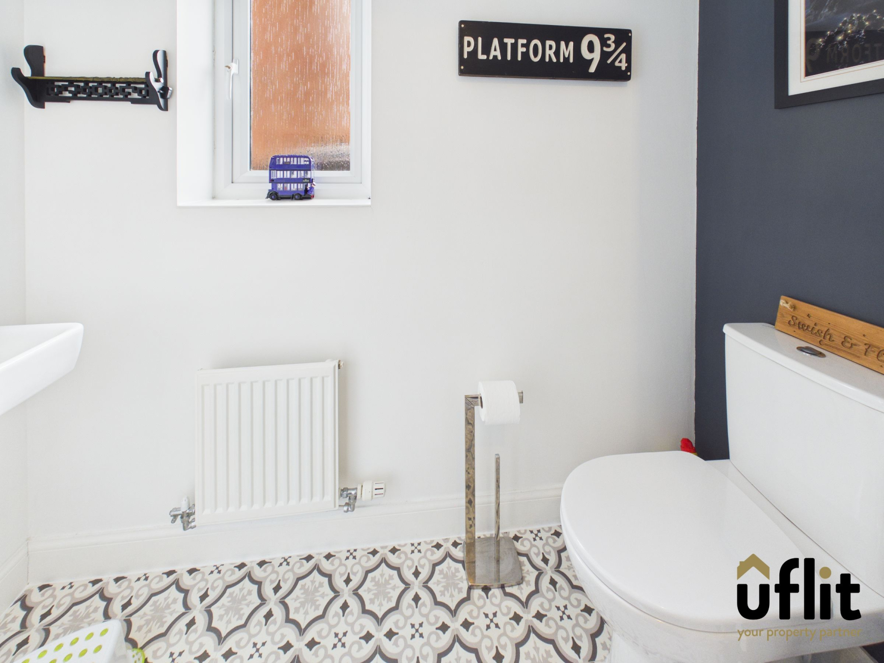 The downstairs WC is neatly positioned off the hallway and comprises a wash basin and low-level WC, with a side-facing window adding natural light.