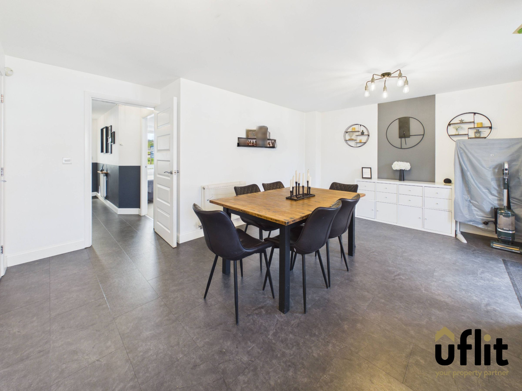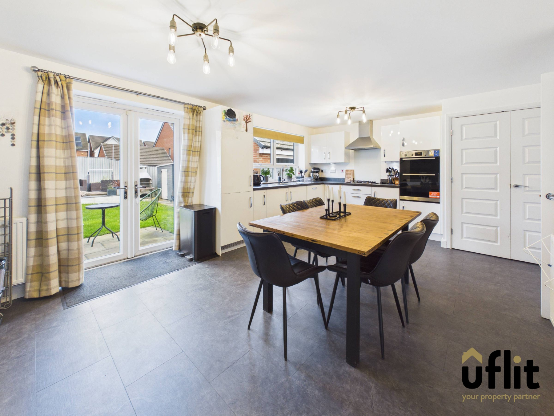A fantastic open-plan kitchen diner fitted with tile-effect laminate flooring and a radiator. The kitchen is well-equipped with a range of integrated appliances including a fridge freezer, dishwasher, double electric oven, gas hob and extractor fan, along with space and plumbing for a washing machine. A window to the rear elevation and French doors provides plenty of light and direct access to the garden, making it a perfect space for both everyday living and entertaining.