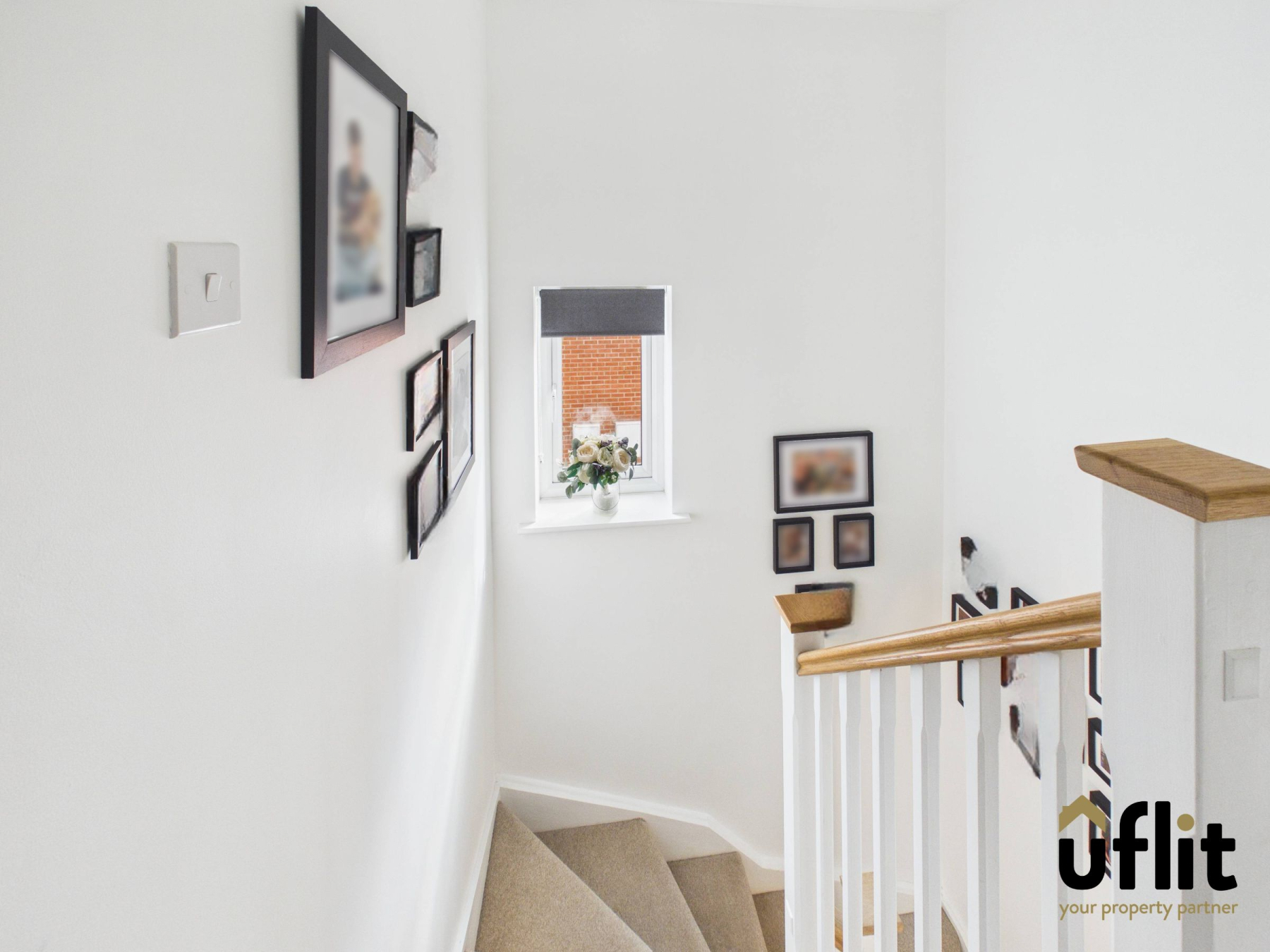 The first-floor landing is accessed via carpeted stairs and benefits from a side-facing window, creating a light and airy feel while providing access to all four bedrooms and the family bathroom.