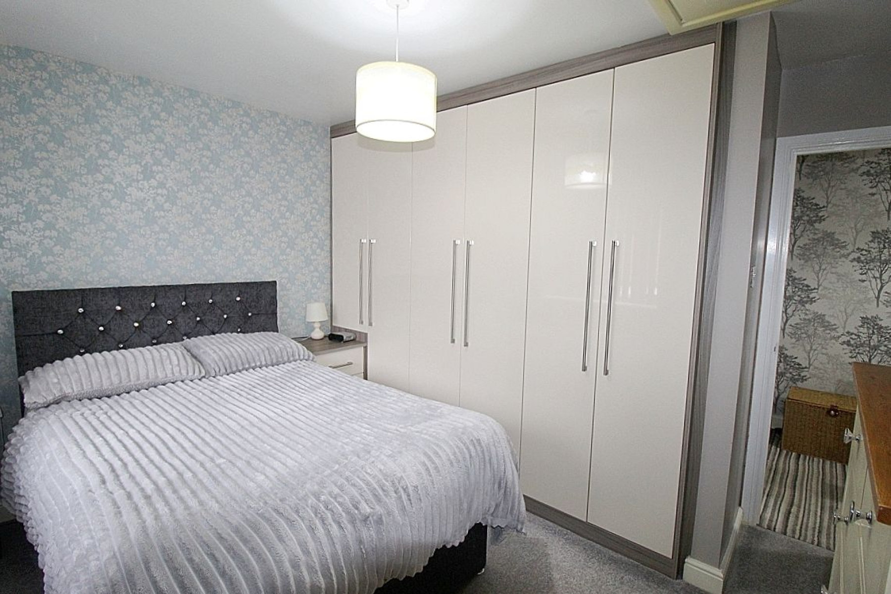 A modern master bedroom with a front facing upvc window, radiator and carpeted flooring. A range of stylish fitted wardrobes and furniture compliment and a door to further over stairs storage.