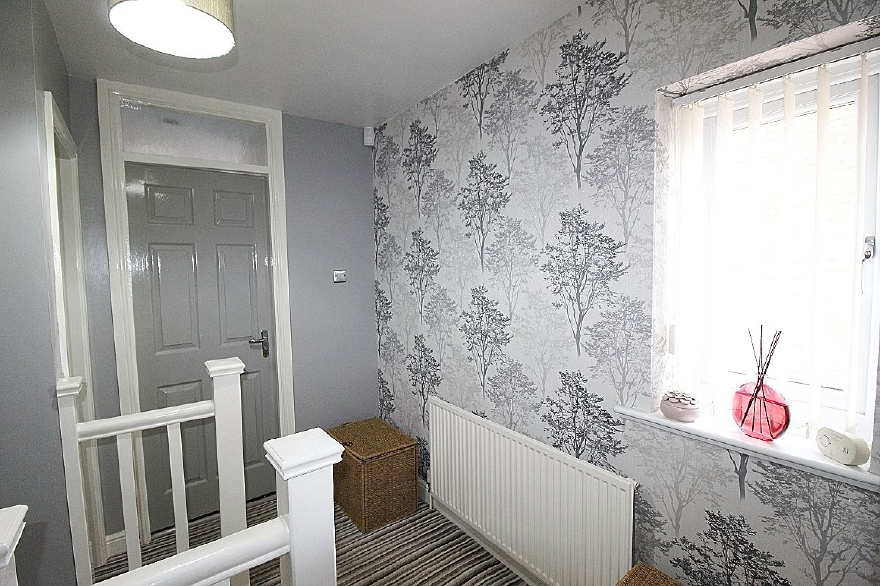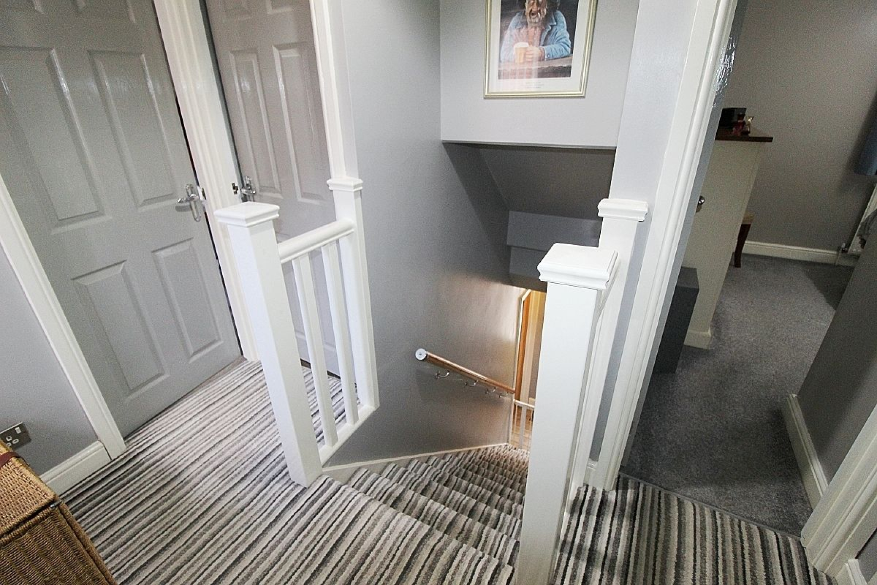 A galleried staircase with spindled bannister rail, carpeted flooring, rear facing upvc window and doors giving access to master bedroom, two further bedrooms and the family bathroom.