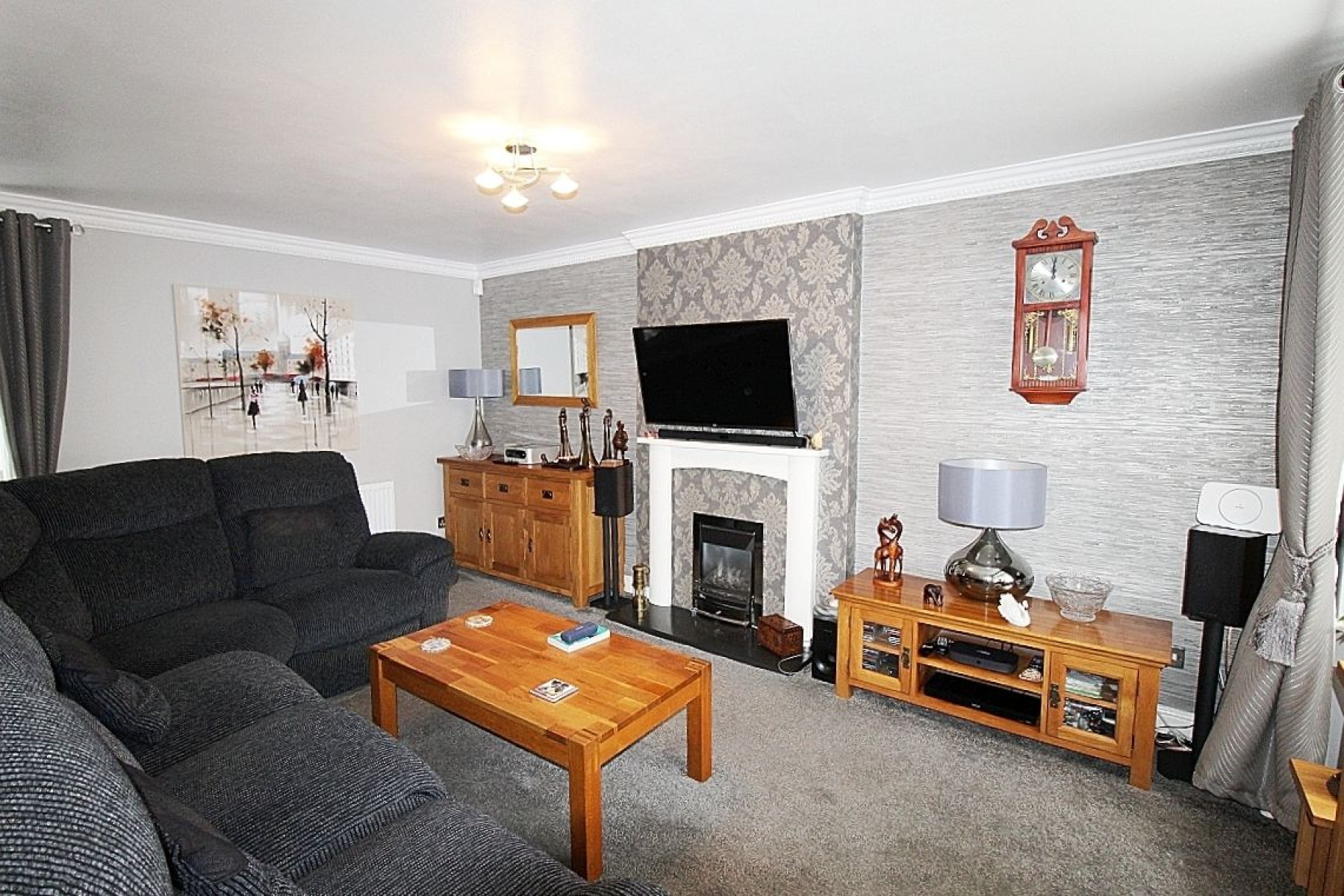 A spacious and modern living area where you eyes are drawn to an attractive fire place adopting a feature wall, a front facing upvc bay window along with a rear facing upvc window allows the light to flow through this space, carpeted flooring, a radiator adds warmth and a large recess under stairs with further storage.