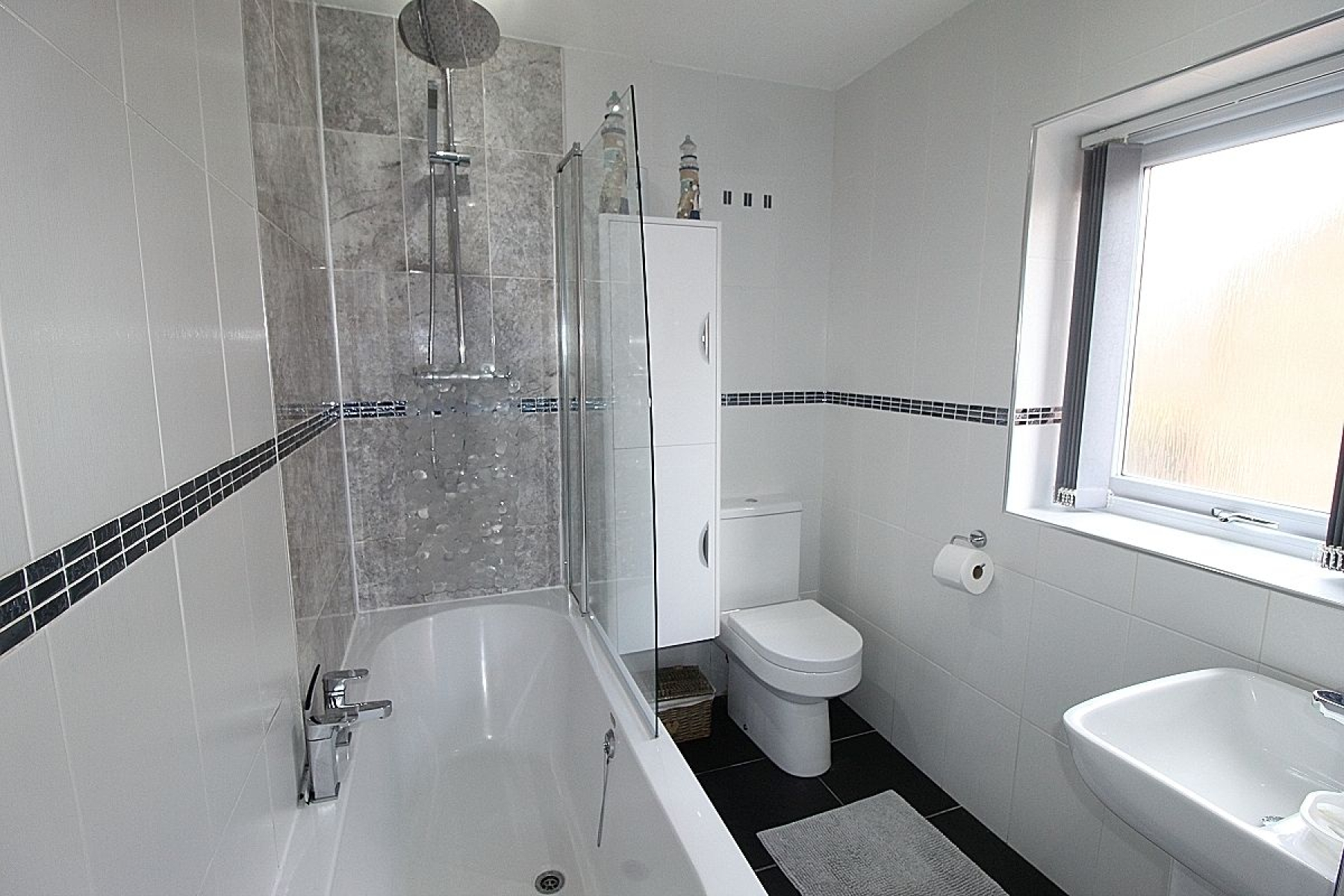 A modern family bathroom comprising of a panelled bath with overhead shower and screen, wash hand basin, low level wc and a complimentary floating wall unit. Fully tiled with feature tiling above the bath, designer heated towel rail, spot lighting, built in storage cupboard and a rear facing upvc window.
