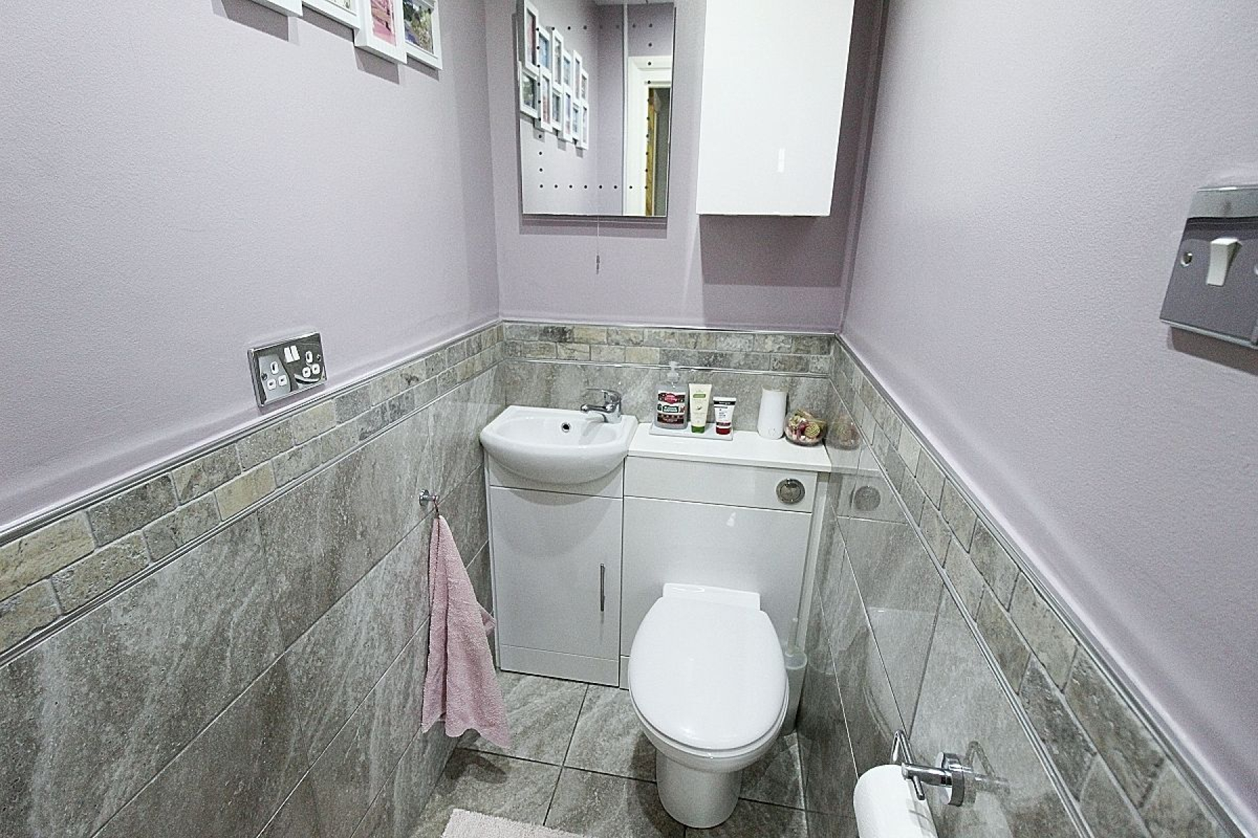 A beautifully presented wc comprising of a vanity unit housing both wc and wash hand basin. Partially tiled walls with complimentary flooring.