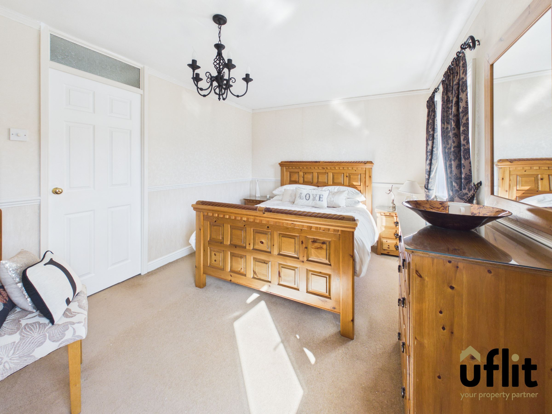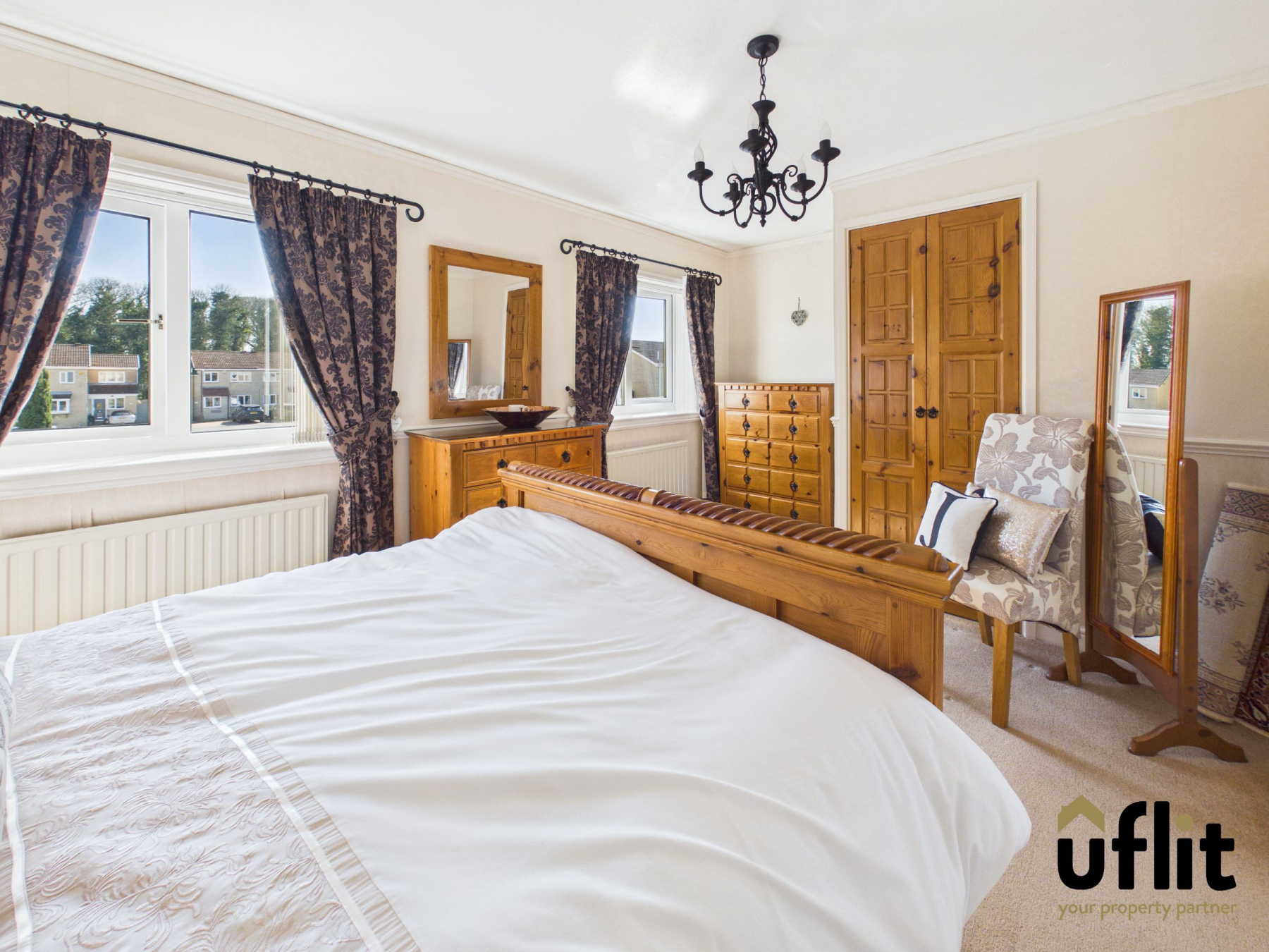 A generously sized double bedroom located to the front of the property, featuring two windows allowing for plenty of natural light. The room is finished with carpeted flooring and includes a radiator, along with the added benefit of a walk-in wardrobe.