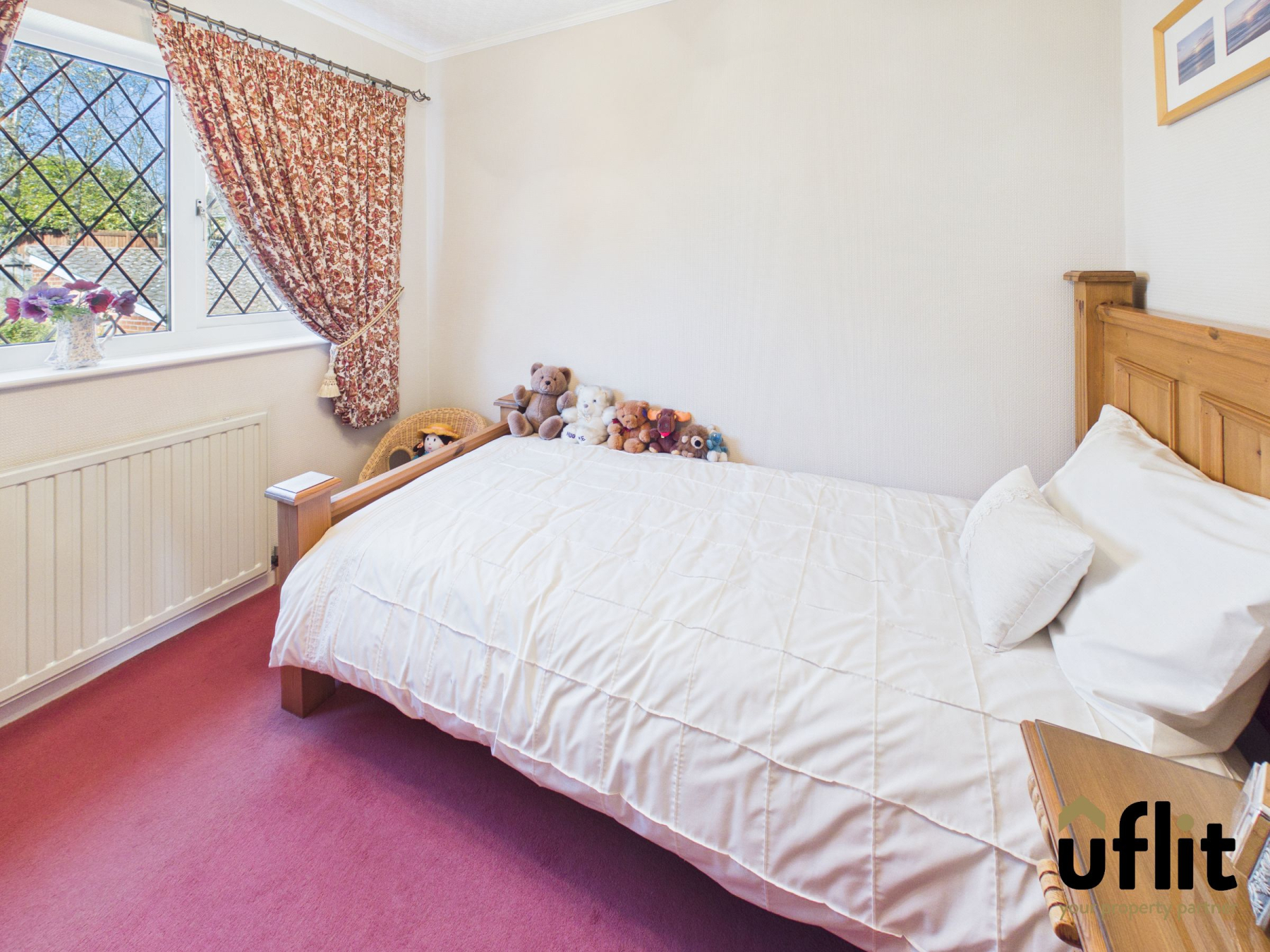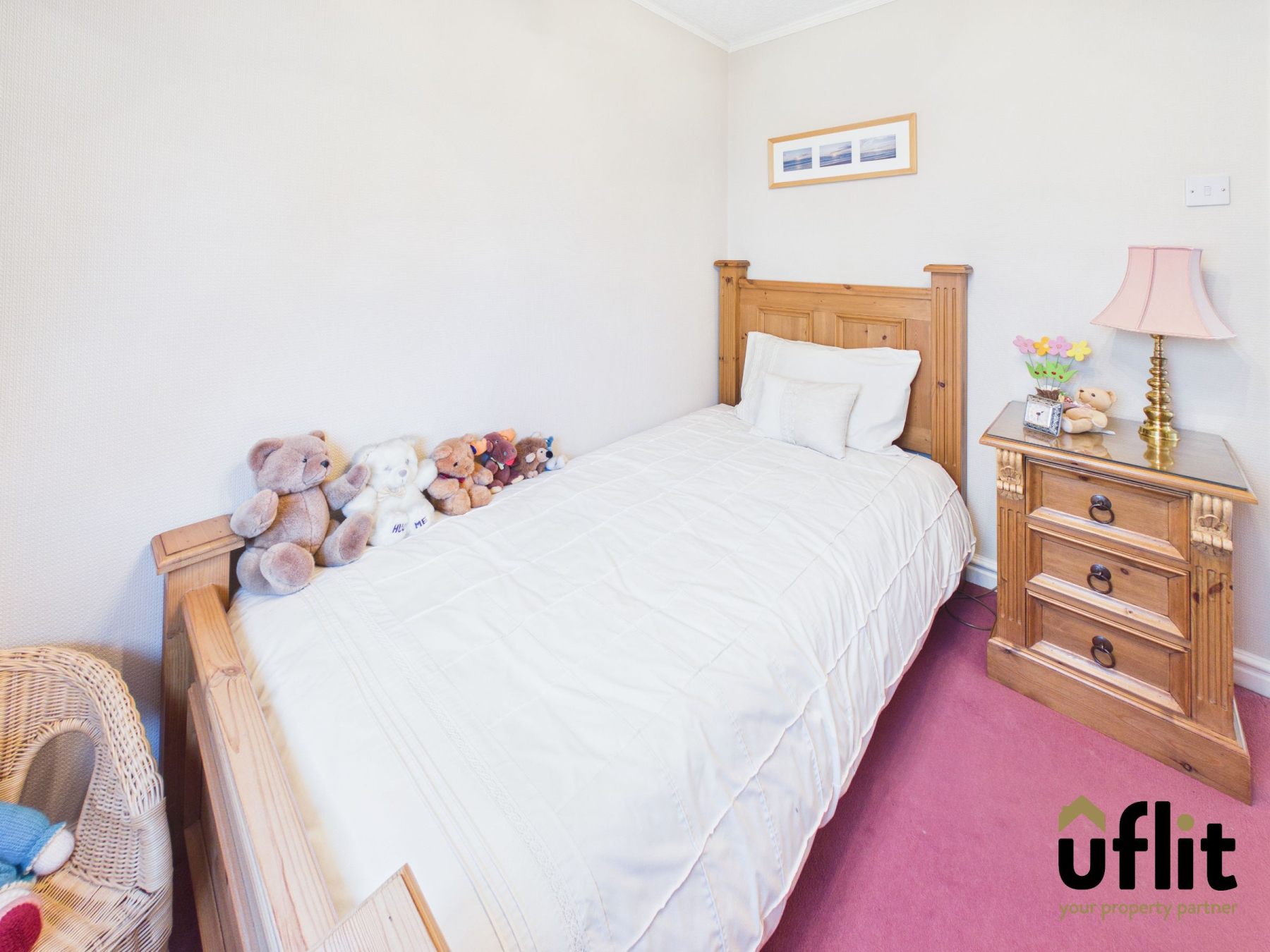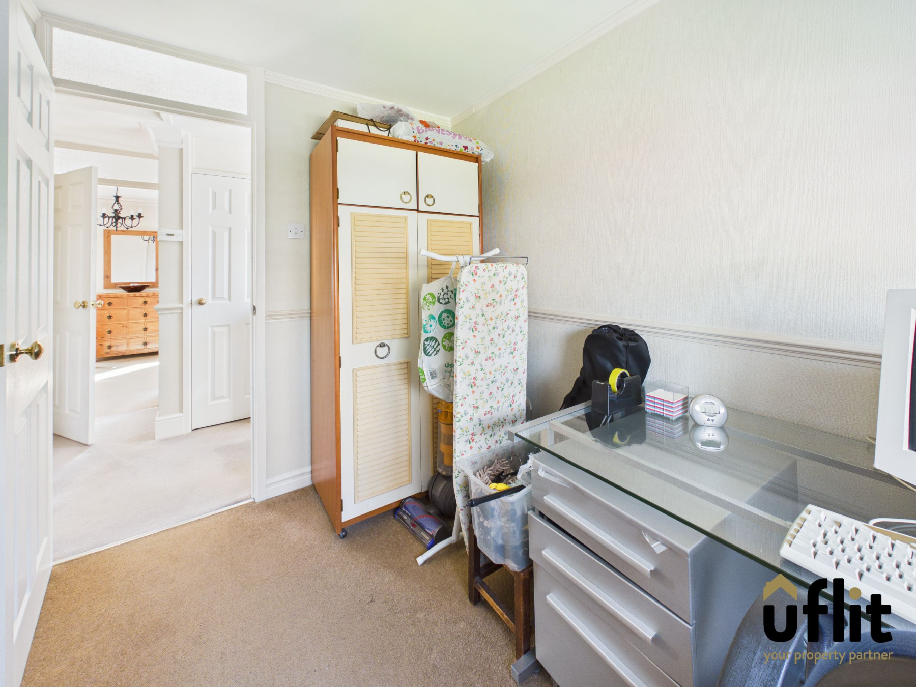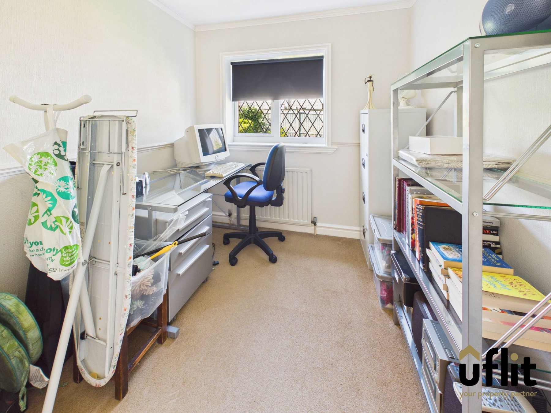A versatile third bedroom also located to the rear, offering carpeted flooring, a radiator and a window with views over the garden, making it ideal as a nursery, home office or guest room.