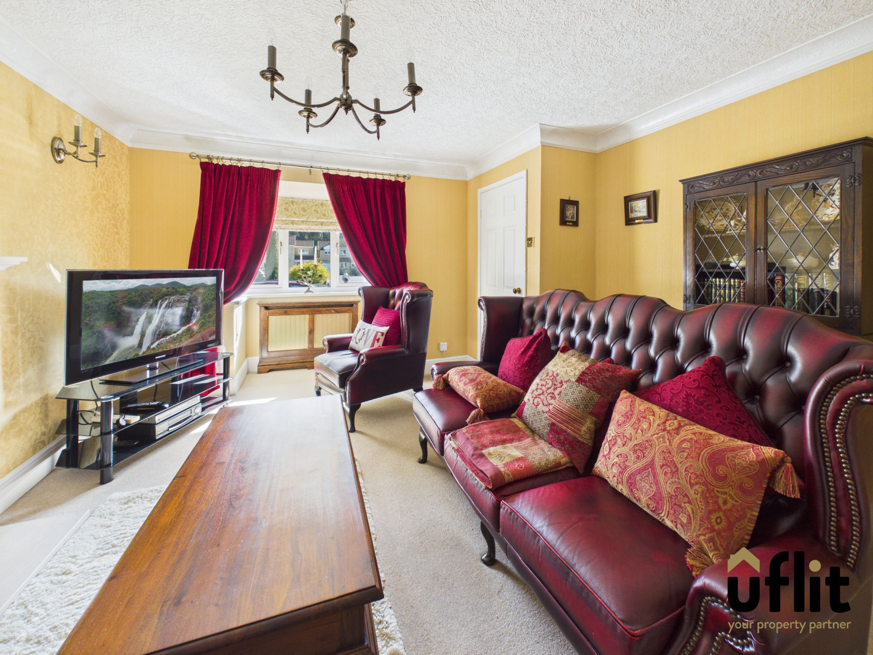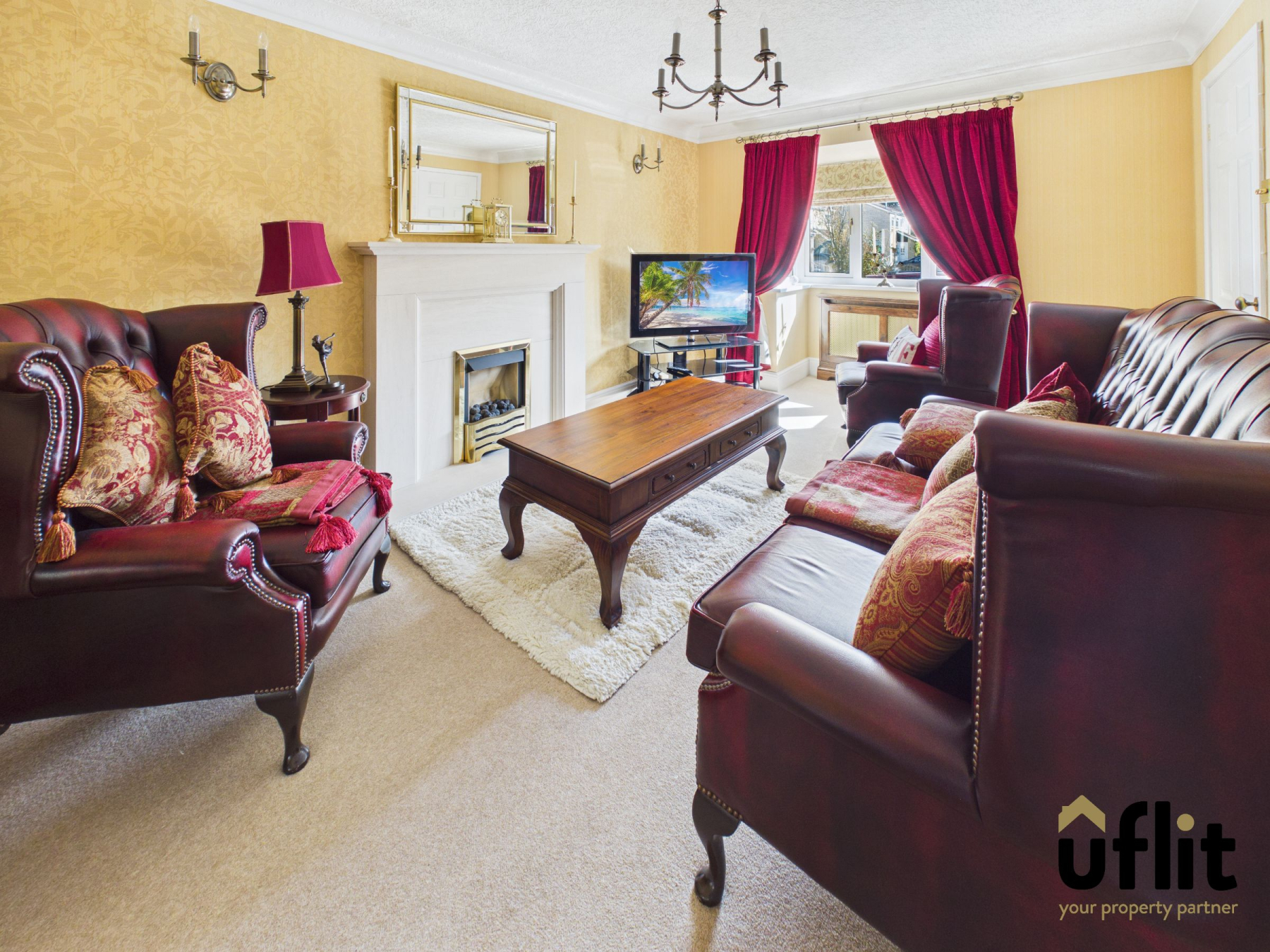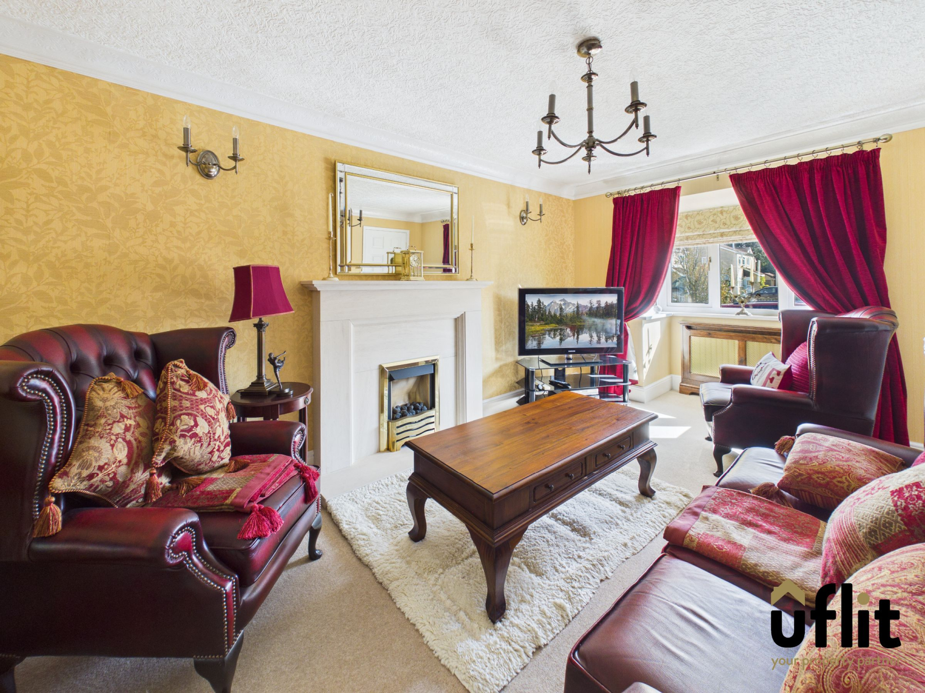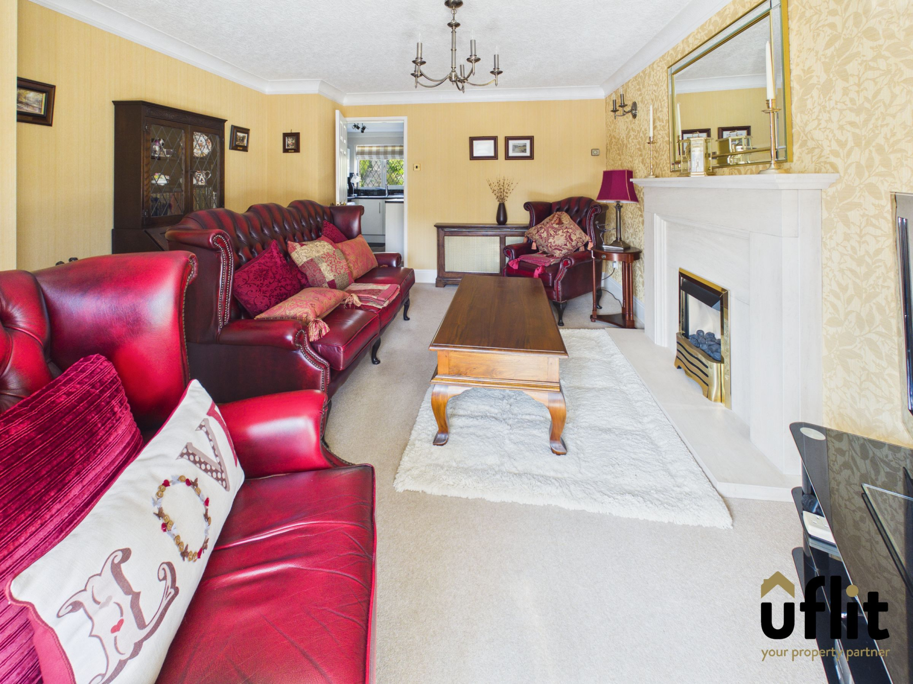A spacious and comfortable living area positioned to the front of the property, featuring a bay window which enhances both light and space. The room is finished with carpeted flooring and benefits from two radiators. A gas fire with decorative surround creates a cosy focal point, ideal for relaxing.