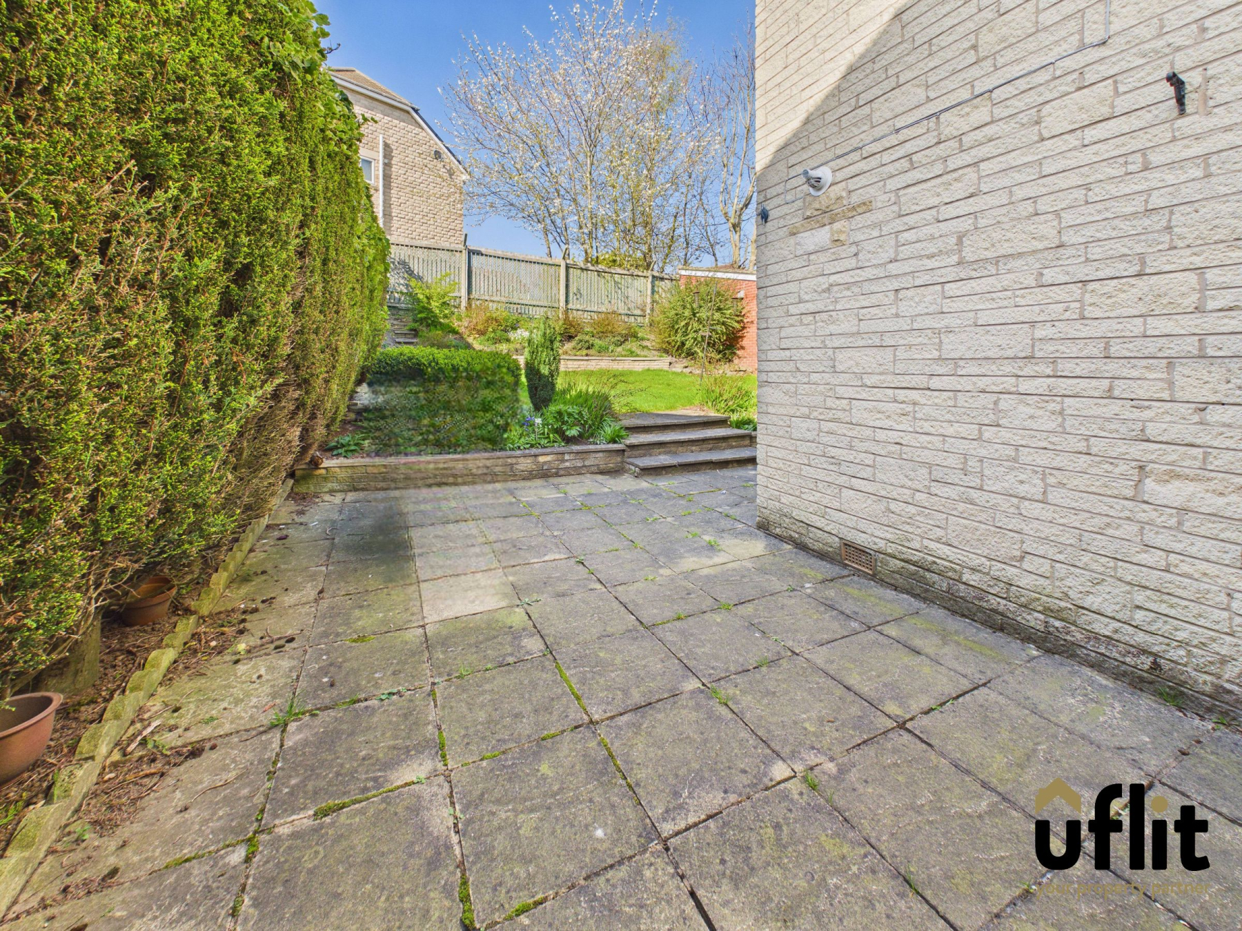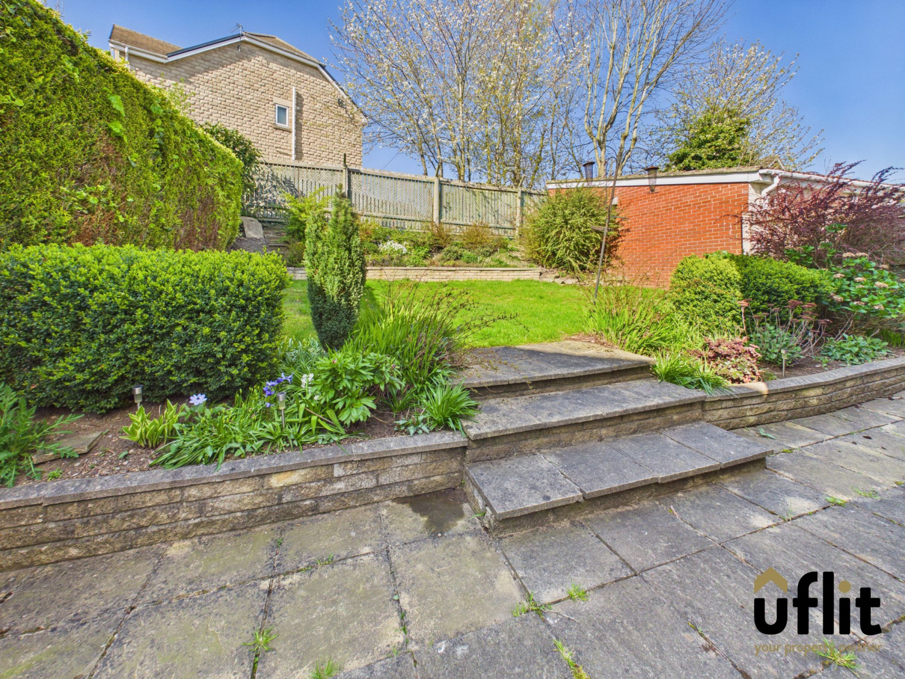 Externally, the rear garden offers a private and enclosed space, ideal for relaxing or entertaining, featuring a patio seating area leading onto a lawn, with tiered borders and established shrubbery adding to the appeal.
