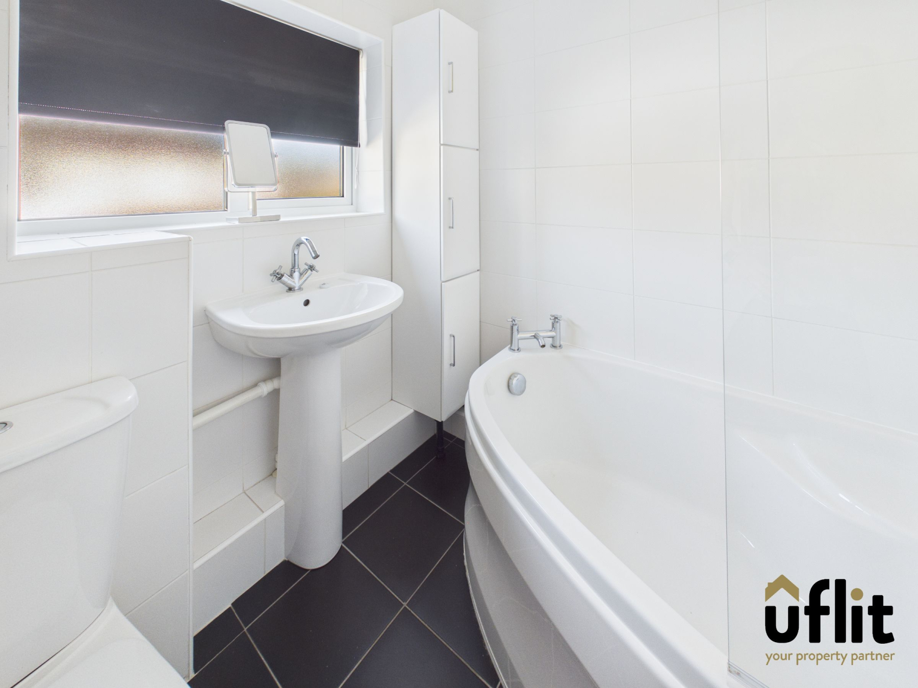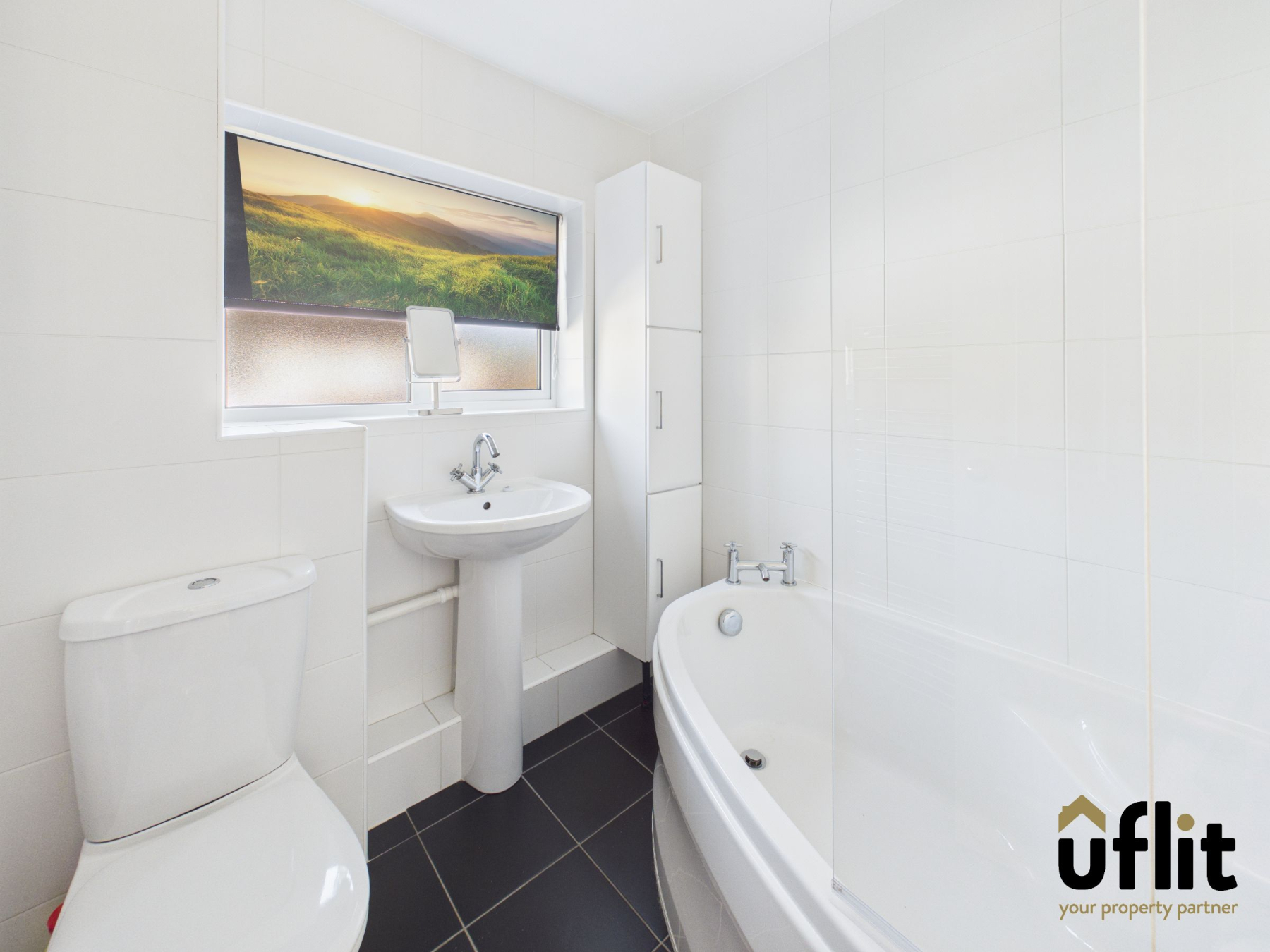 The family bathroom is fitted with a low-level WC, wash basin and a corner bath with shower over. The room features tiled flooring and tiled walls, with a window to the rear elevation providing natural light and ventilation. A towel radiator completes the space.