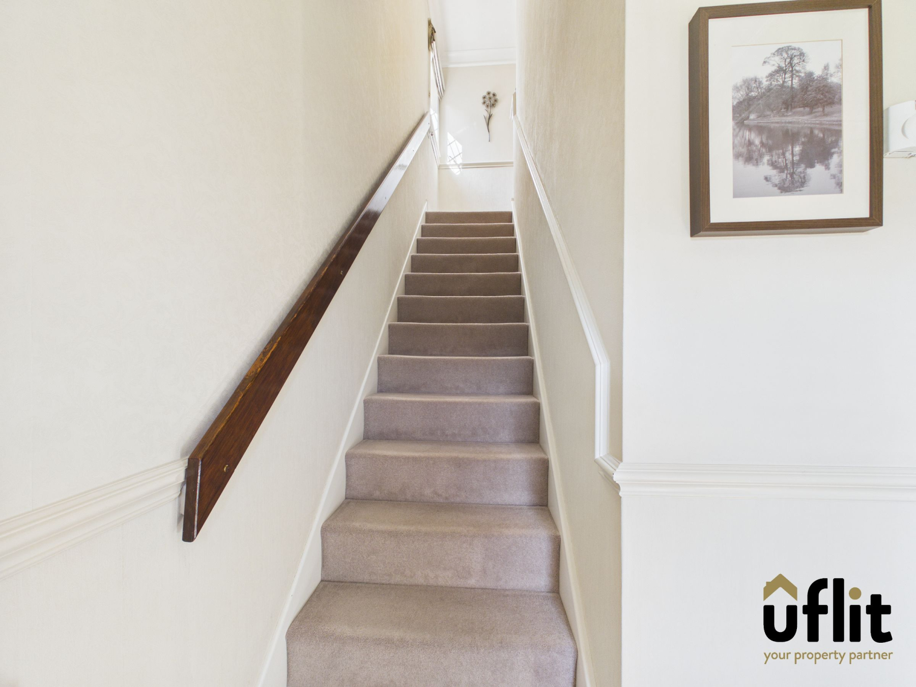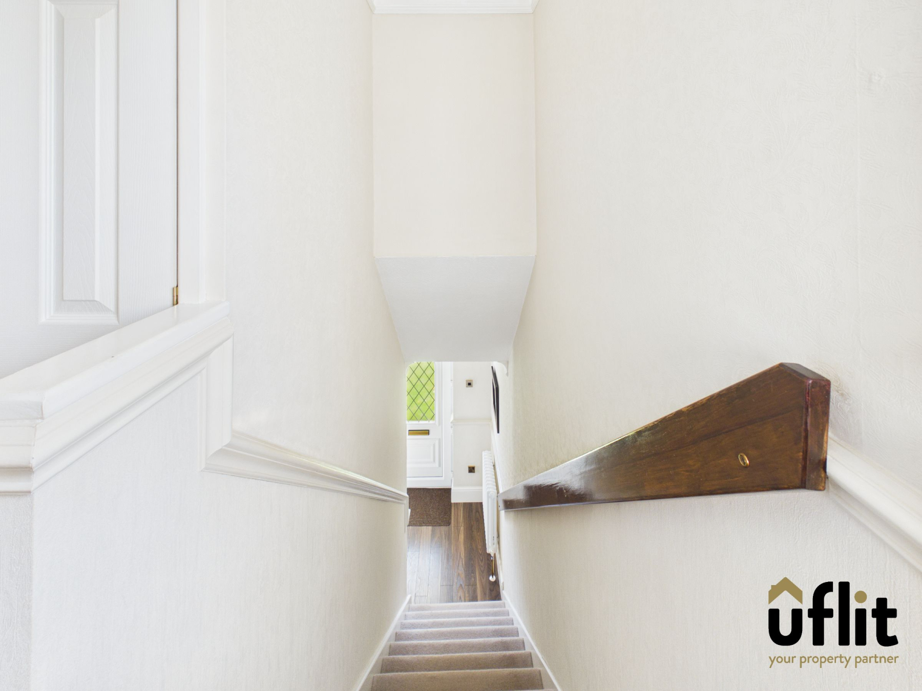 Entered via the front door into a bright and welcoming hallway, finished with wooden laminate flooring and a radiator. A staircase rises to the first floor, with a window to the side elevation allowing natural light to flow through, creating an inviting first impression.