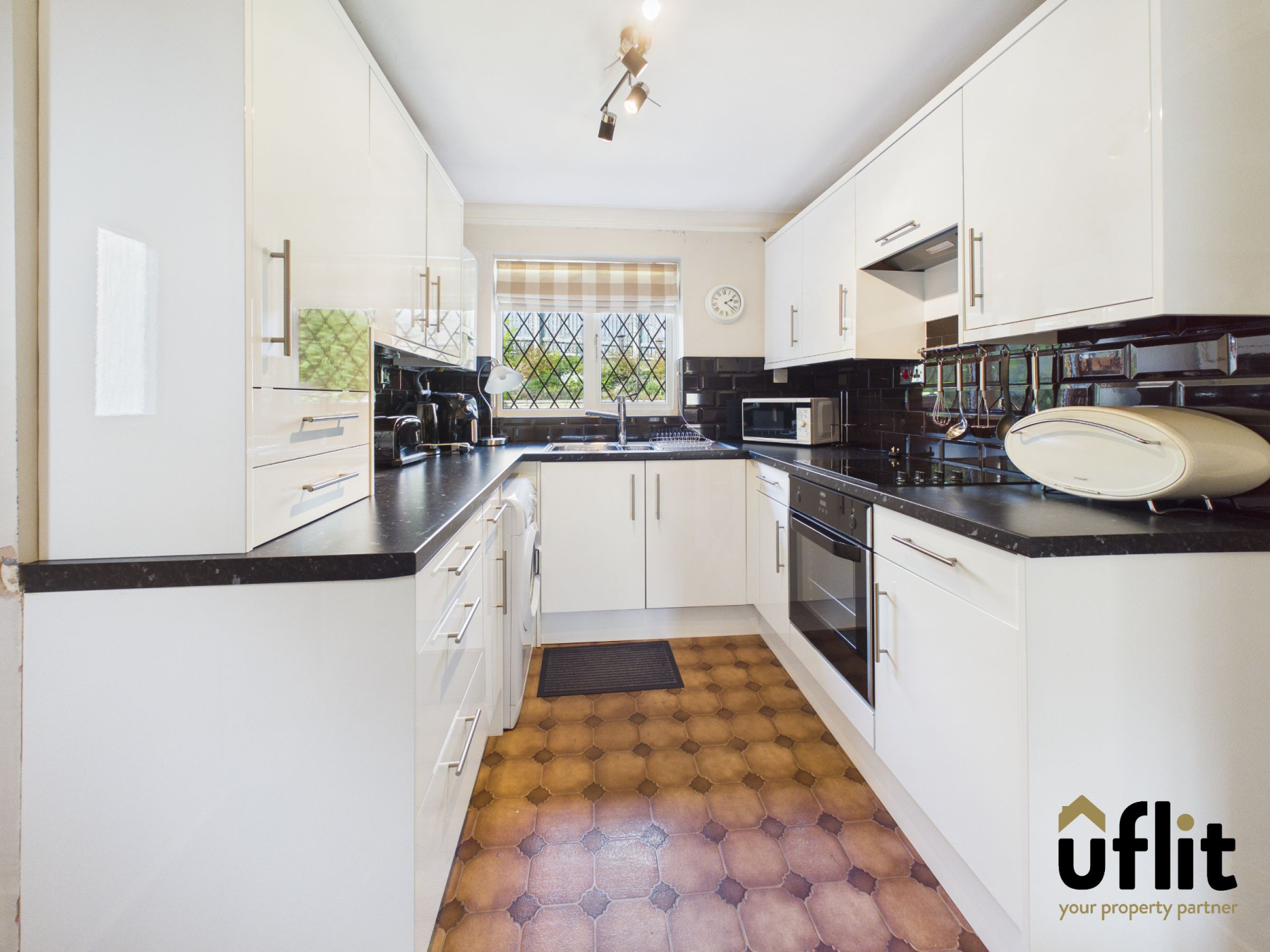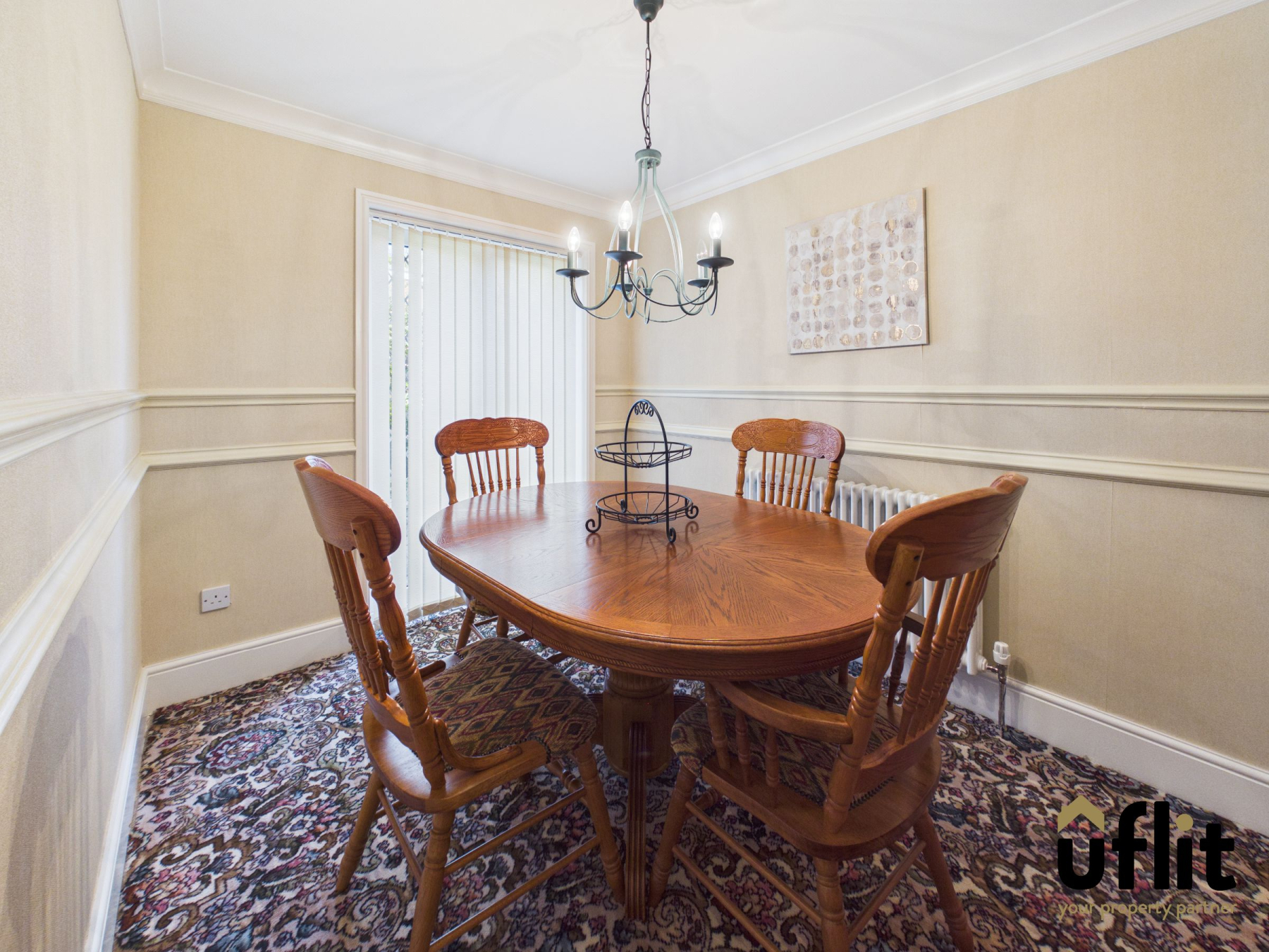 From the lounge, access leads into the kitchen, which is fitted with a range of units and integrated appliances including an electric oven, hob and extractor fan, along with space for additional appliances. A window overlooks the rear garden, and the layout flows through to the dining room, offering an ideal space for both everyday living and entertaining. The dining room enjoys French doors opening onto the rear garden, creating a seamless connection between indoor and outdoor spaces.
