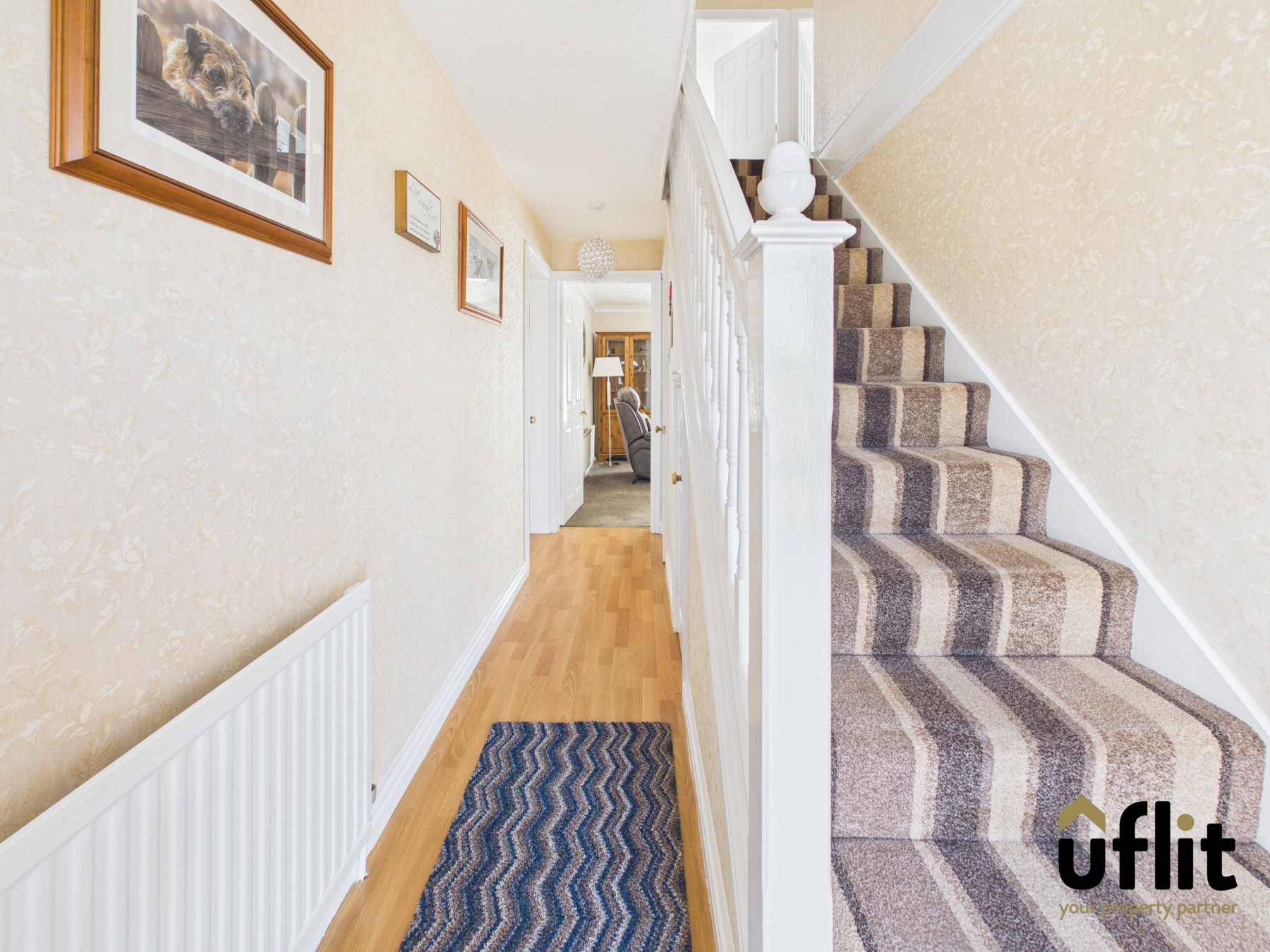 Enter through the front door into a welcoming hallway finished with wooden laminate flooring and a radiator, with the added benefit of useful under-stairs storage.