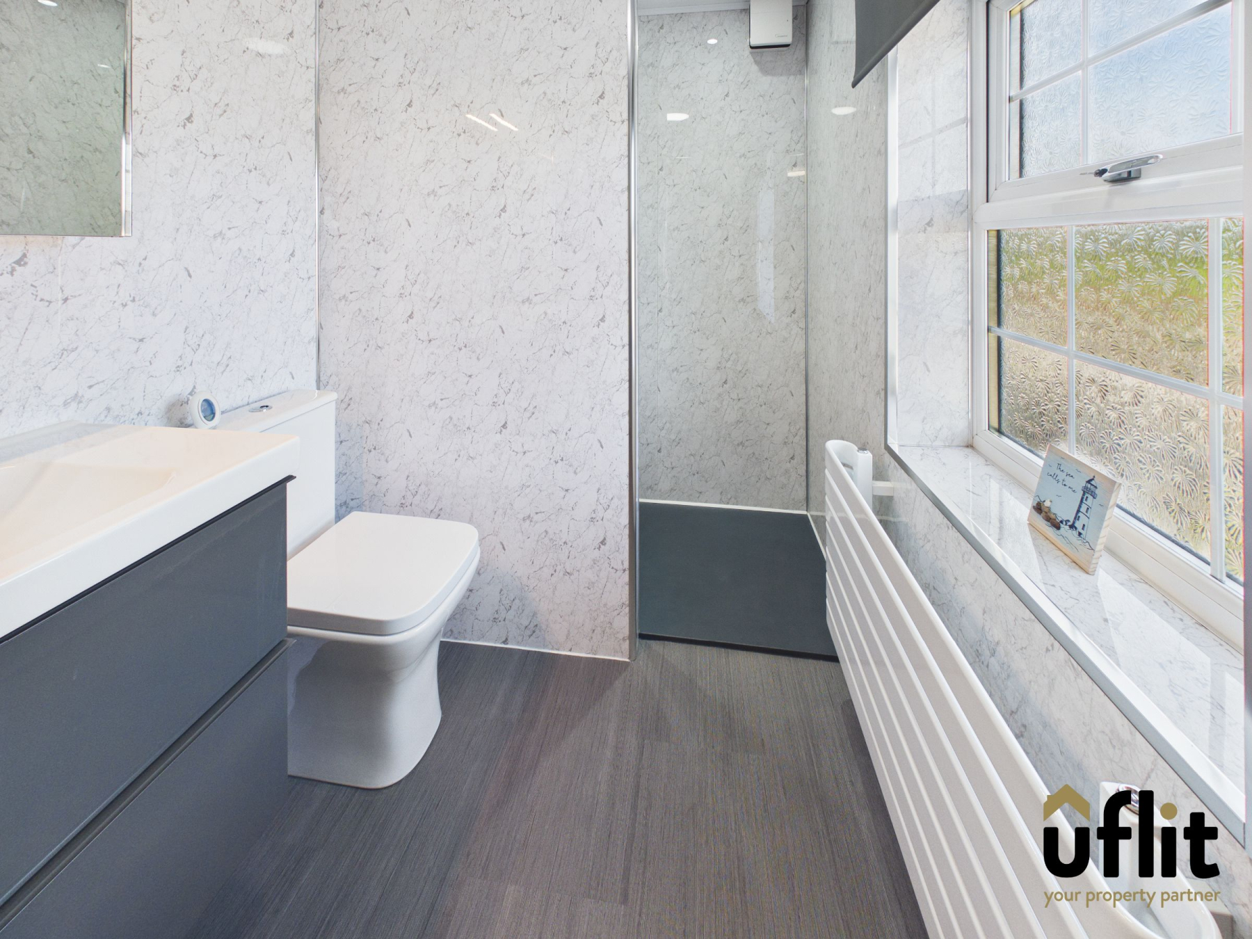 Recently renovated to a high standard, the ensuite features panelled flooring and walls, a window to the front and a dual-headed shower. A wash basin is set within a vanity cupboard, accompanied by a low-level WC and a stylish radiator.