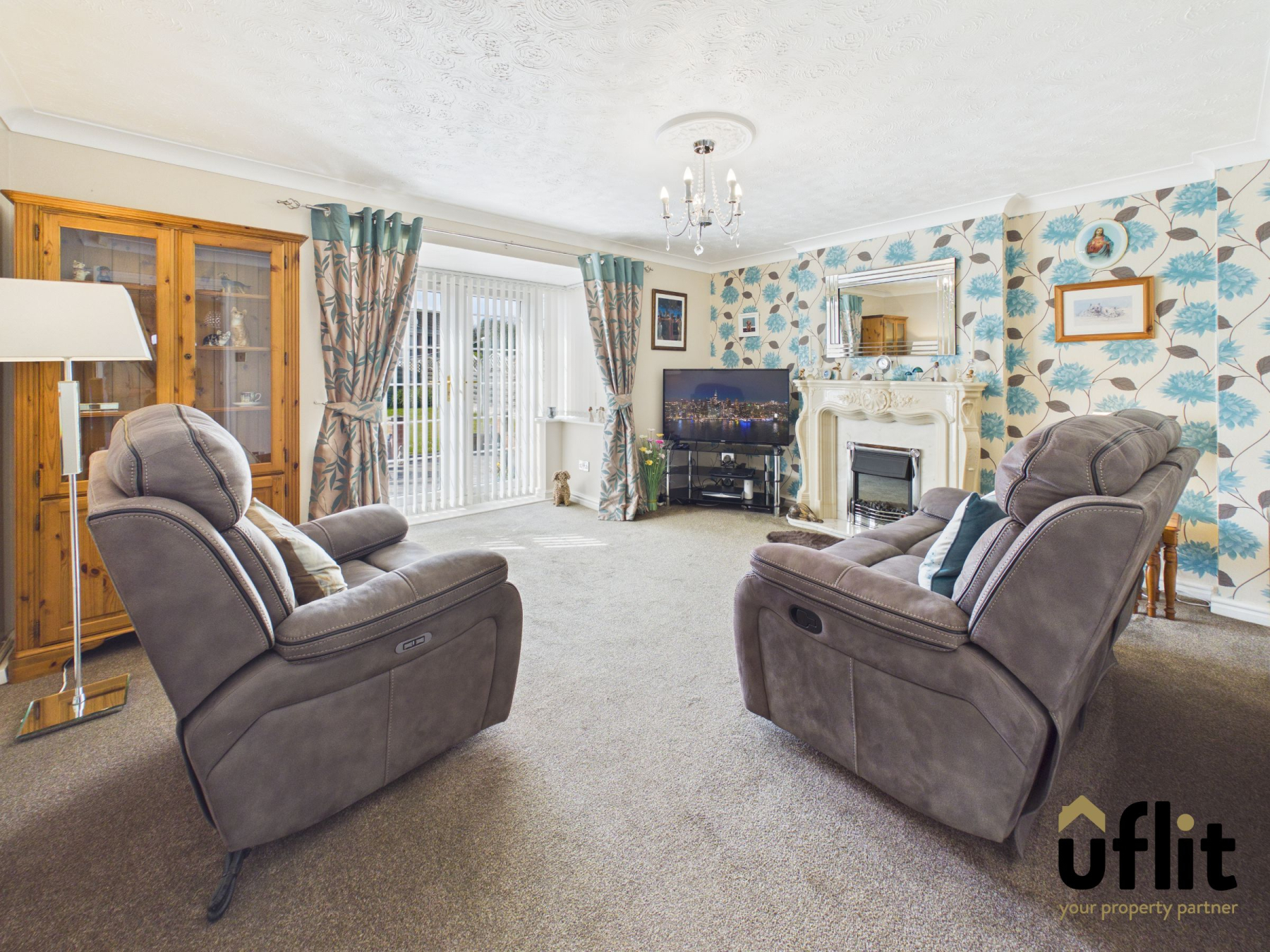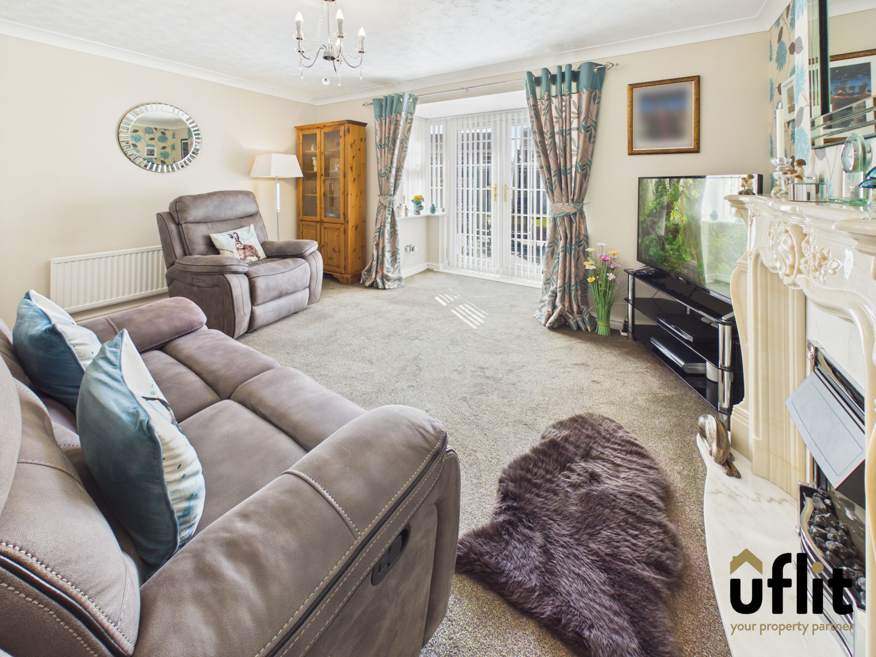 A spacious and comfortable living area featuring carpeted flooring and a radiator, centred around an electric fire with surround. French doors open out to the rear garden, allowing for plenty of natural light and a seamless connection to outdoor living.