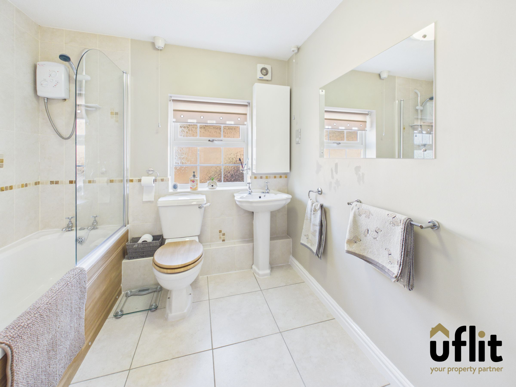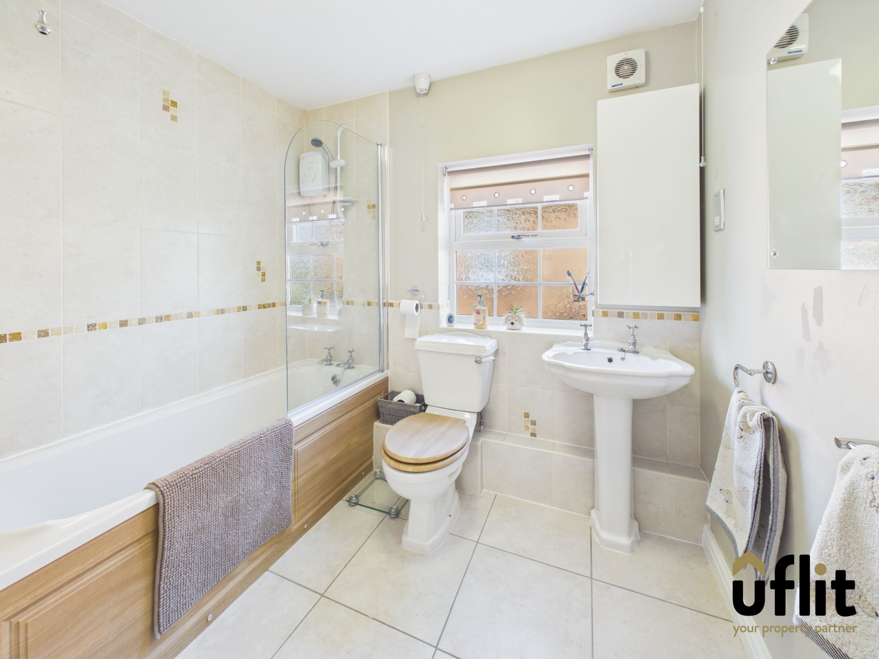 A family bathroom comprising tiled flooring and partially tiled walls, with a window to the side elevation. It includes a bath with shower over, wash basin, low level WC, towel radiator and a useful storage cupboard.
