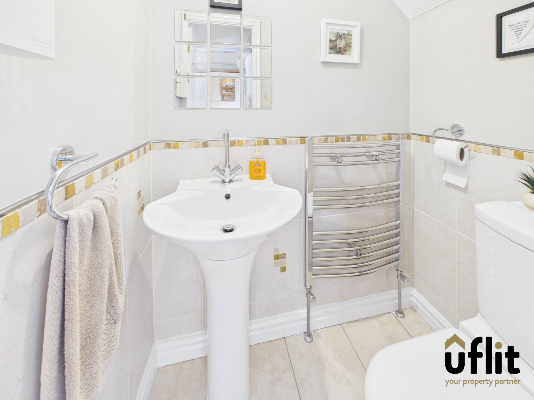 Conveniently located, comprising tiled flooring and partially tiled walls, a wash basin, low level WC and a towel radiator.
