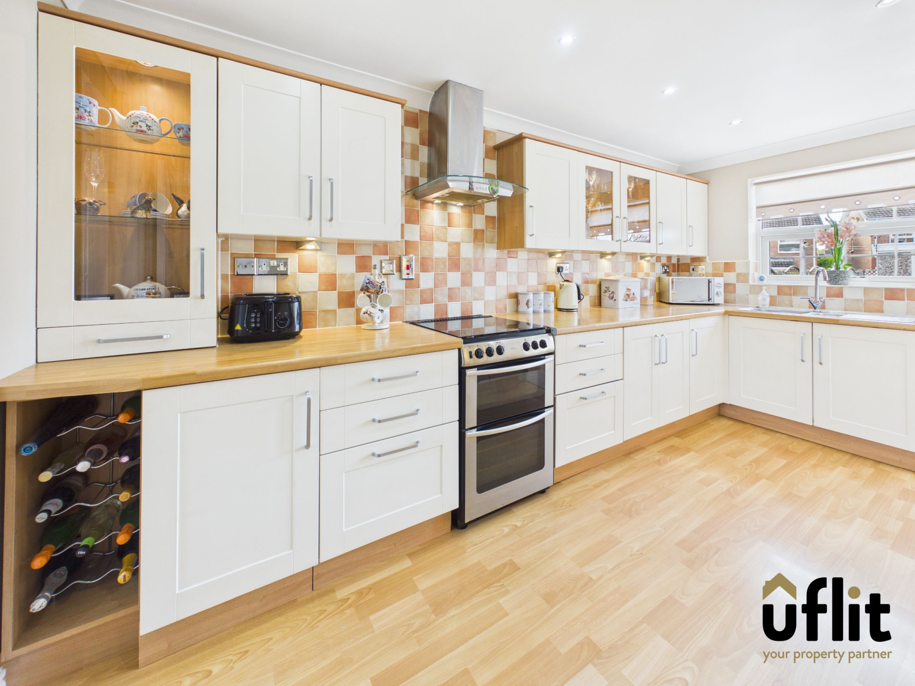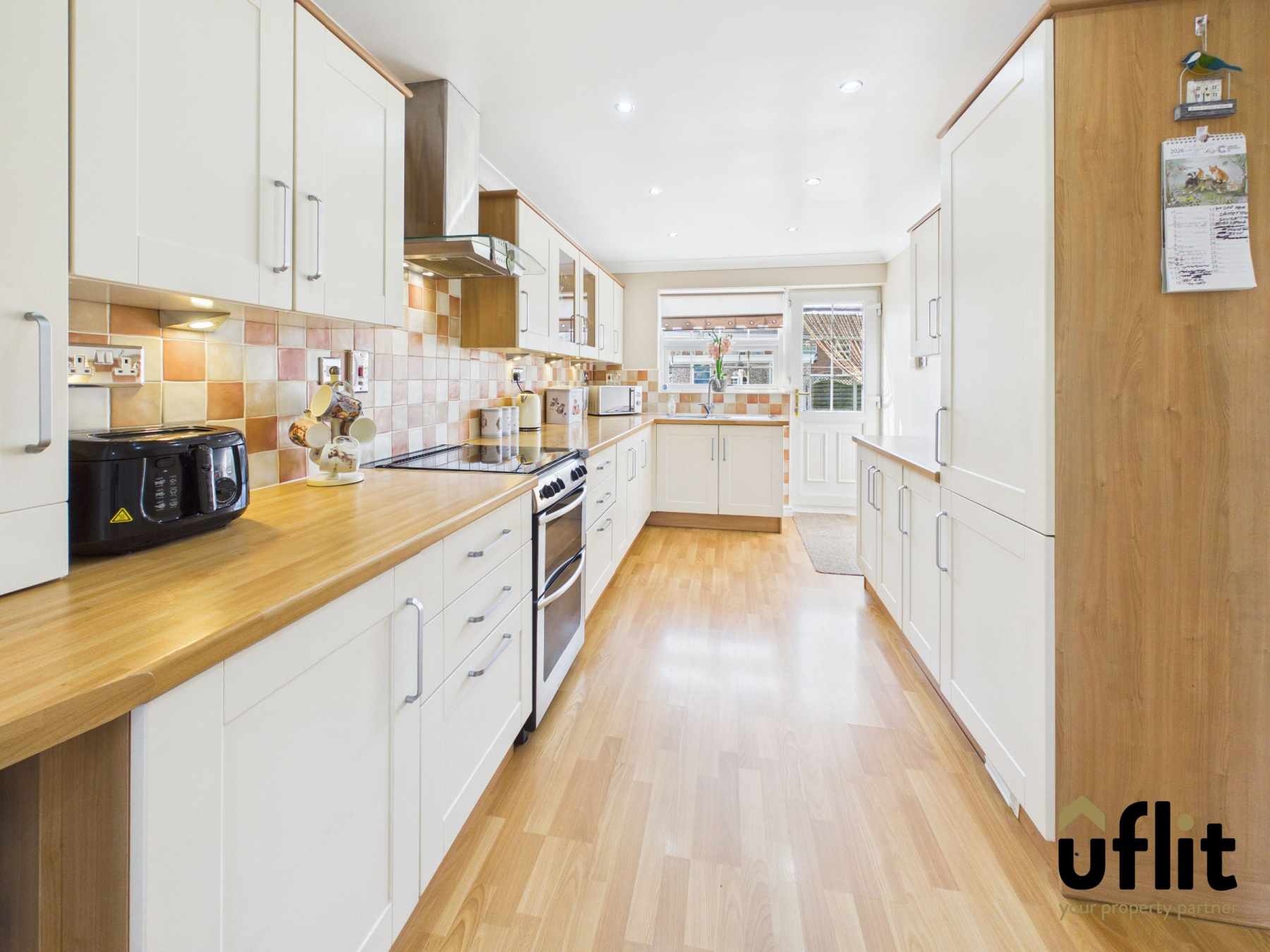 A well-appointed kitchen fitted with wooden laminate flooring and partially tiled walls, complete with spotlights. It features an integrated washing machine, integrated fridge freezer, integrated gas oven and gas hob with extractor fan above, along with space for a dishwasher. A window overlooks the rear garden and a door provides direct access outside.