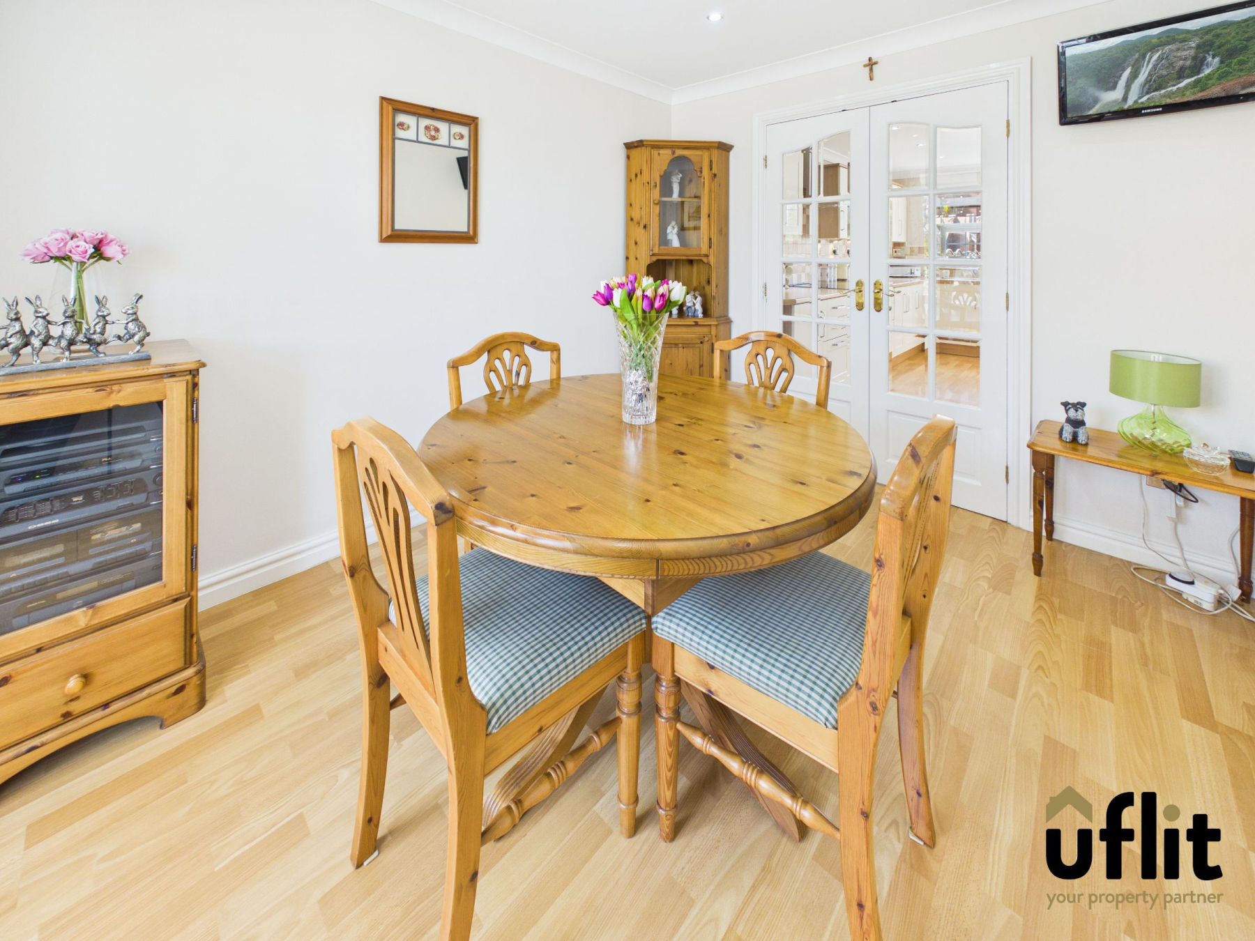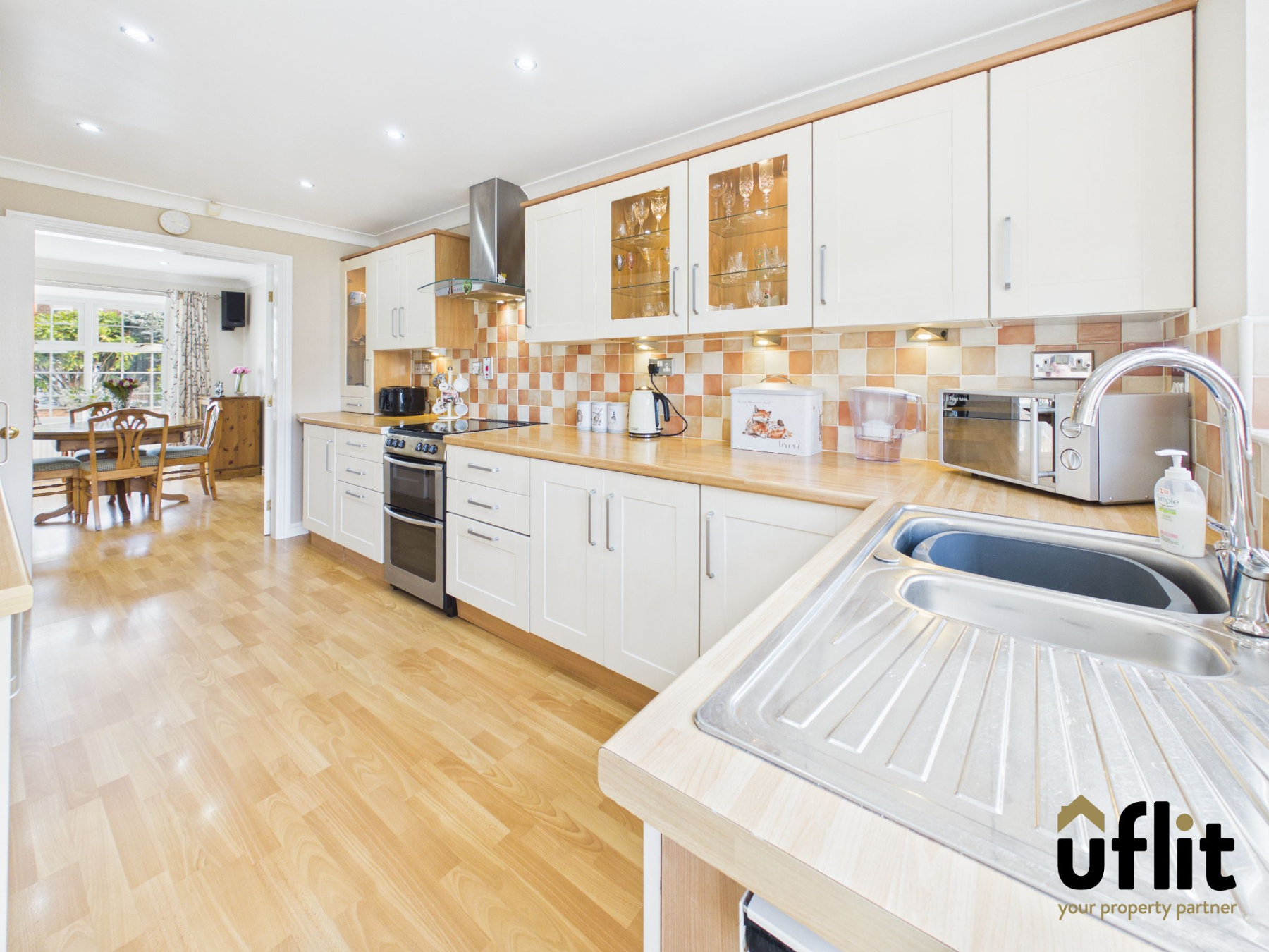 Positioned to the front of the property, the dining room benefits from a bay window, wooden laminate flooring and a radiator. Double doors lead through to the kitchen, creating a versatile space ideal for both everyday dining and entertaining.