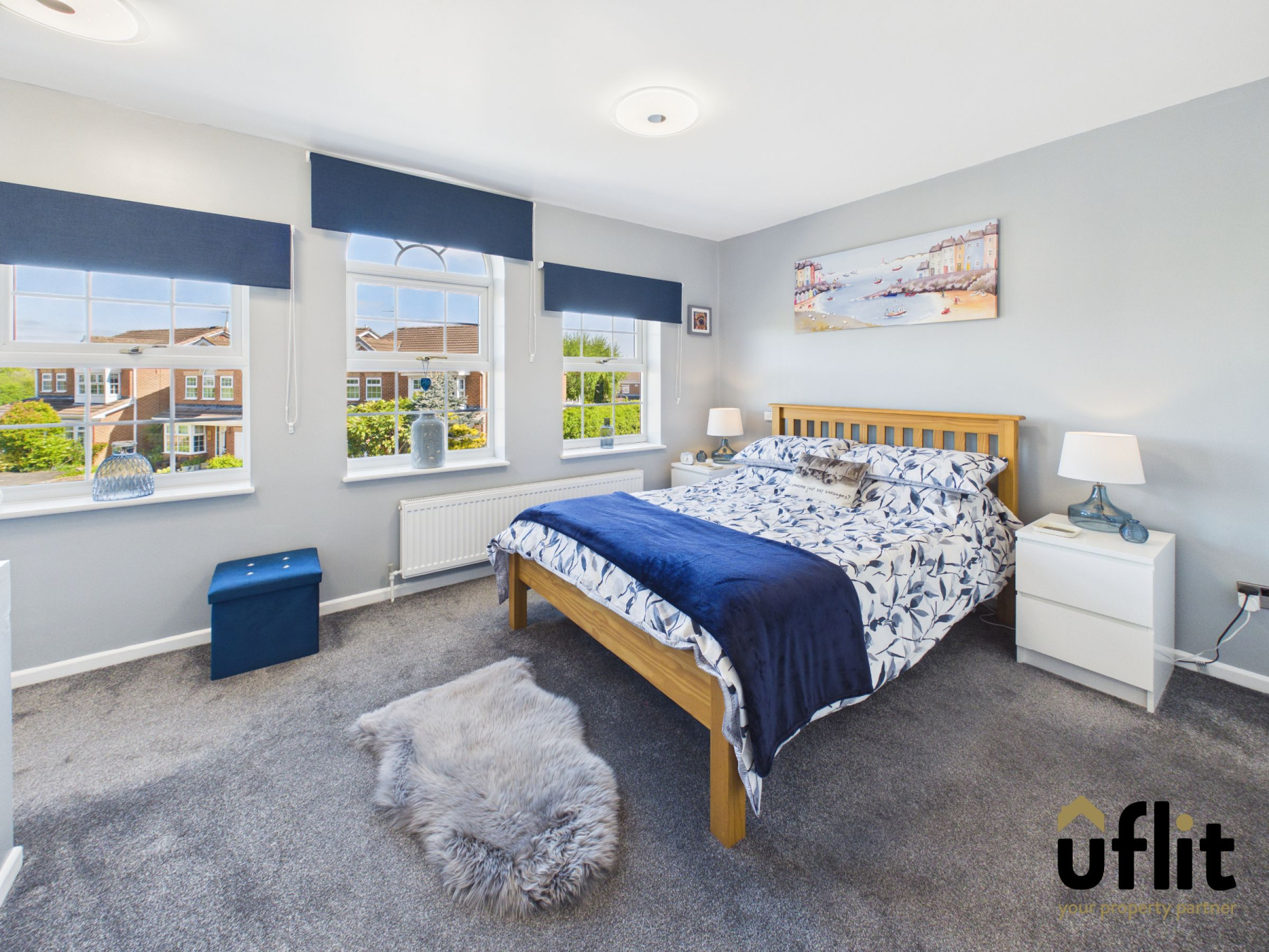 A generously sized principal bedroom featuring carpeted flooring and a radiator, with three windows to the front elevation allowing for an abundance of natural light.