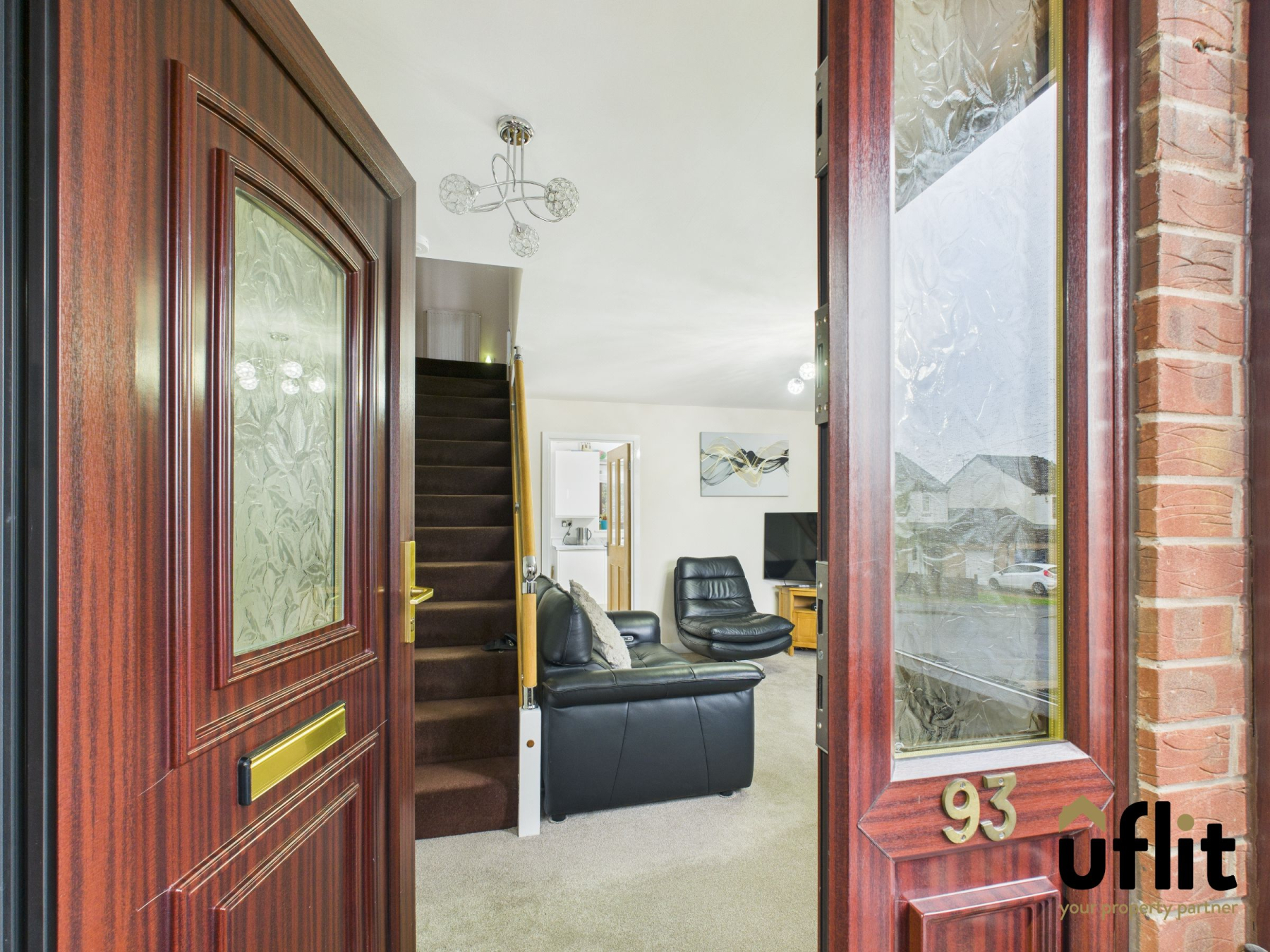 A welcoming entrance porch featuring a UPVC front door with side glazed panels, allowing natural light to flood in. Carpeted for comfort, this space provides a practical and inviting introduction to the home.