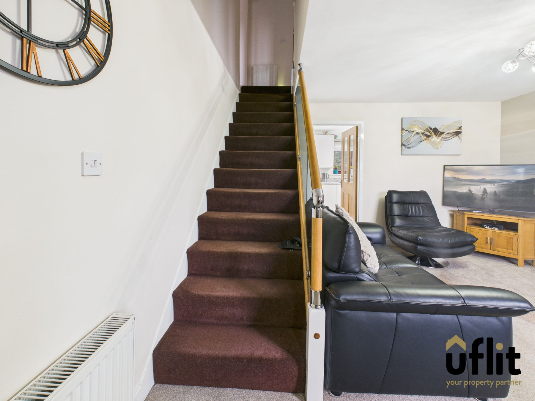 A spacious living room finished with plush carpeting, a front-facing window and radiator. Stairs rise to the first floor accommodation.