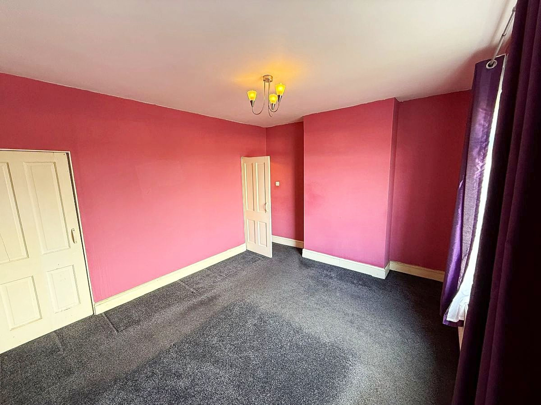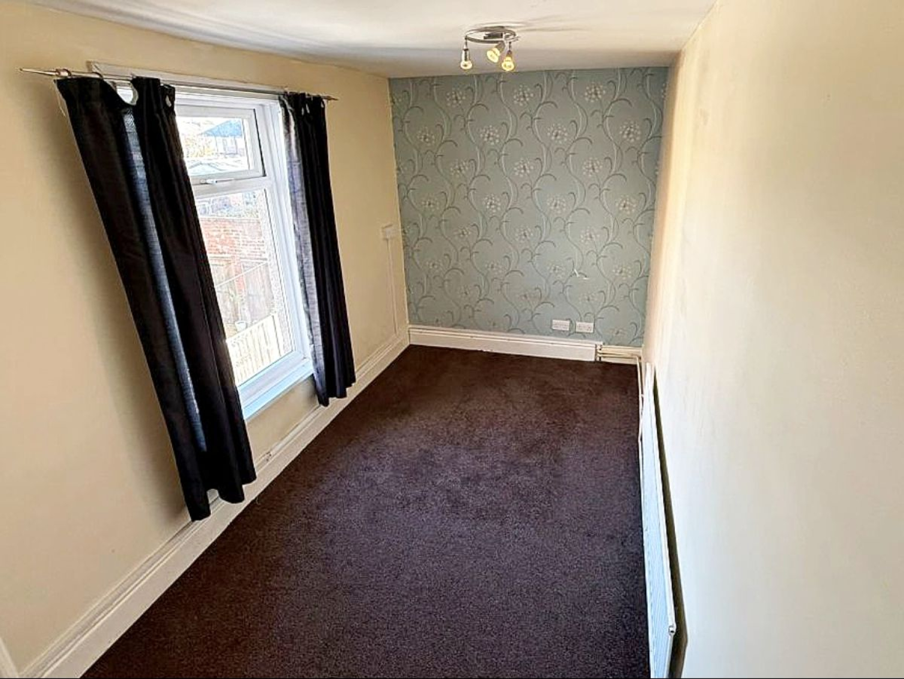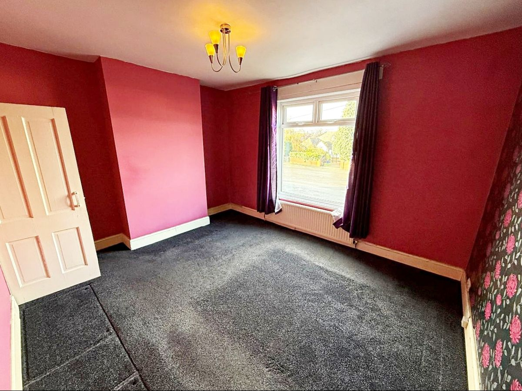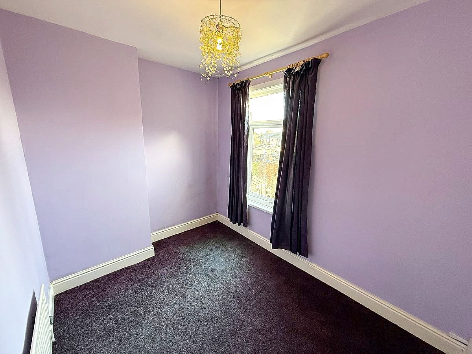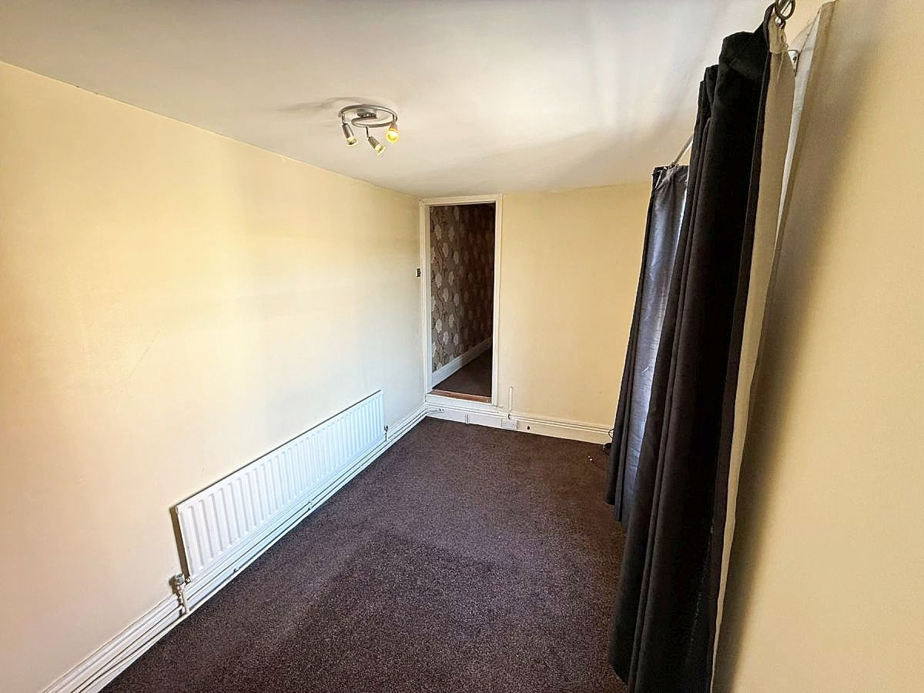A further double bedroom with carpeted flooring, radiator and a rear facing upvc window.