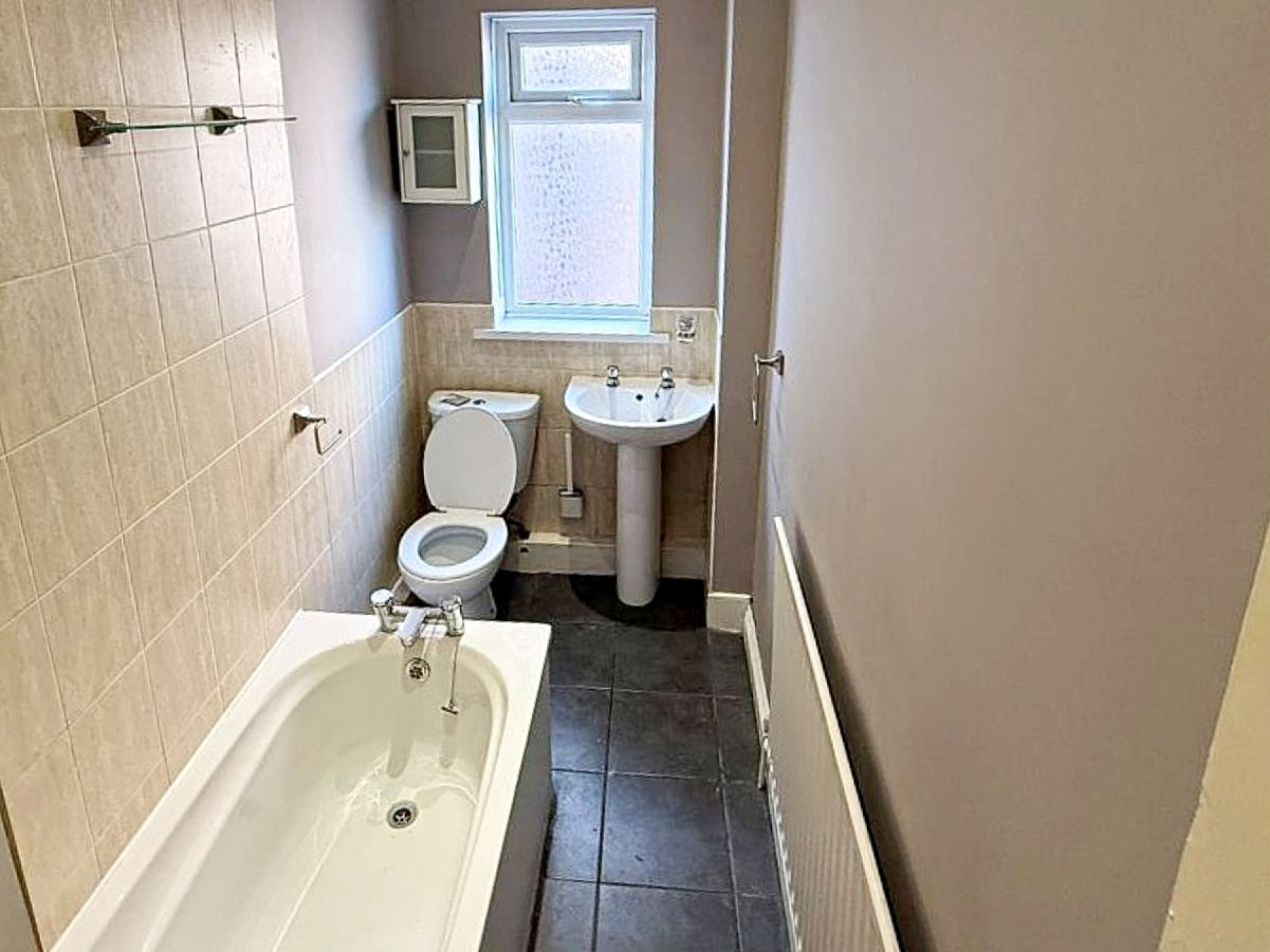 Comprising of a panelled bath with overhead shower and screen, wash hand basin and low level wc. Partially tiled walls and complementary tiled flooring, spot lighting, built-in storage and a side facing upvc window.