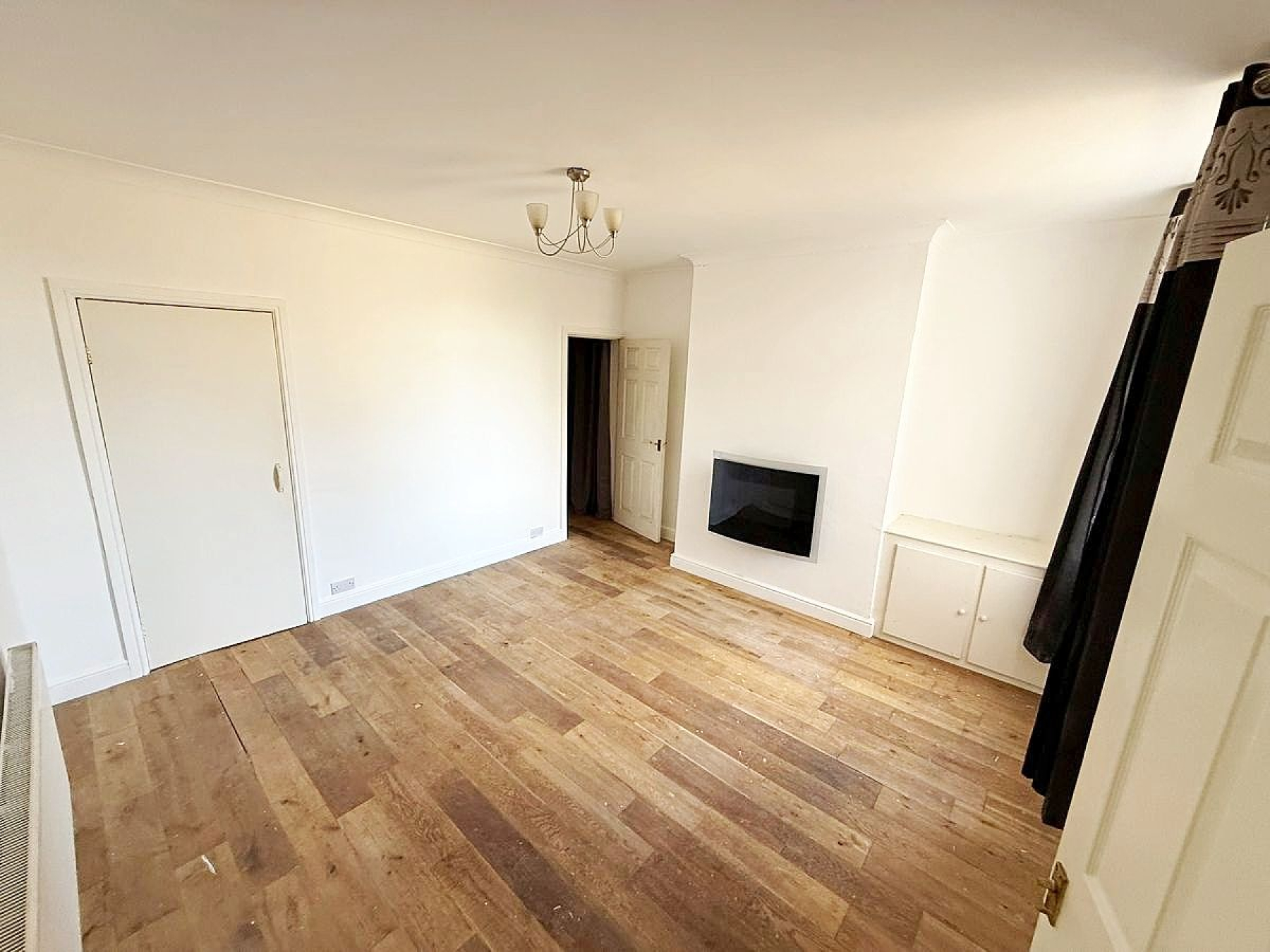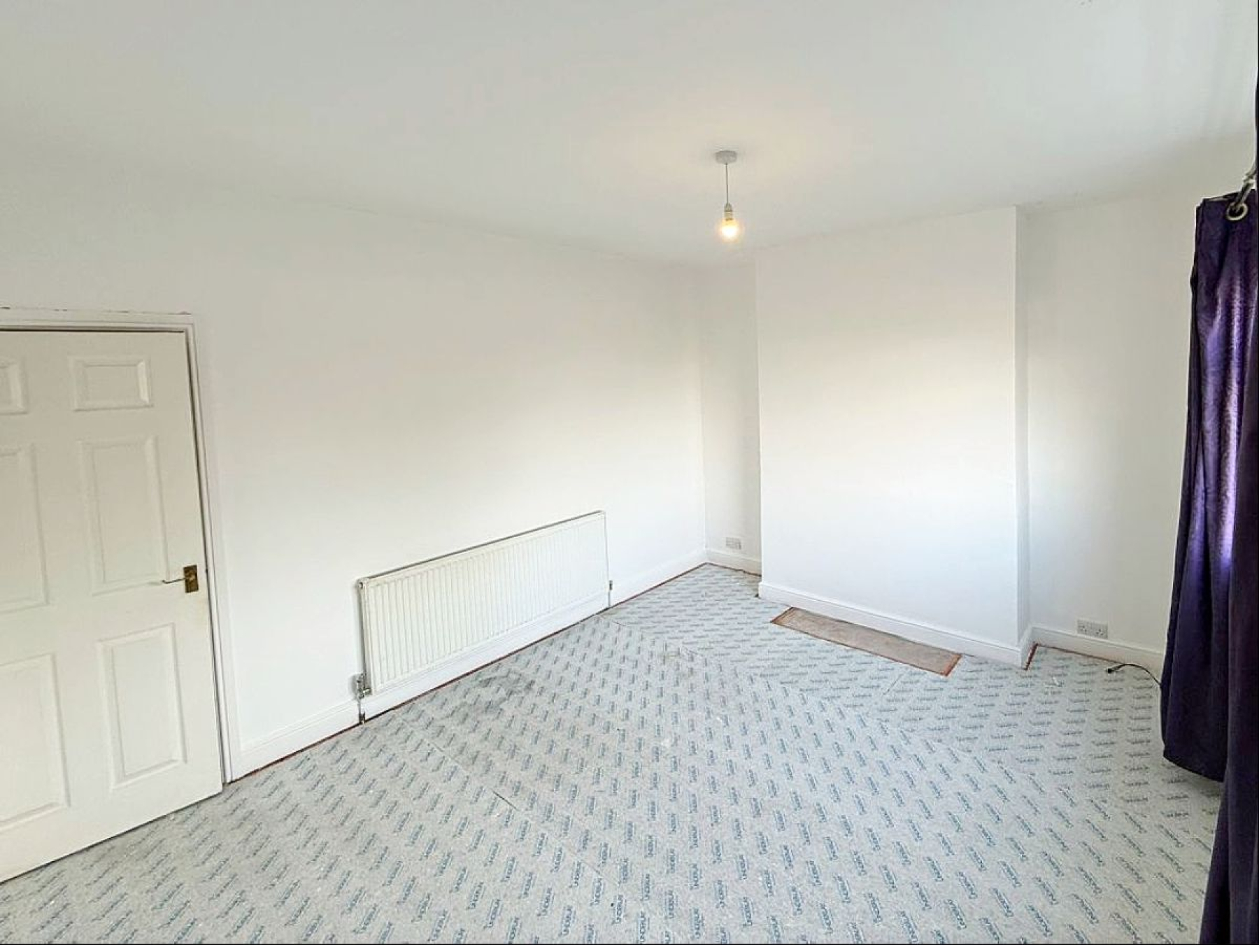 A spacious master bedroom with carpeted flooring, radiator and a front facing upvc window.