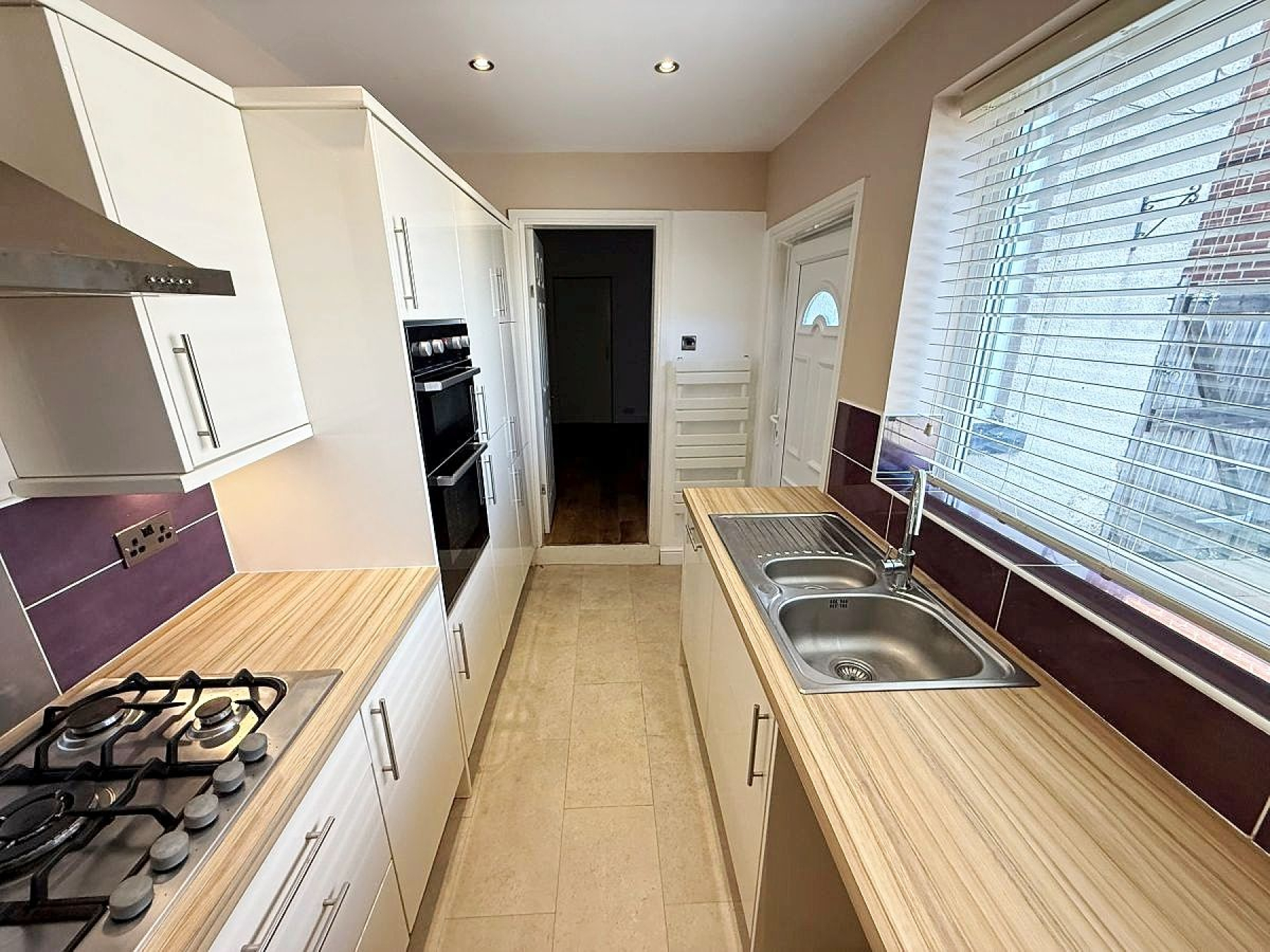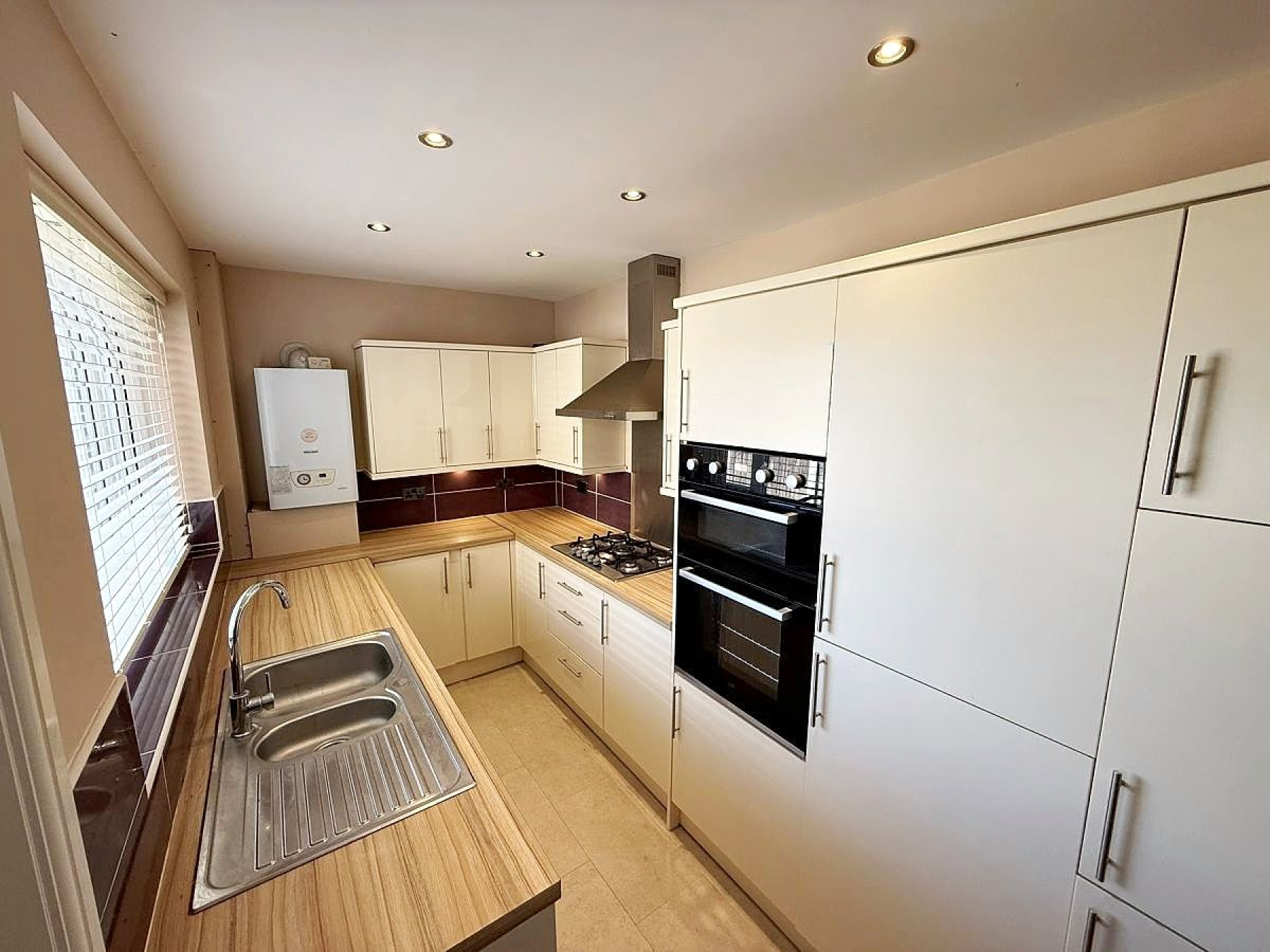 A beautiful wrap around kitchen tastefully adopting the extension featuring a range of wall and base units with complimentary worksurface areas, tiled back panels and a counter top sink. Built-in double oven, gas hob with stainless steel back panel, extractor fan, integrated fridge freezer and dishwasher. A side facing upvc window along with a glazed upvc door allows light whilst accessing the garden, a designer radiator adds warmth and beautiful LVT flooring flows throughout.