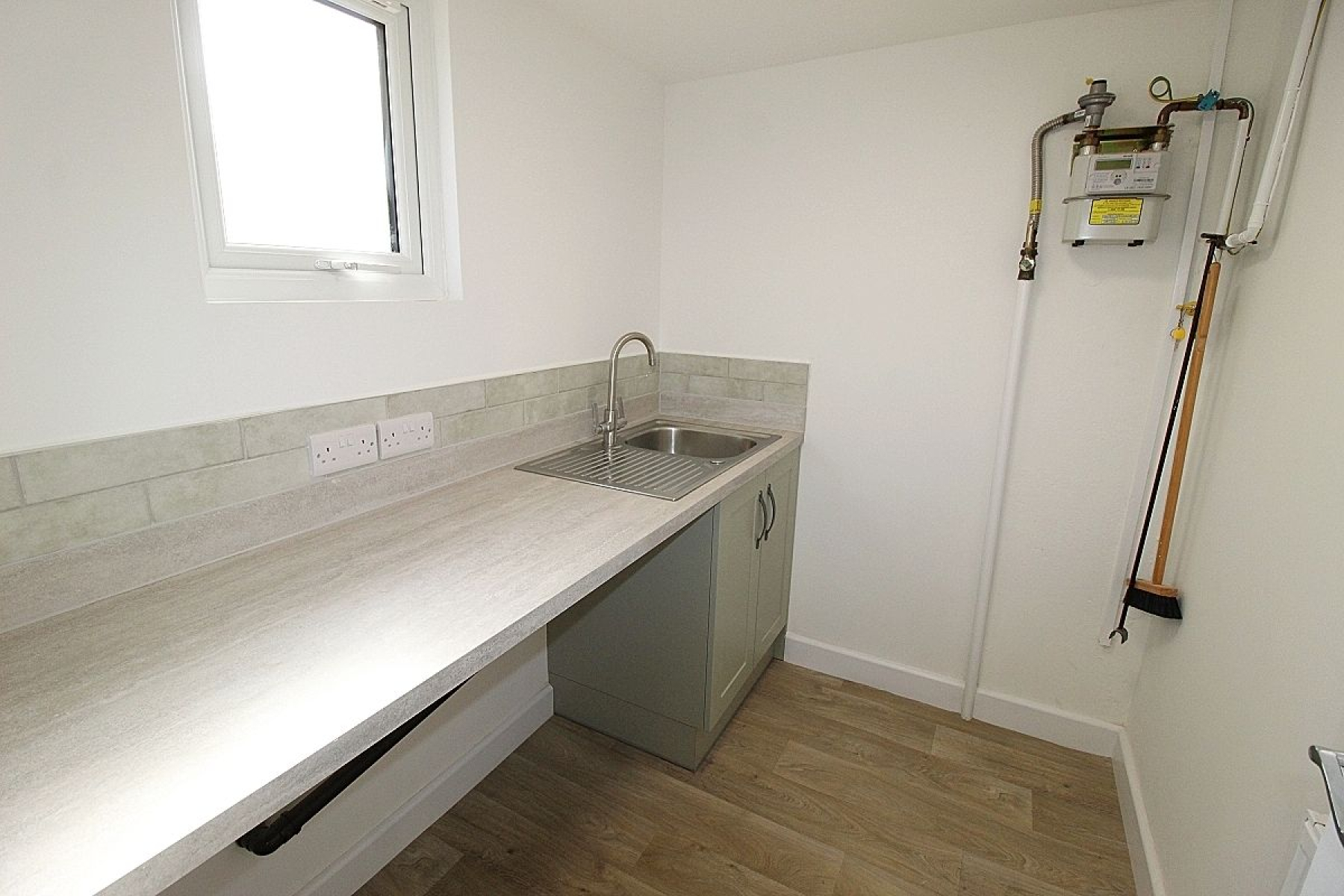 With further base units with complimentary work surface areas, matching upstands and tiled back panels, plumbing for further utilities, a continuation of the vinyl flooring and radiator.
