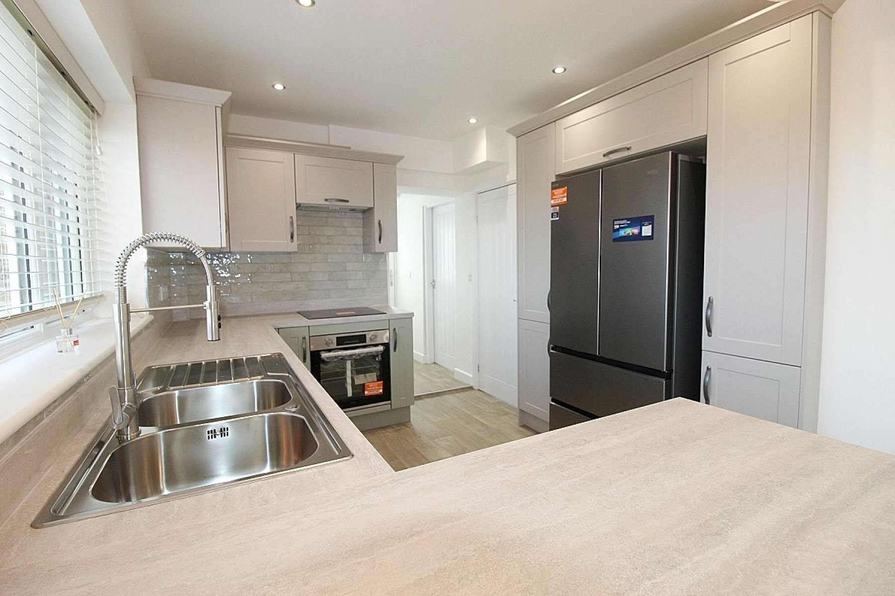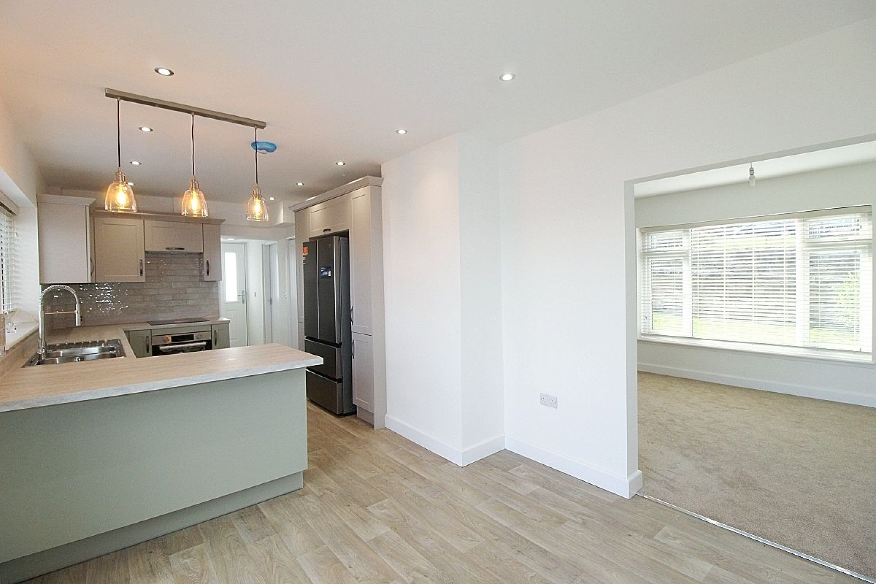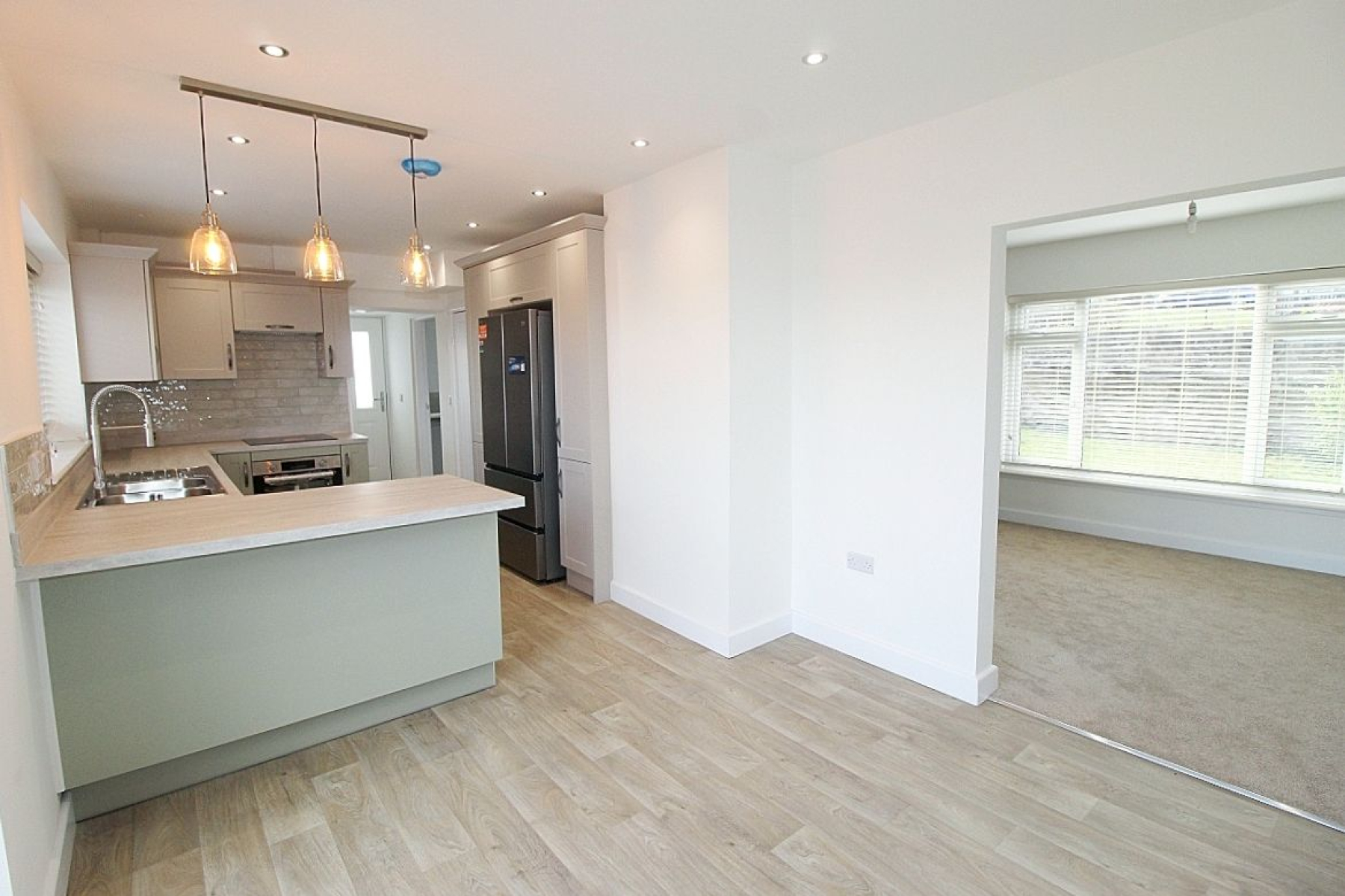 The heart and hub of this truly magnificent home is the newly fitted modern kitchen featuring a range of wall and base units with complimentary work surface areas, matching upstands and tiled back panels with a counter top stainless steel sink and designer tap, boasting an adjoining breakfast bar with a continuation of the worktops and complimentary base units. Fitted appliances to include a built in oven, hob, extractor fan, integrated appliances to include a dishwasher and an American fridge freezer with complimentary surround cabinets emulating the standard on offer. Further complimenting this modern kitchen is a radiator, laminate flooring seamlessly flowing through to the dining area and an abundance of mood spot lighting. A rear facing upvc window along with Patio doors opening to the garden. A glazed composite door gives further access to the garden and a further doors to a large under stairs storage cupboard, utility area and wc.