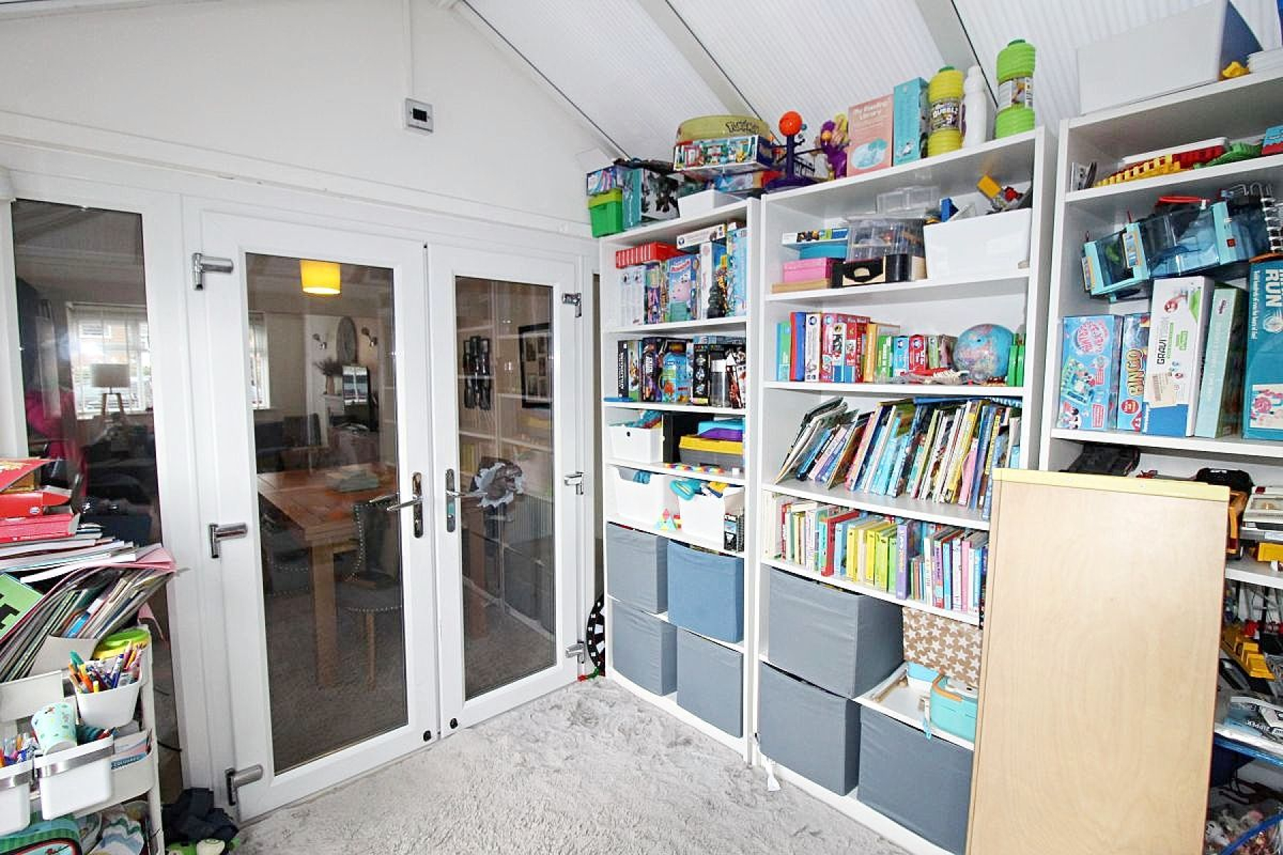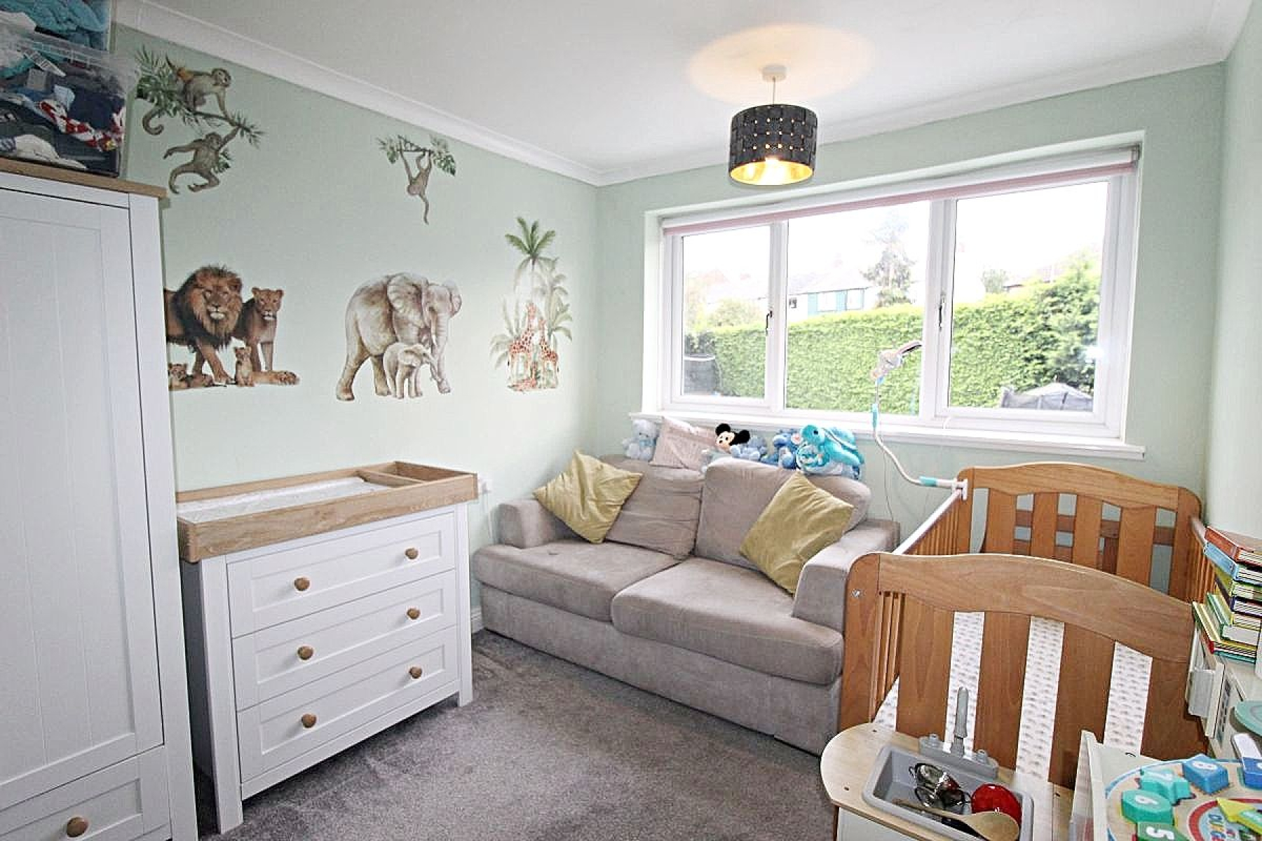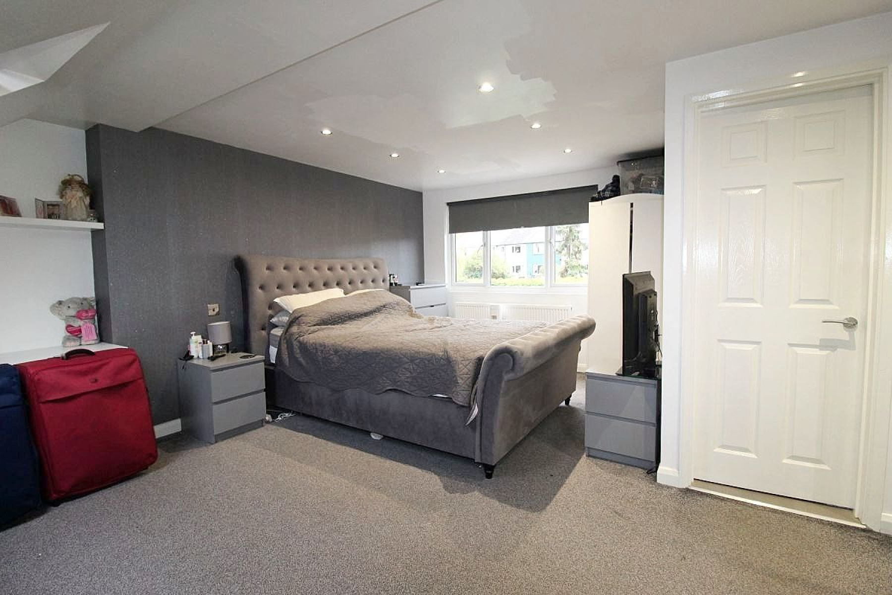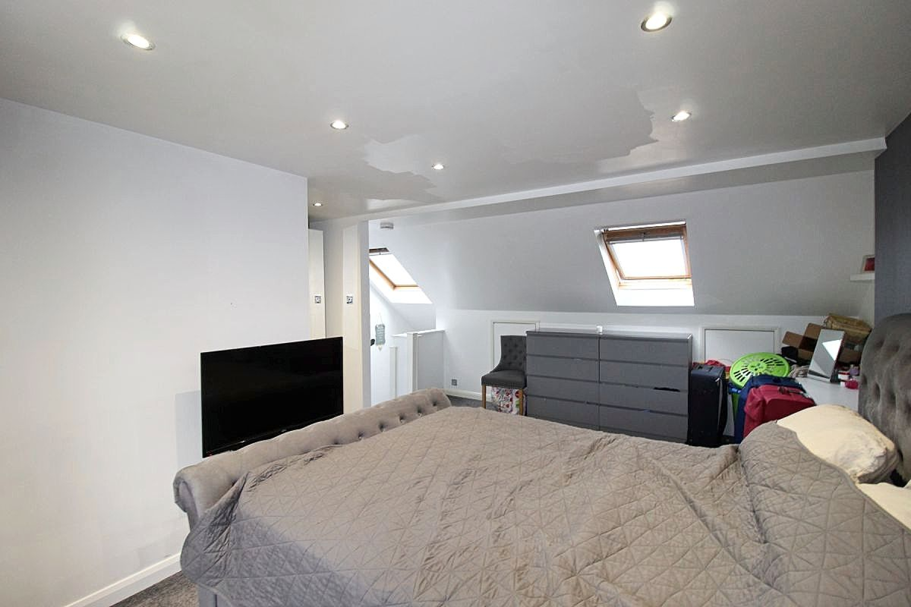 Two front-facing Velux windows, rear-facing window, carpet, radiator, storage in the eaves, and door to en-suite. Accessed via a stairway from the landing through a store area.