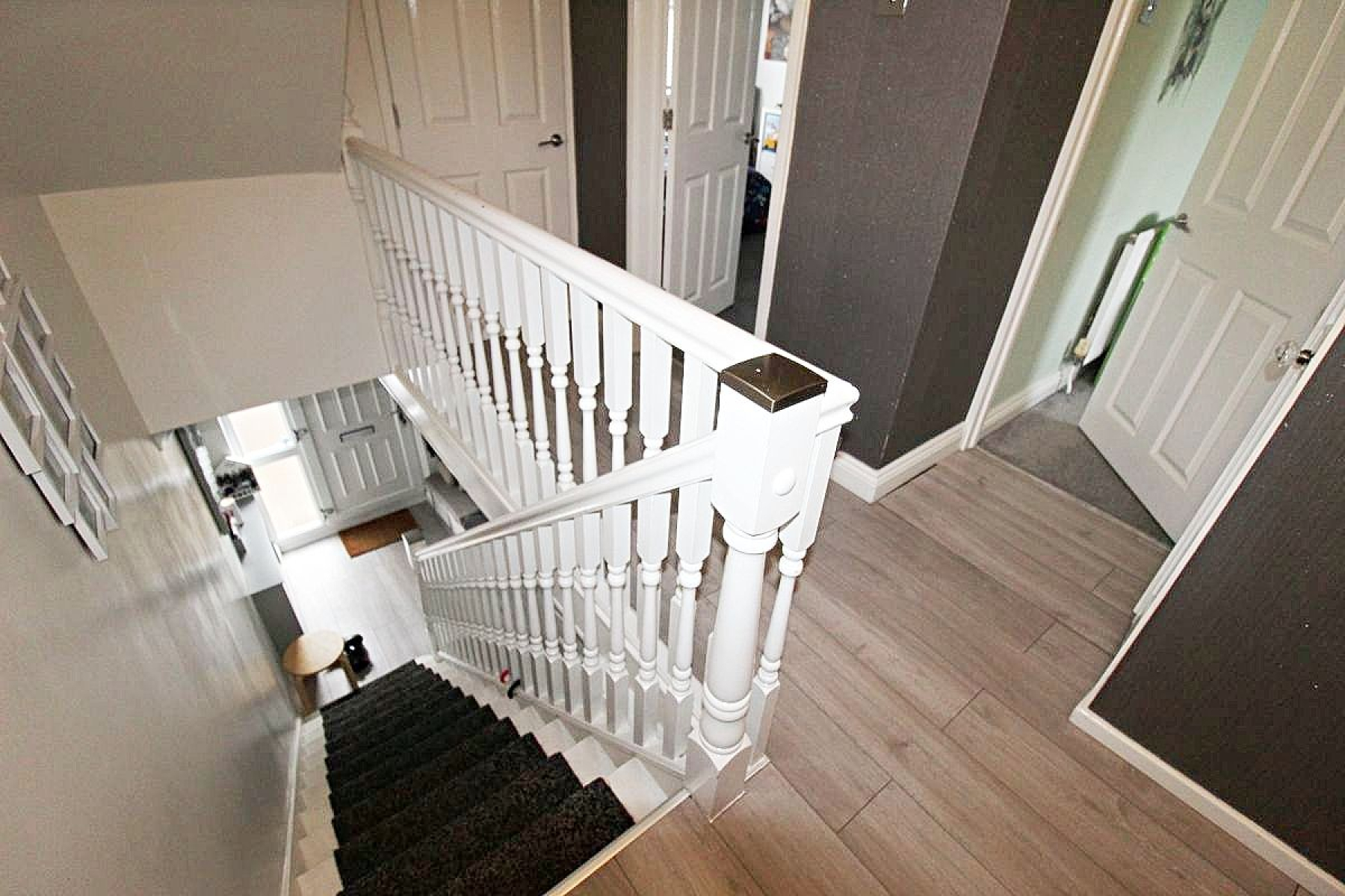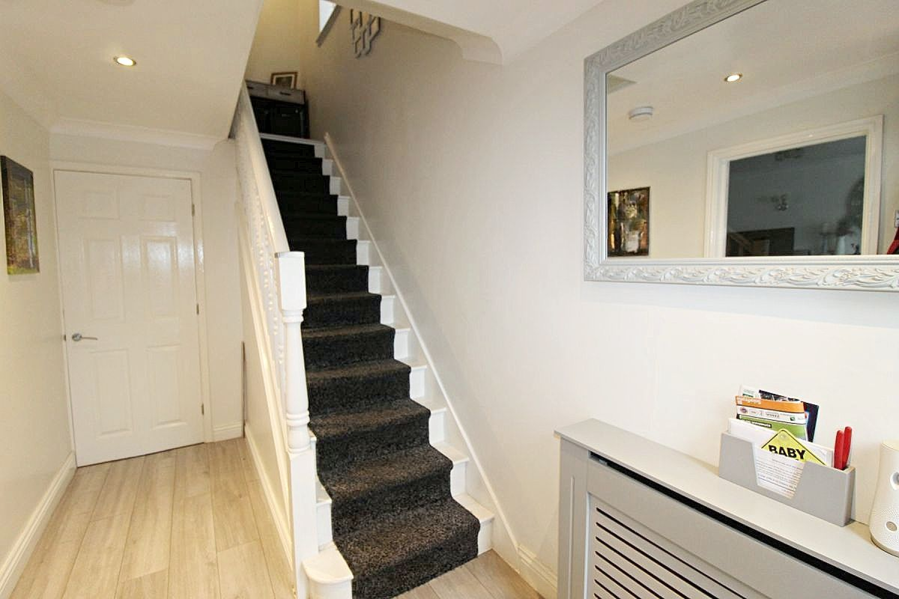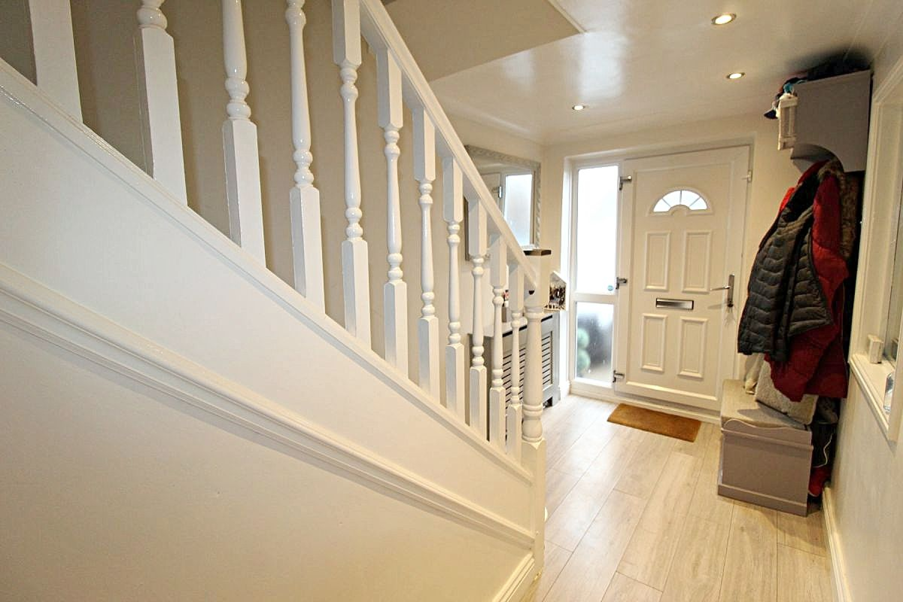 Welcoming entrance via UPVC door with side panel window for extra light. Laminate flooring, radiator, and stairs leading to the first floor. Door leading to the kitchen and an internal window overlooking the lounge.
