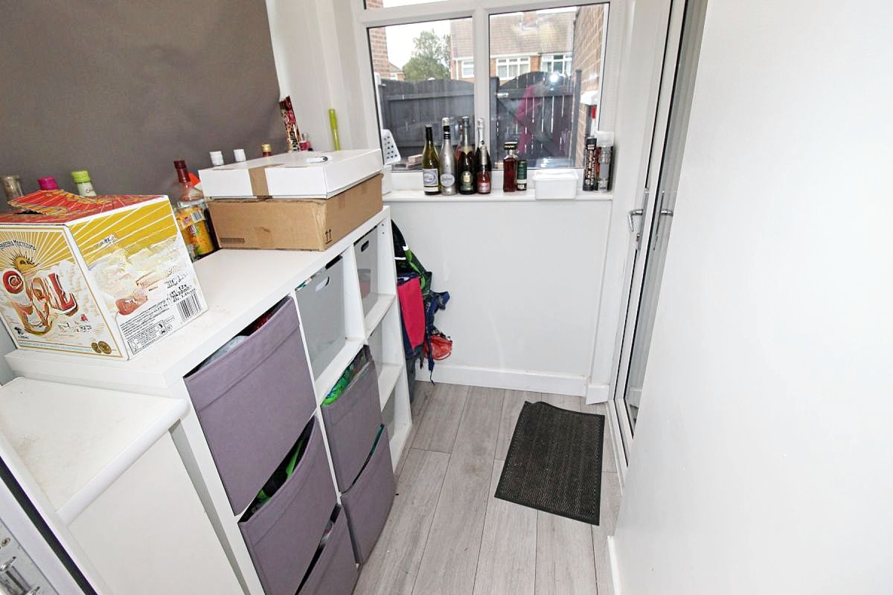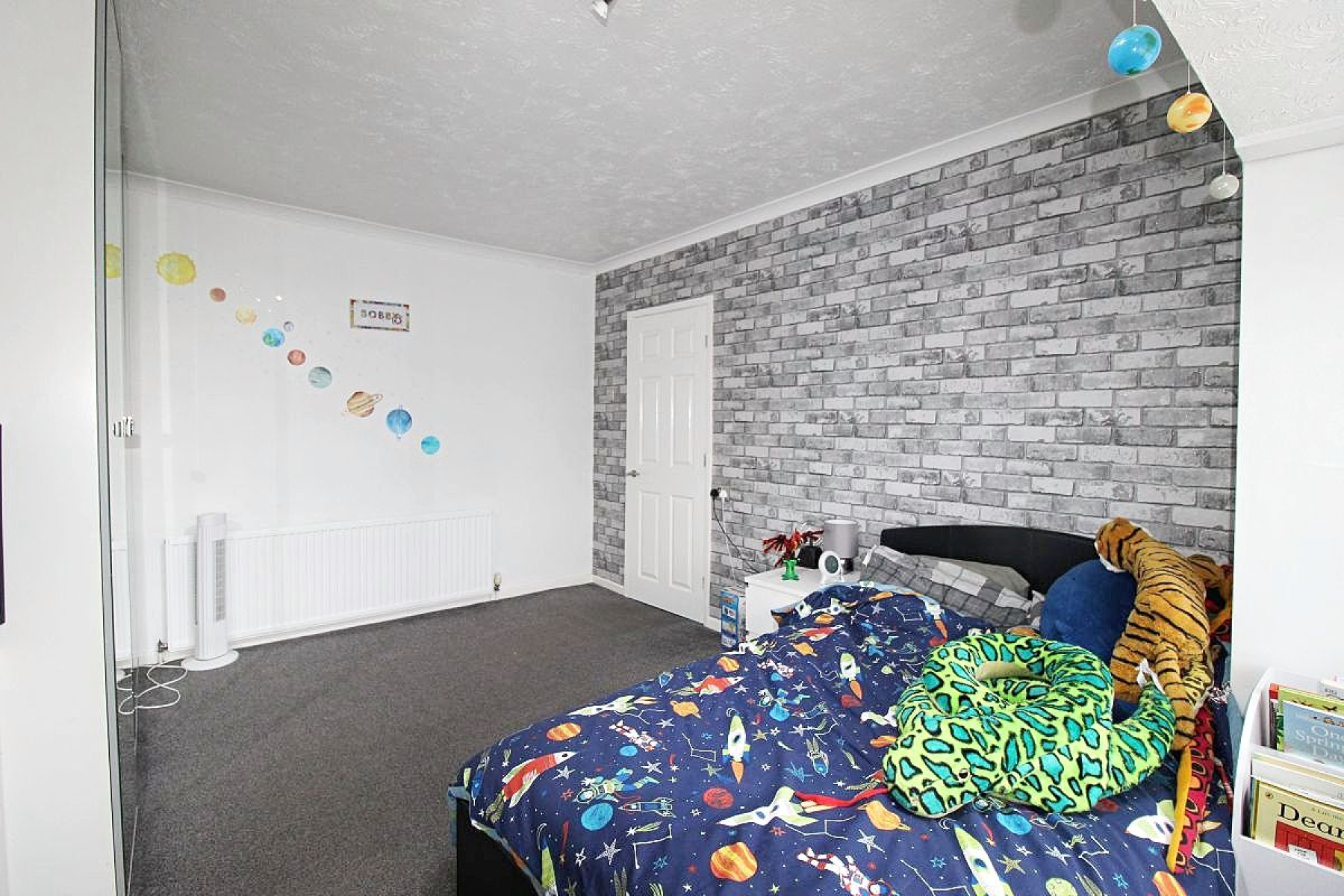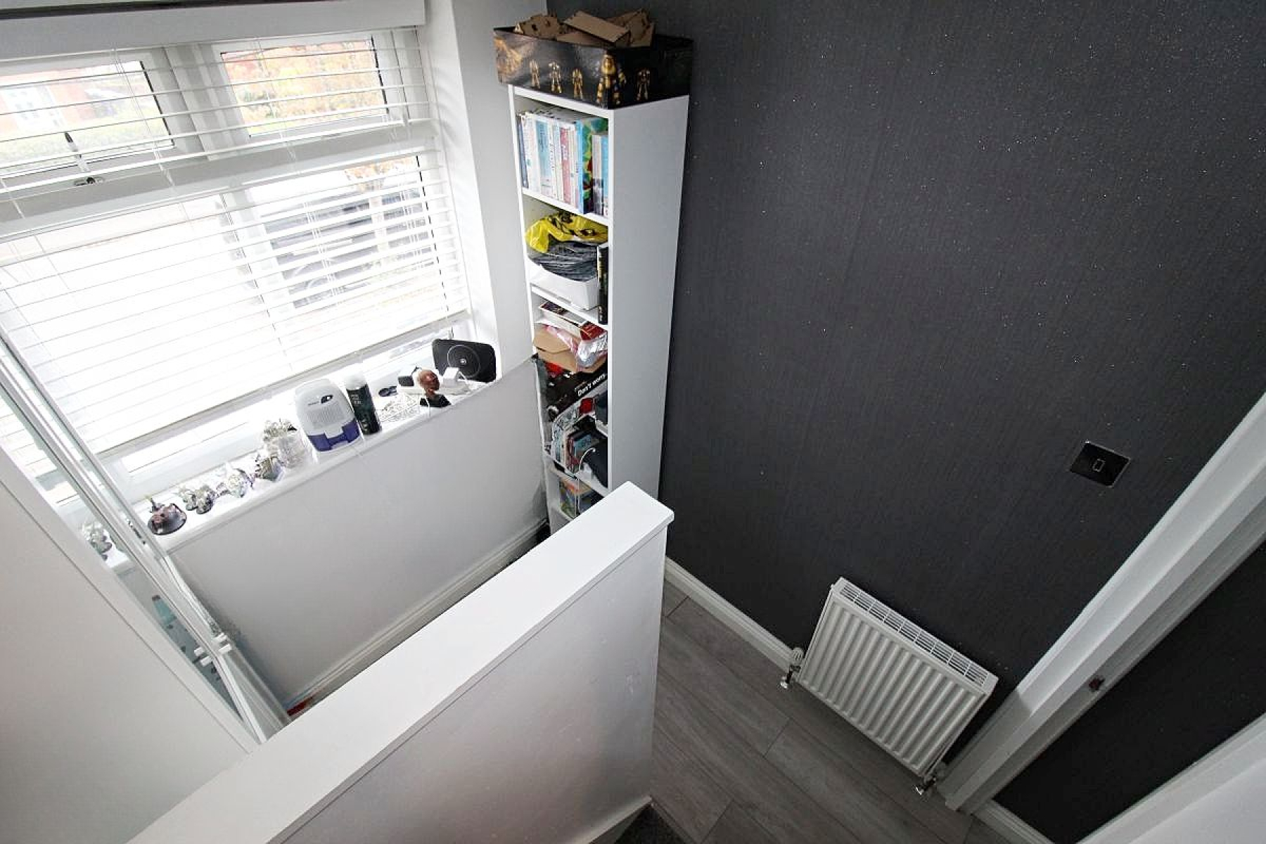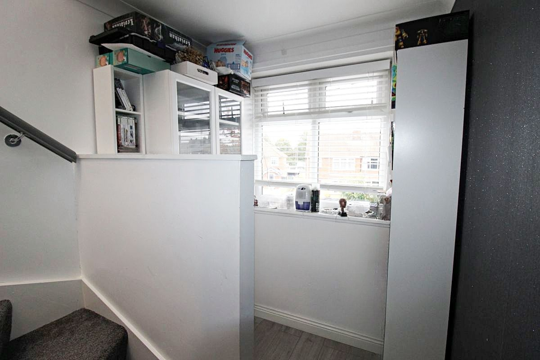 Currently used for storage, this versatile room offers excellent potential as a home office. It features a front-facing window allowing natural light, a fitted laminate flooring, and a radiator for year-round comfort. Carpeted stairs lead up to the second-floor bedroom.