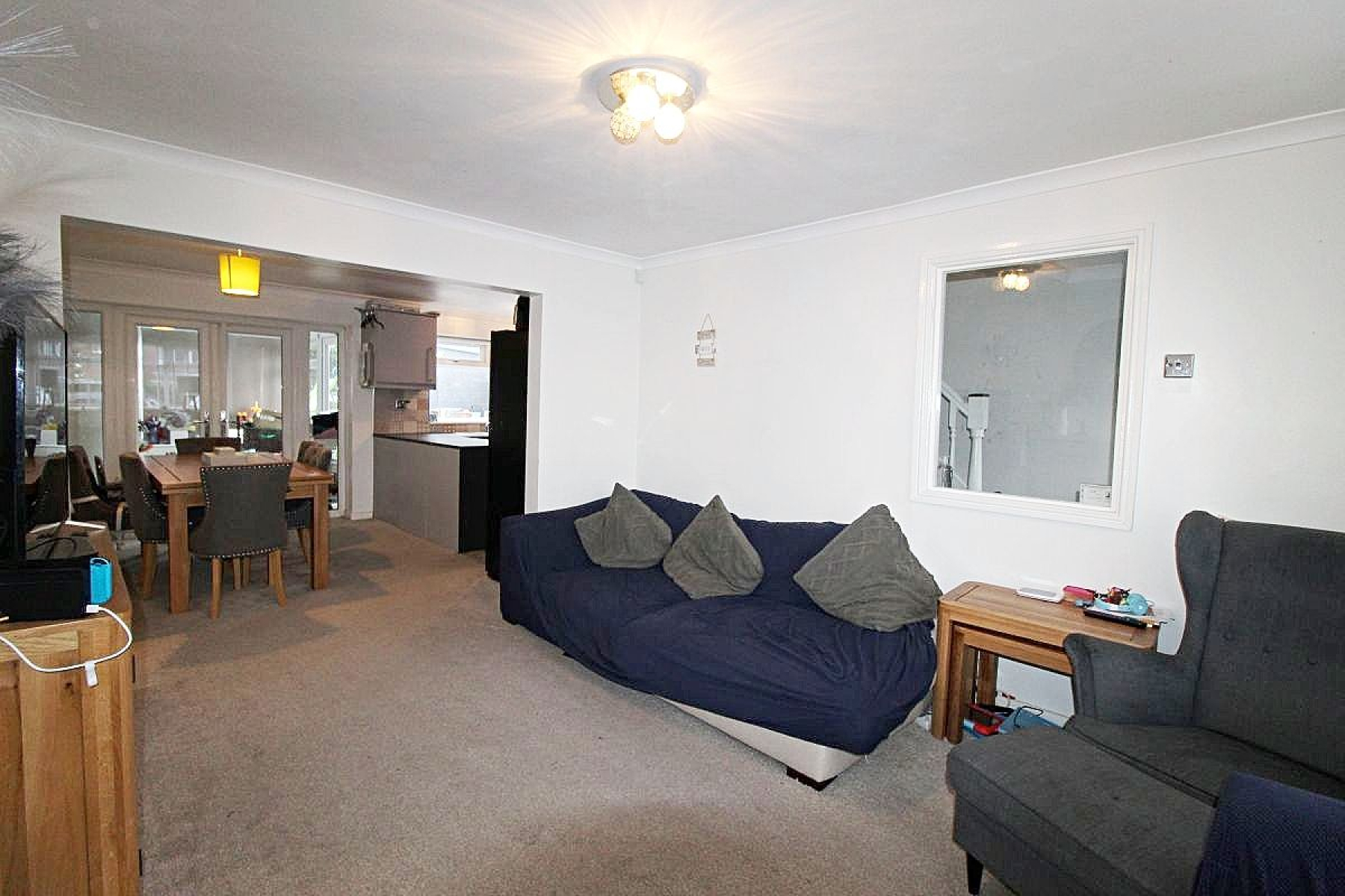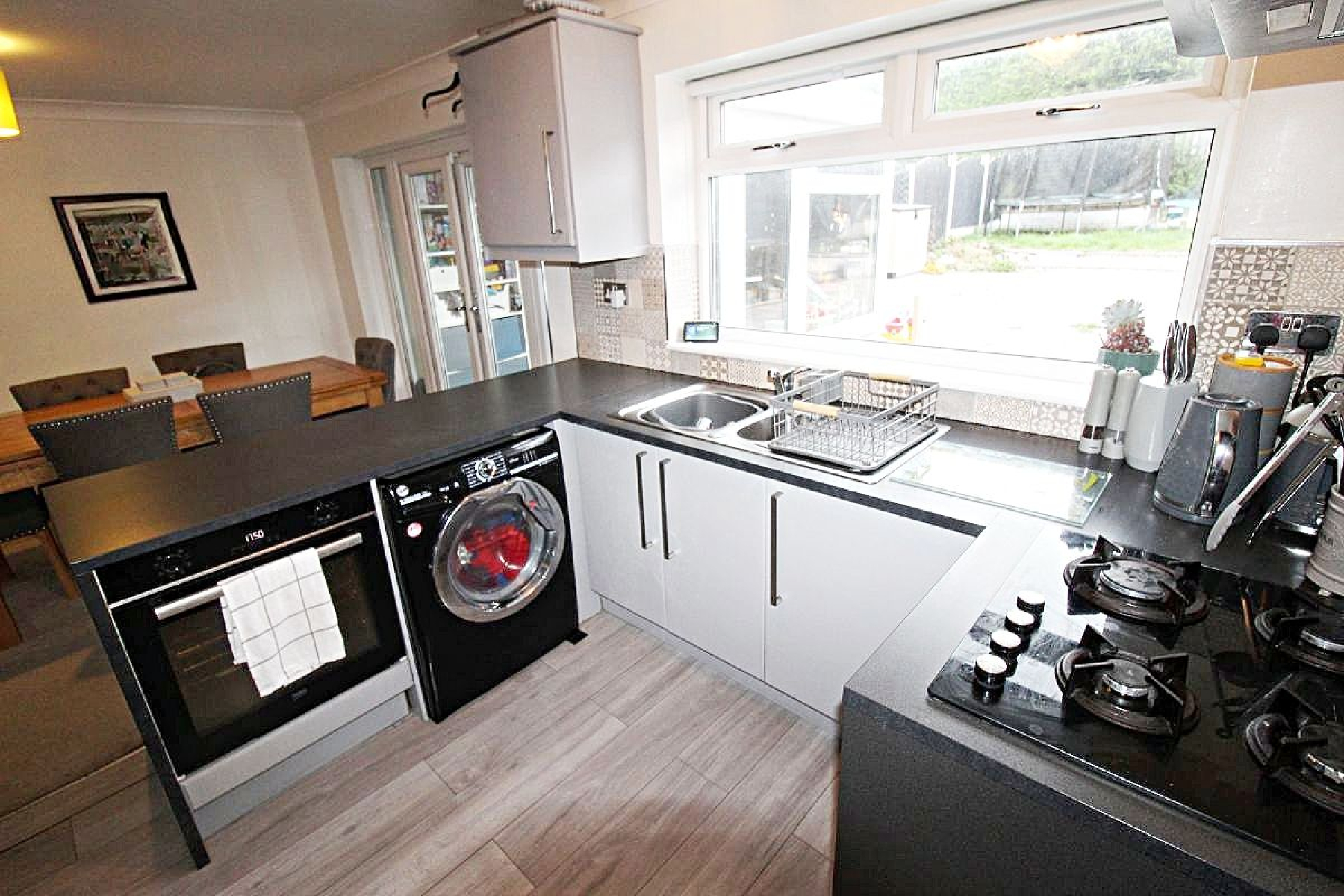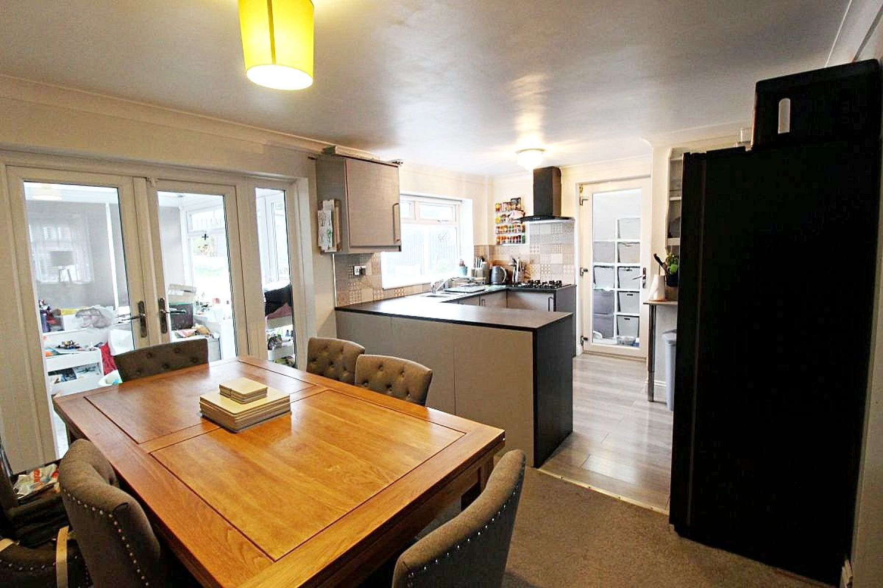 Fitted with wall and base units, worktops, and tiled splash backs. Gas hob with extractor above, electric oven, and space for appliances. Ample room for a dining table, rear-facing window, and French doors opening to the conservatory. Open-plan access to the lounge.