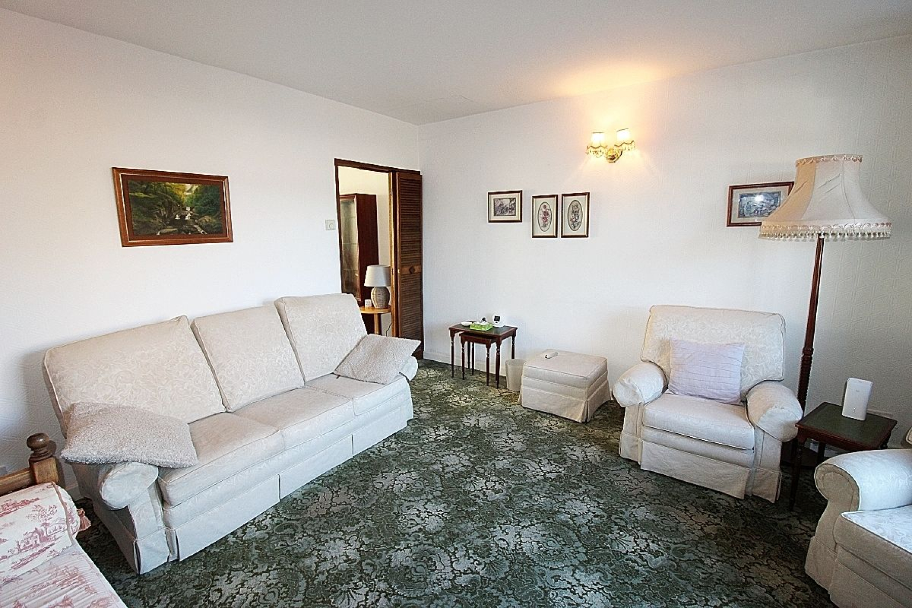 Comprising of a paneled bath with overhead shower and screen, a large vanity wash hand basin and a low level wc. Fully tiled walls with feature borders and complementary carpeted flooring, radiator and rear and side facing upvc windows.