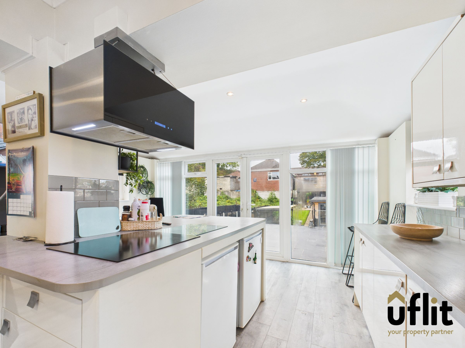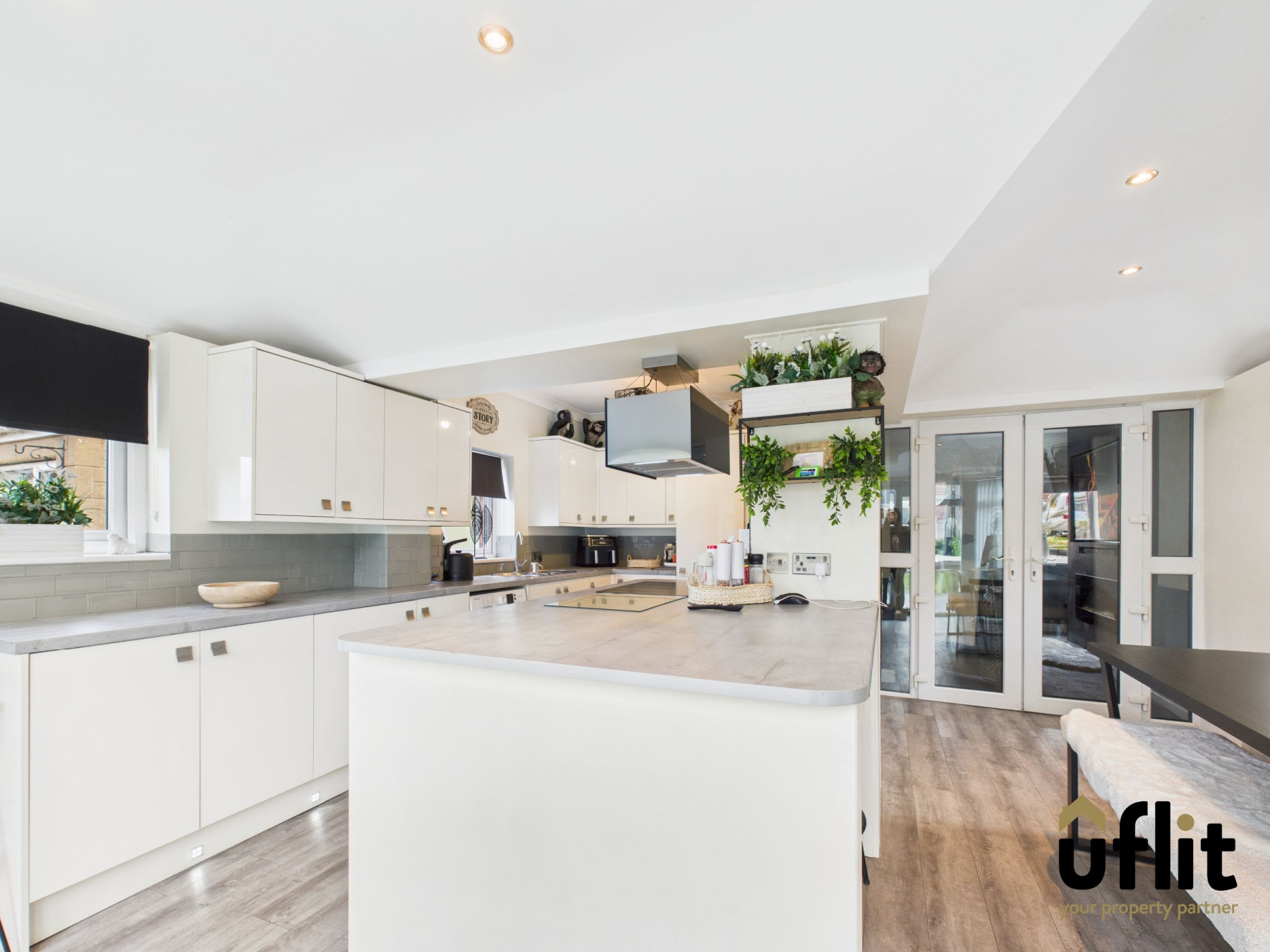 A beautifully appointed kitchen with a range of cream high-gloss wall and base units, laminate worktops, built-in oven and microwave, induction hob with extractor, integrated wine rack, and inset sink with drainer. A central island provides additional workspace and seating. Tiled splashbacks, LVT flooring and spotlights complete the space. Bright and airy with multiple side-facing windows and double doors with side panels opening out to the garden.