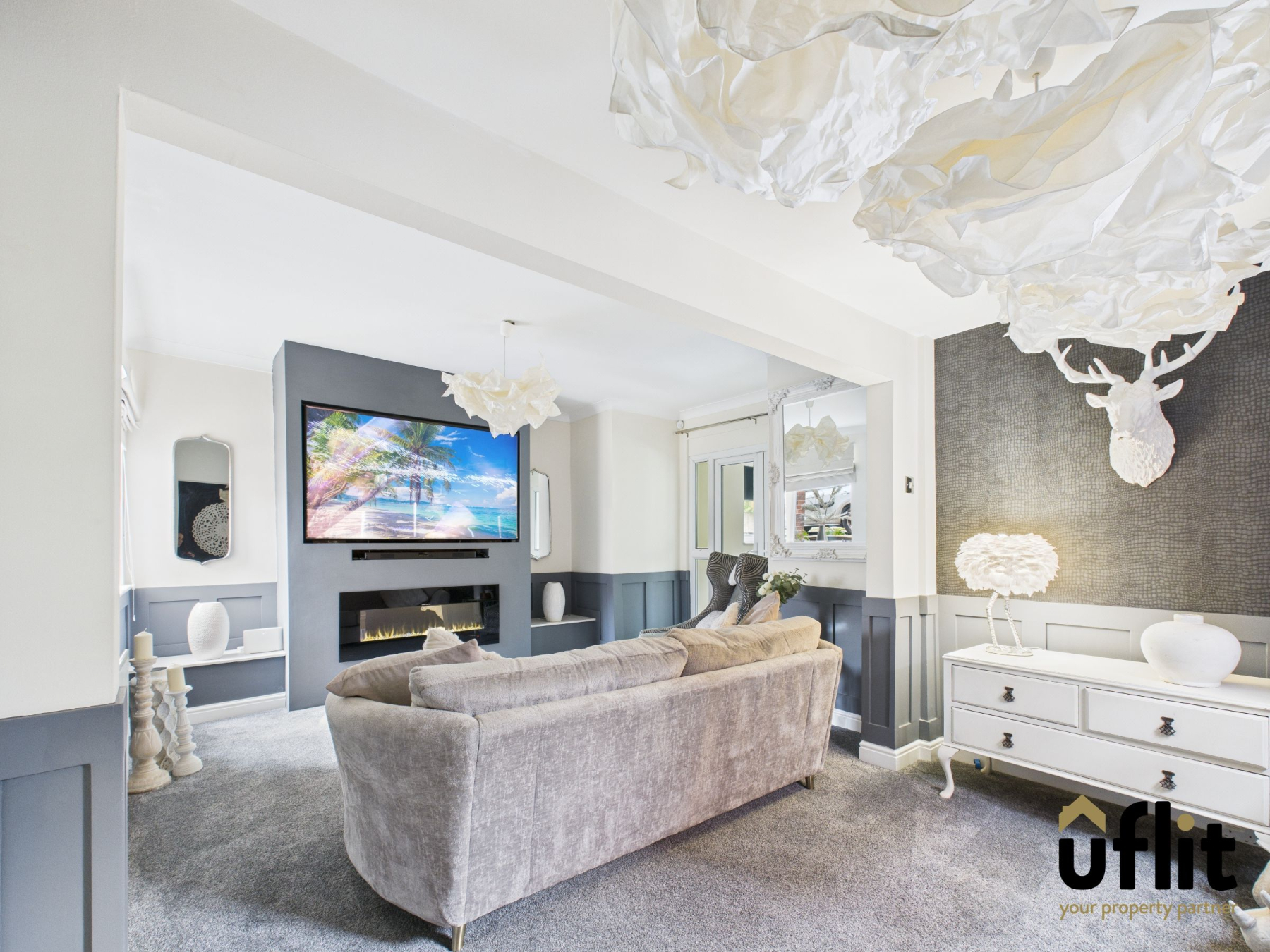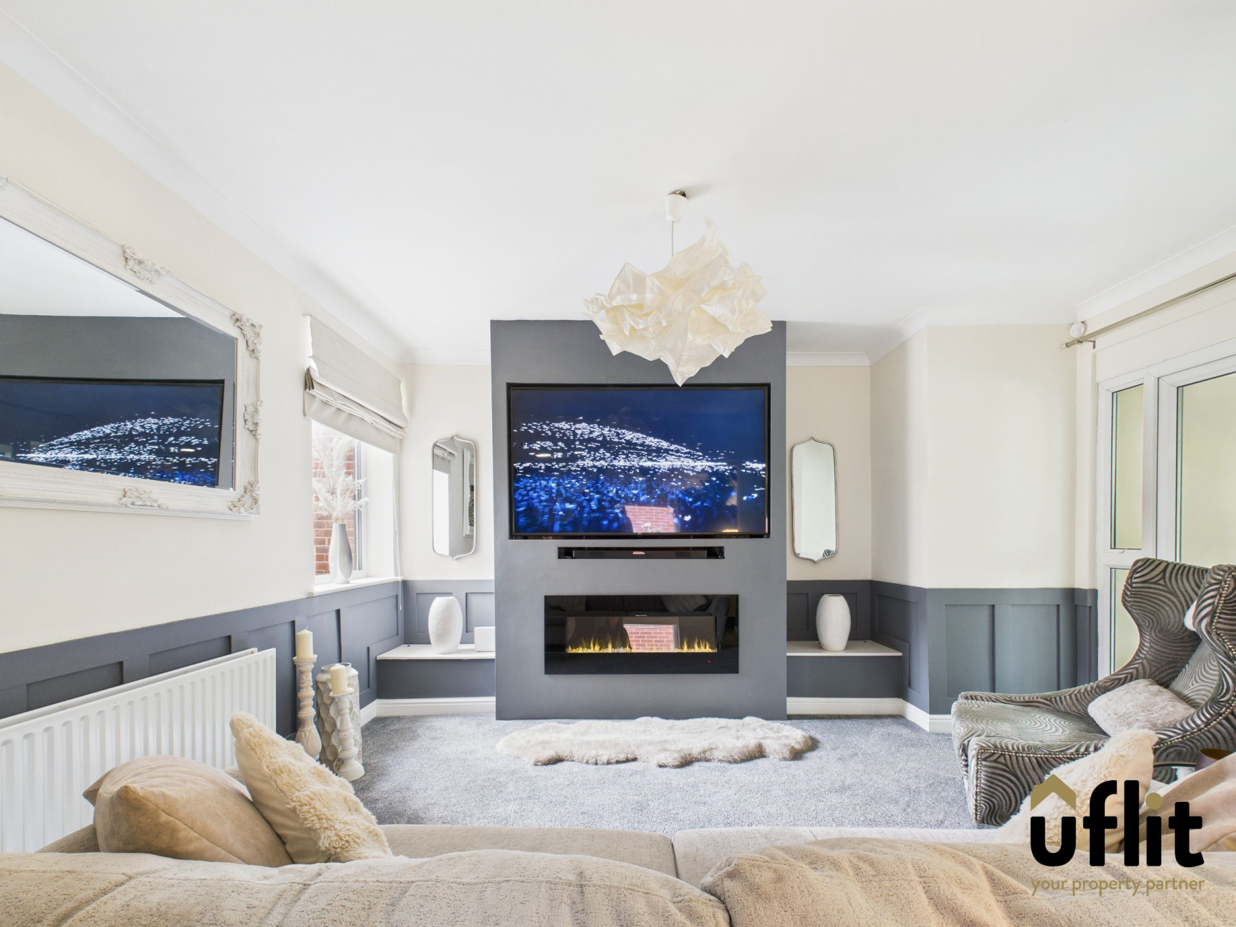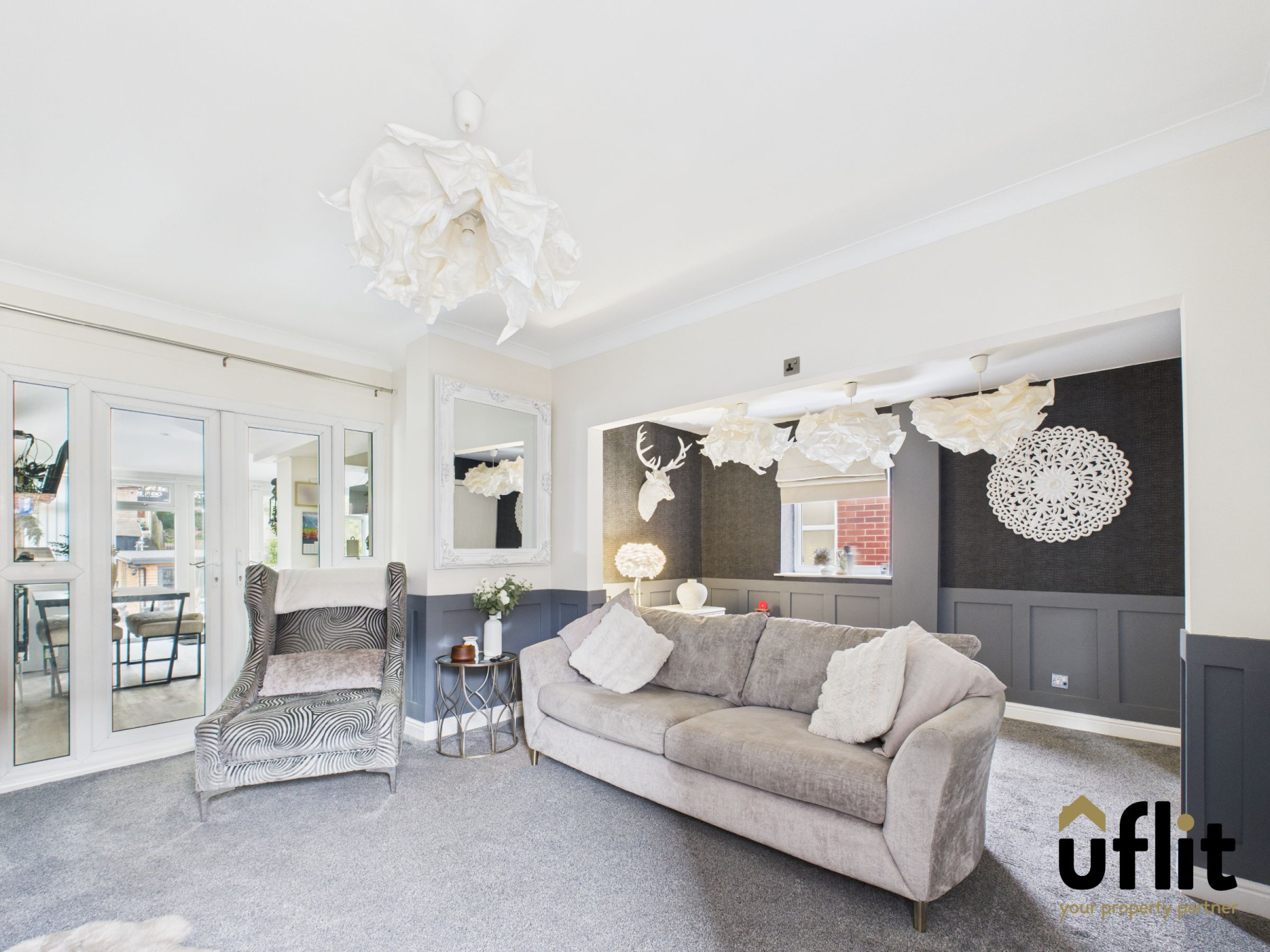A spacious living area boasting stylish wall panelling, coving, and feature wallpaper. Natural light pours in from the front and side-facing windows. Finished with fitted carpet and radiator. Doors lead into the kitchen.