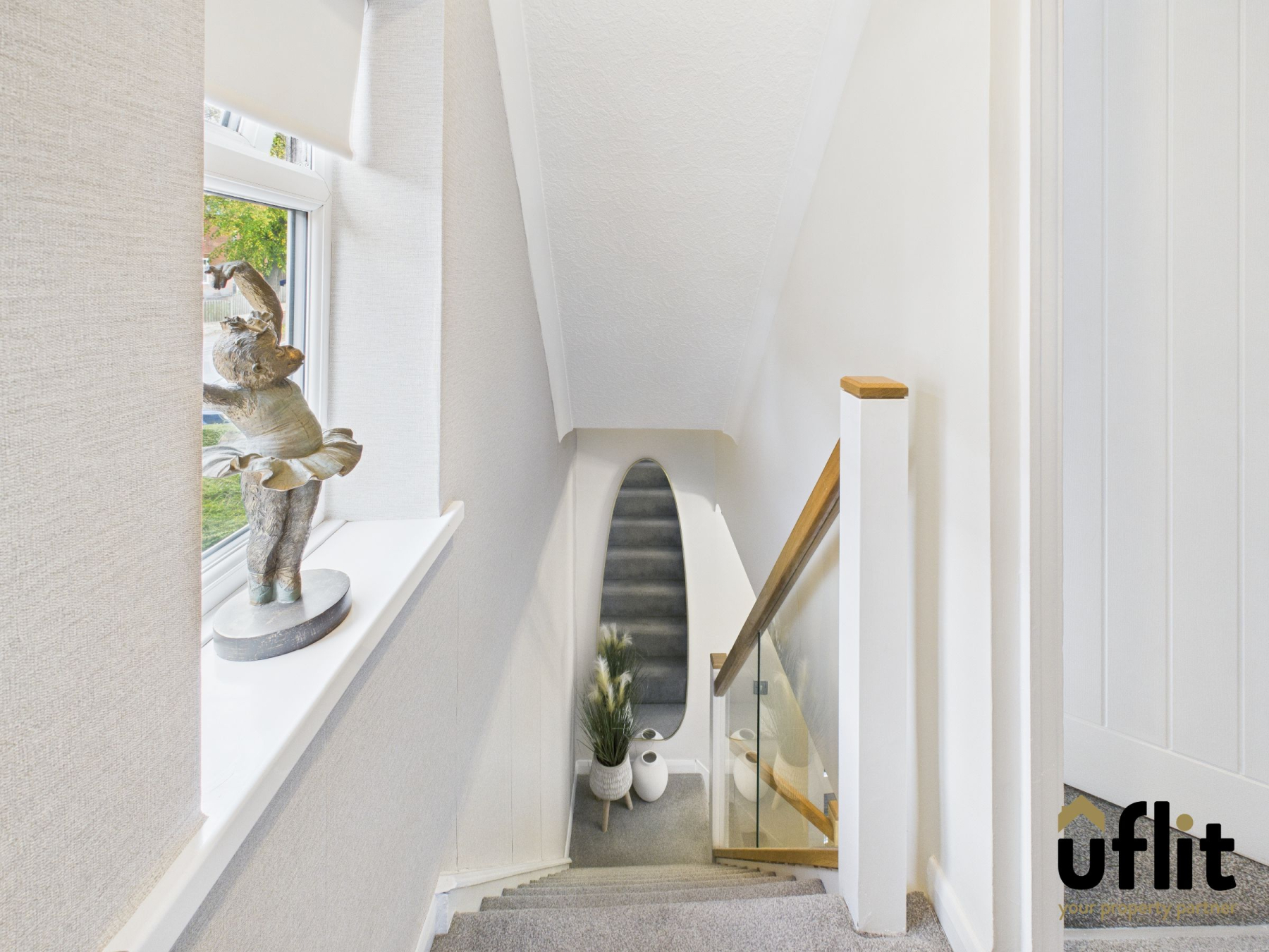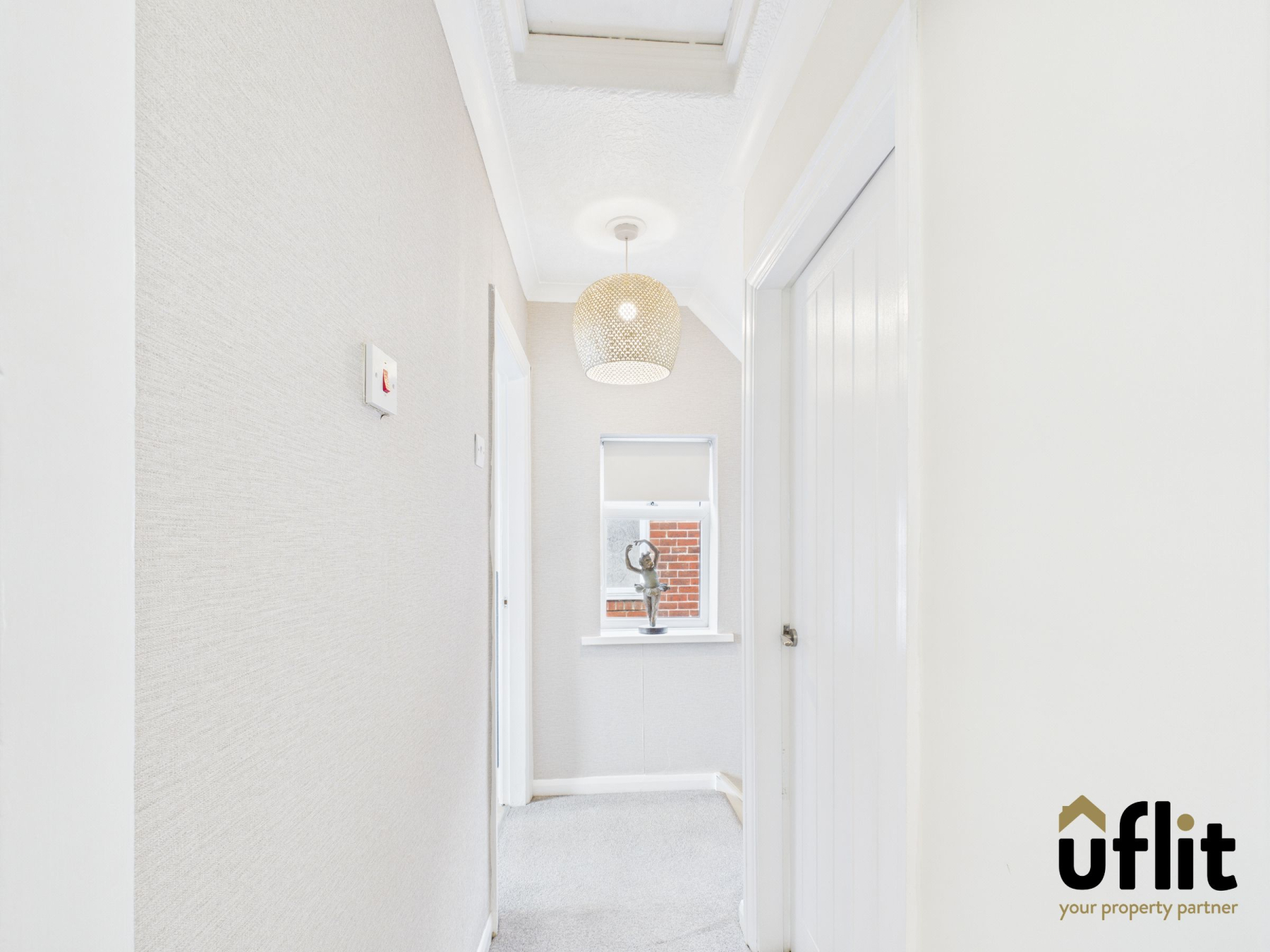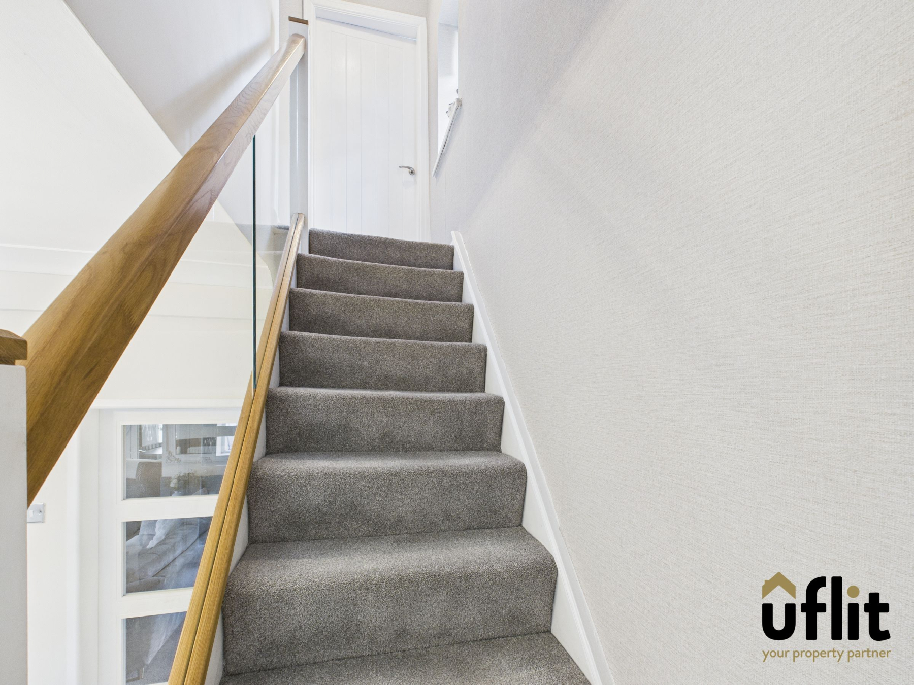 Carpeted stairs lead to the first-floor landing, with a side-facing window providing natural light. Access to both bedrooms and the family bathroom.