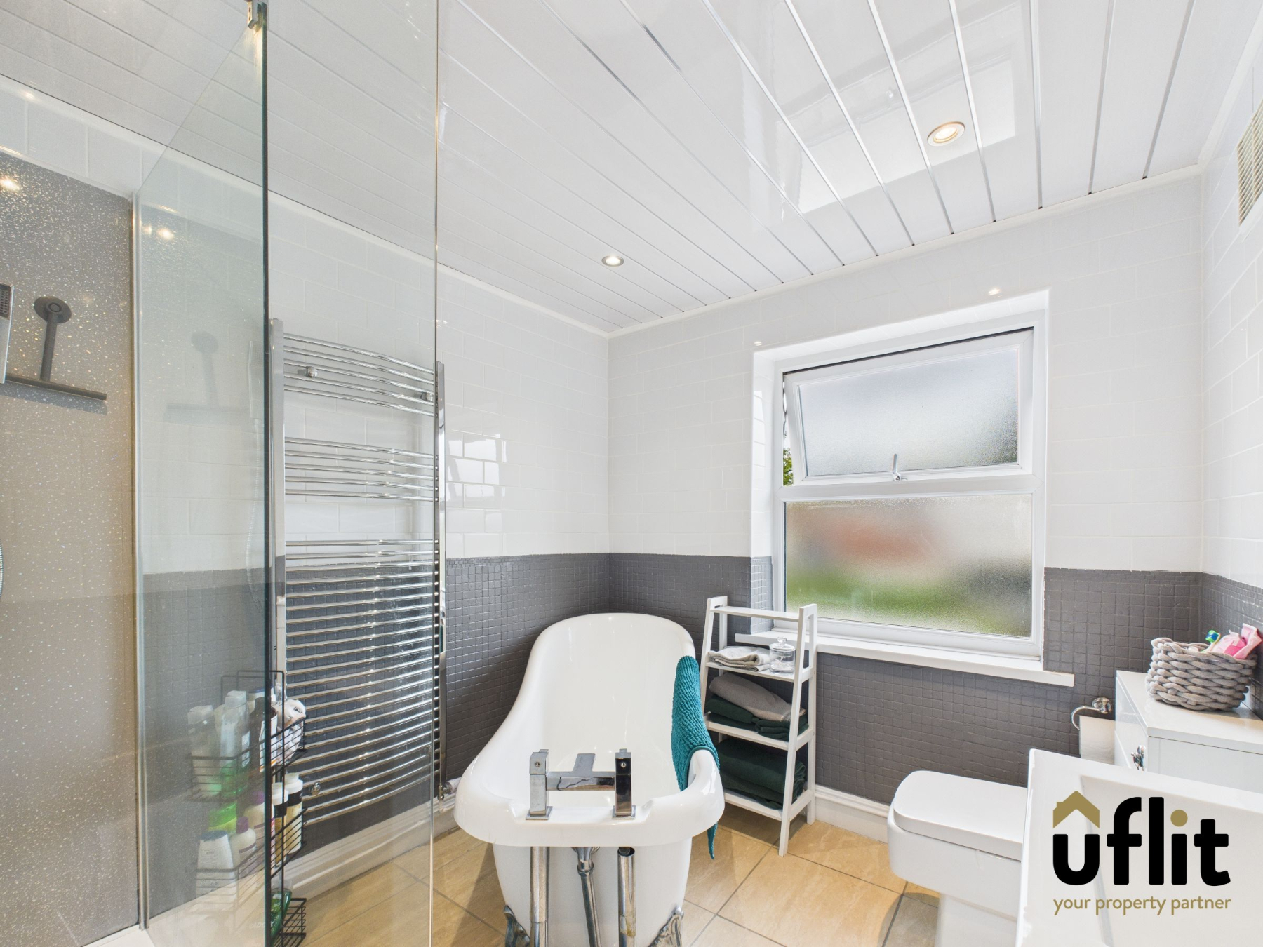 A luxury four-piece suite comprising a freestanding bathtub, vanity wash hand basin, low-level WC and a large walk-in shower with dual rainfall heads, aqua panel surround and spot lighting. Fully tiled walls, tiled flooring, a rear-facing window and a chrome towel radiator complete this contemporary space.