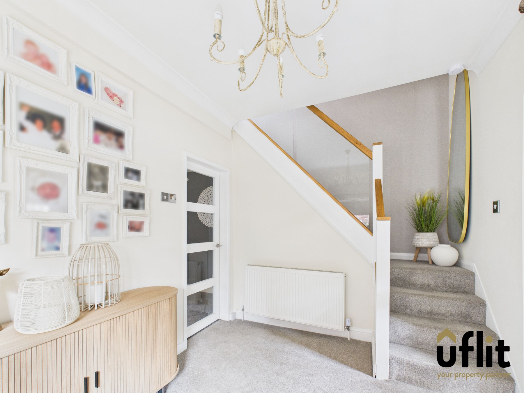 A spacious hallway that could easily be used as a second reception room with side-facing window, fitted carpet and radiator. Stairs rise to the first floor with a stunning glass balustrade, adding a modern touch. A door leads to the inner hallway and living room.