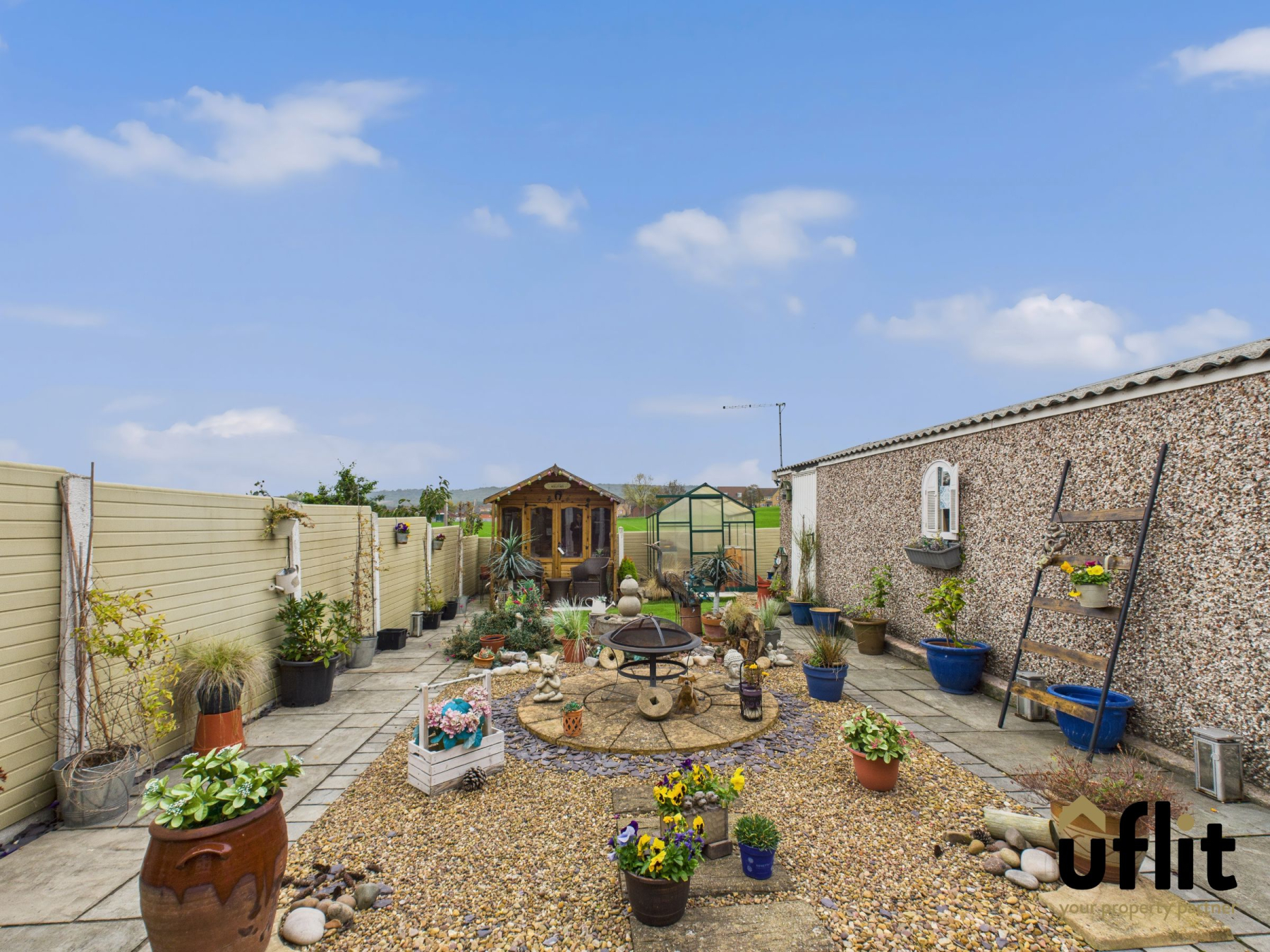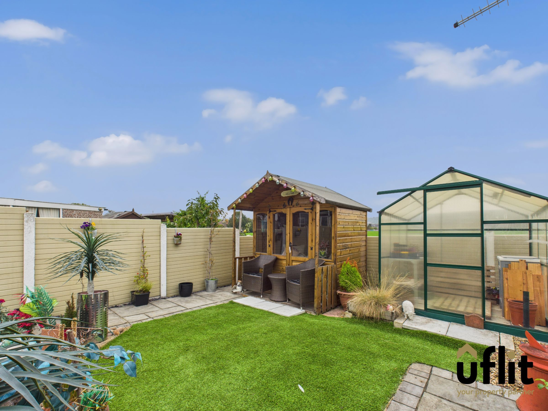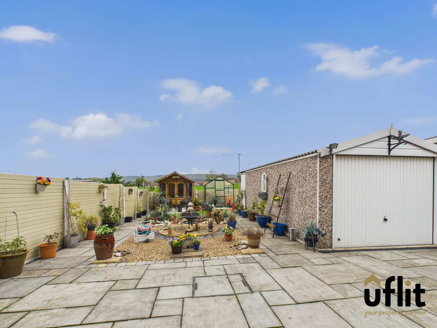 To the rear, a well-maintained and fully enclosed garden provides a private oasis, backing directly onto open fields, perfect for families or those who enjoy outdoor entertaining. The garden has been thoughtfully landscaped with a combination of paved slabs, decorative stone and Artificial lawn for low-maintenance enjoyment. Composite fencing offers privacy and a large detached garage provides superb external storage or potential workshop space. A side gate offers easy access between the front and rear of the property.