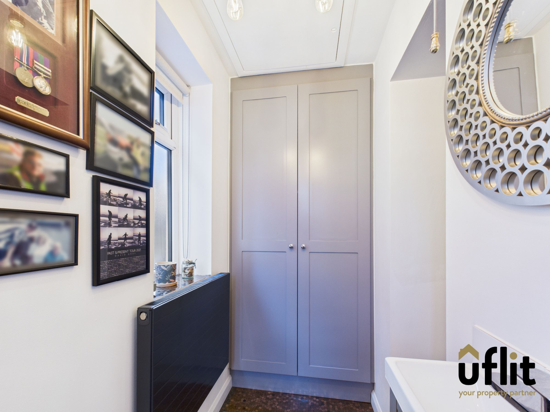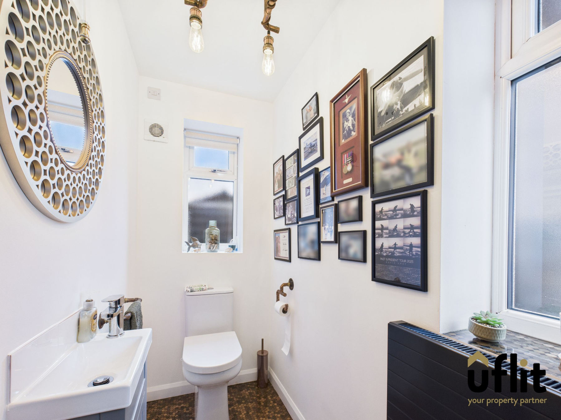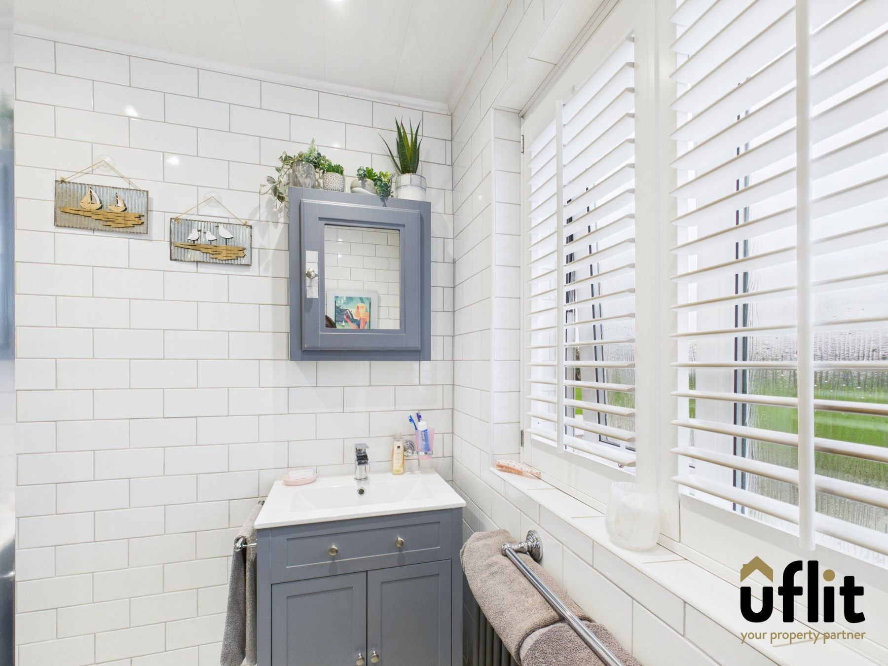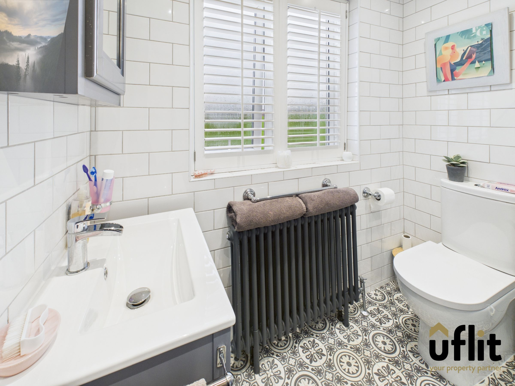 A bright and functional space with both a side and rear-facing window allowing for natural light. This room benefits from a radiator, a low-level WC, a basin with a vanity unit for additional storage and a loft hatch above. A built-in storage cupboard provides practicality for household essentials.