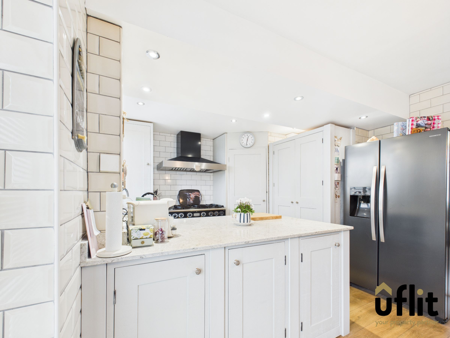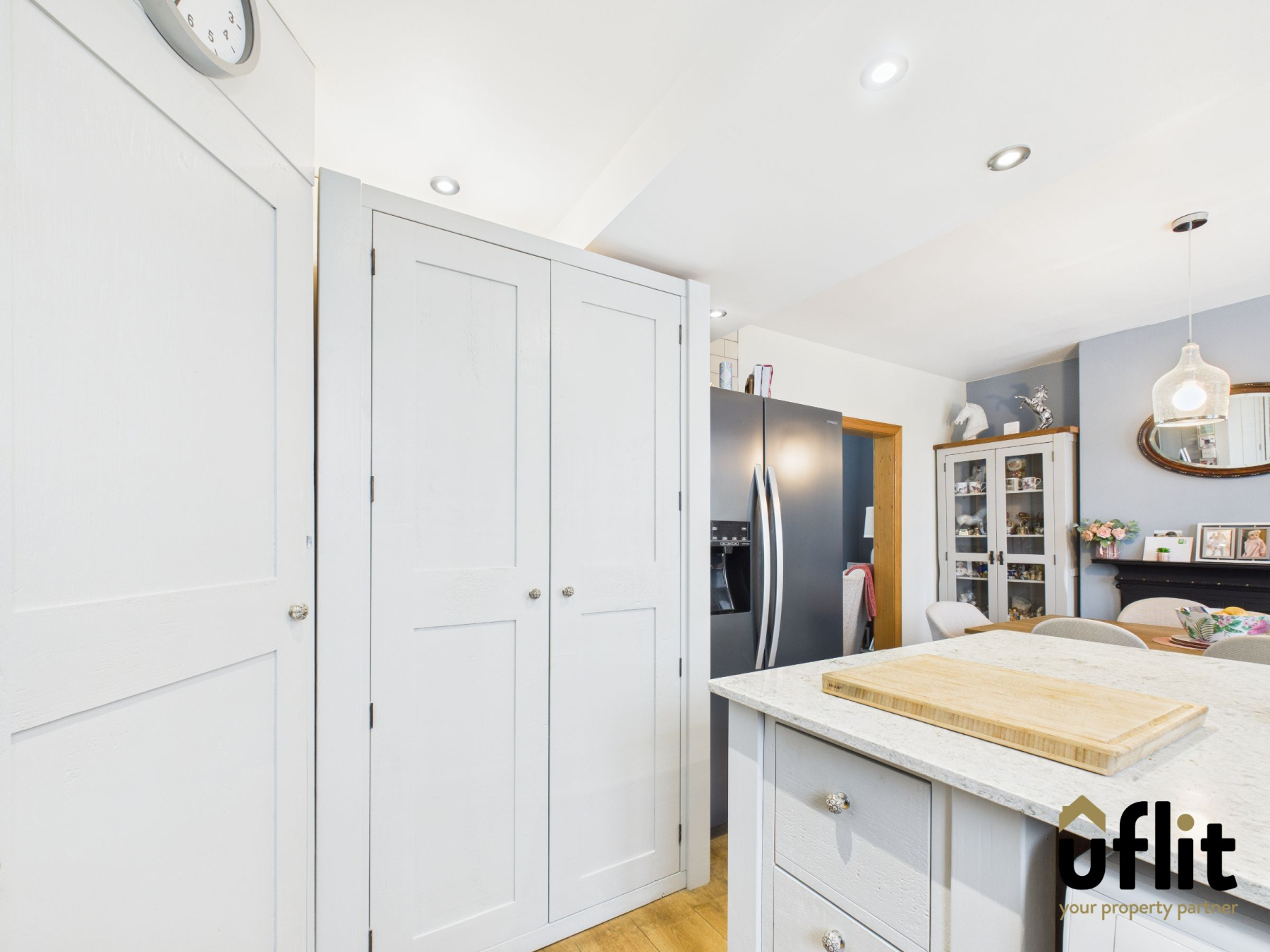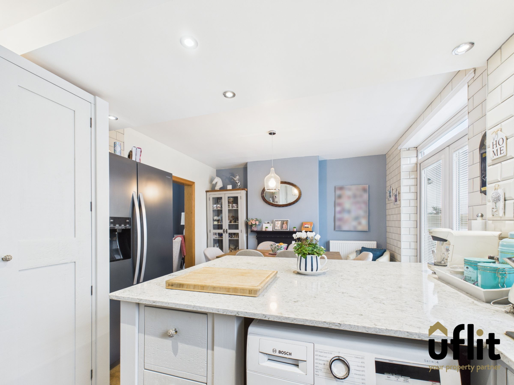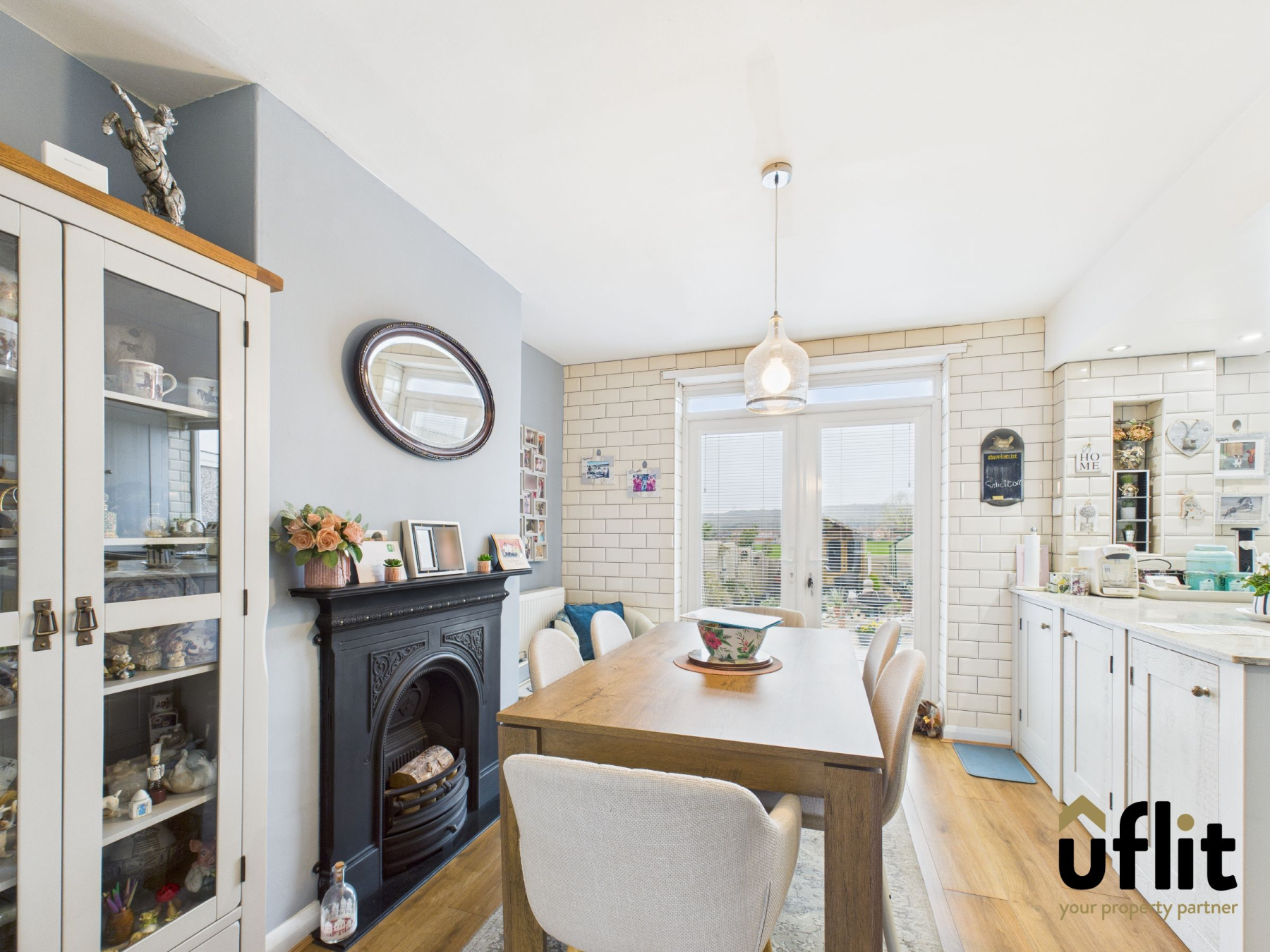To the rear of the home is a stunning open-plan kitchen and dining area, combining practicality with bespoke design. The dining area offers space for a family table and features French doors that open onto the rear garden, inviting in natural light and offering a seamless transition to outdoor living. A decorative fireplace front adds charm to the dining space, while a radiator ensures year-round comfort.