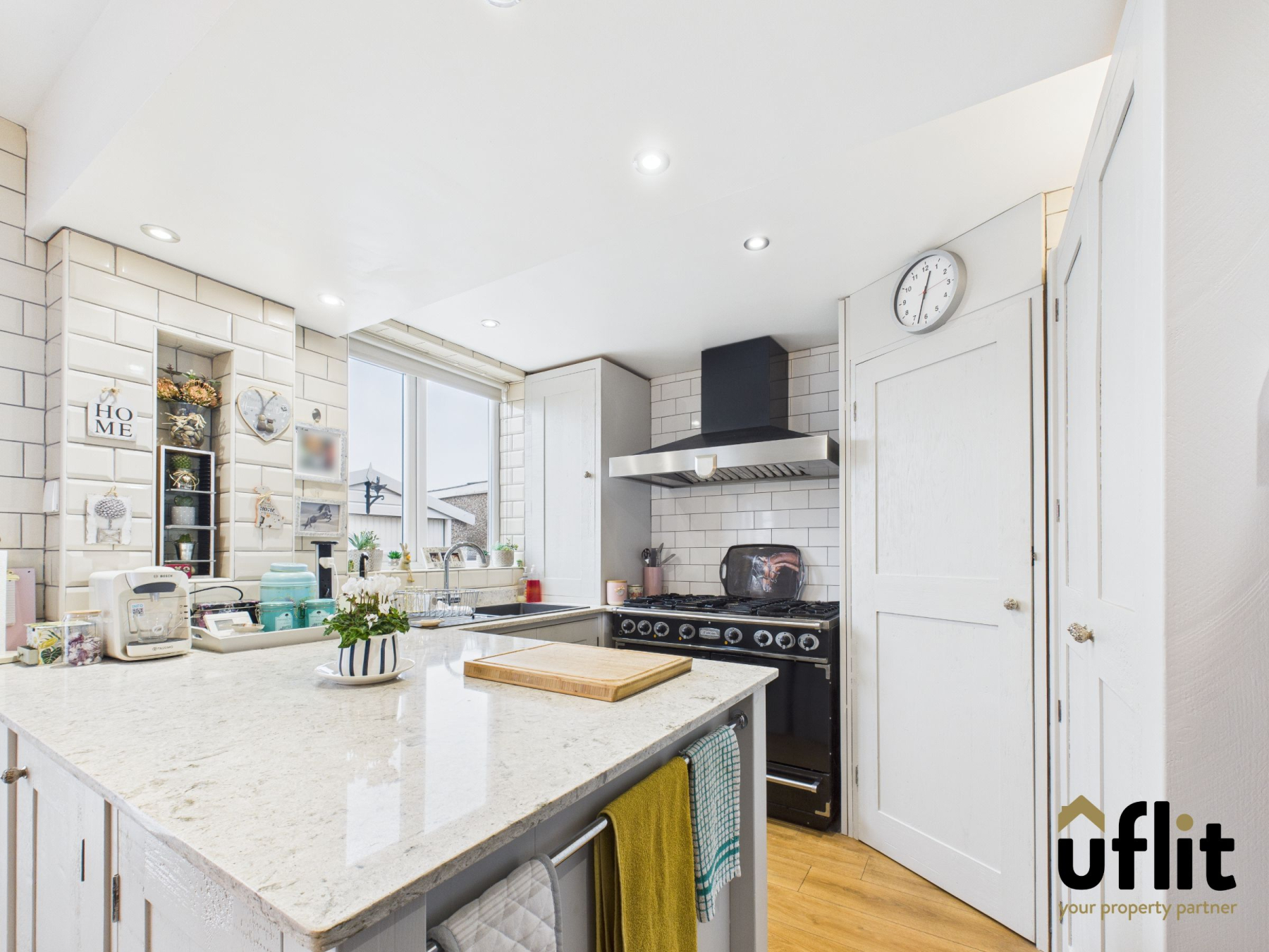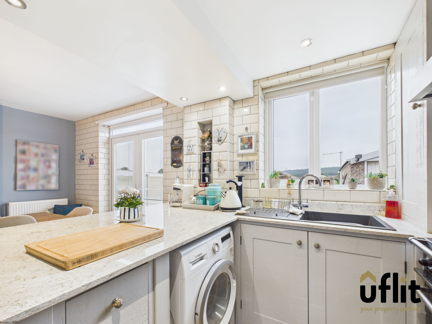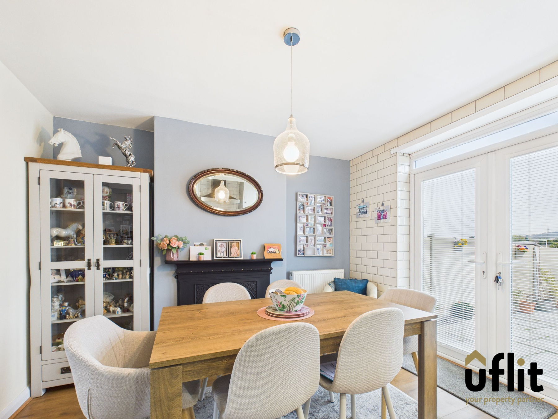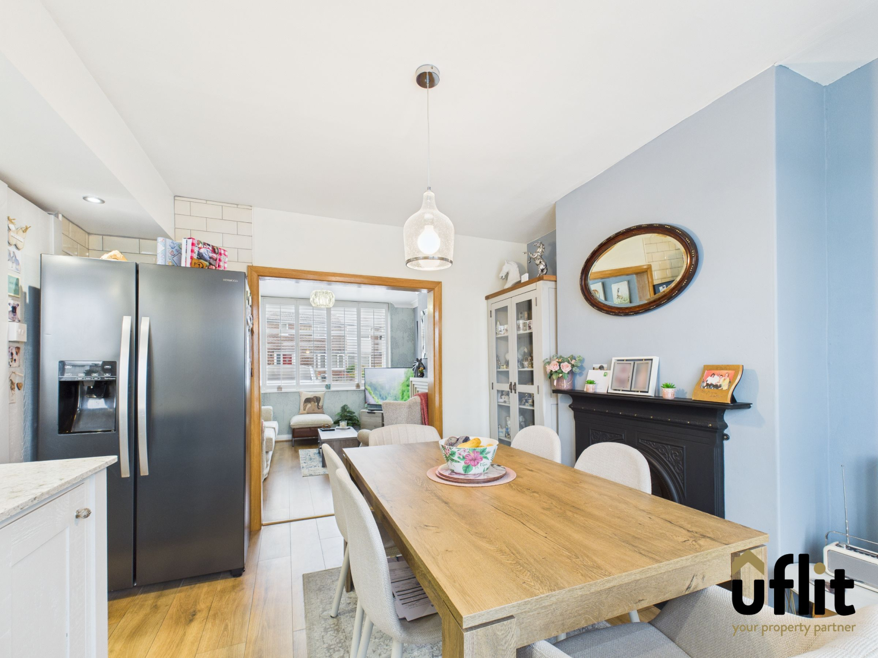 To the rear of the home is a stunning open-plan kitchen and dining area, combining practicality with bespoke design. The dining area offers space for a family table and features French doors that open onto the rear garden, inviting in natural light and offering a seamless transition to outdoor living. A decorative fireplace front adds charm to the dining space, while a radiator ensures year-round comfort.